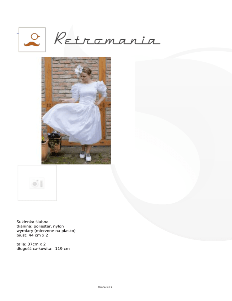 Sukienka ślubna tkanina: poliester, nylon wymiary (mierzone na płasko) biust: 44 cm x 2 talia: 37cm x 2 długość całkowita: 119 cm Strona 1 z 1