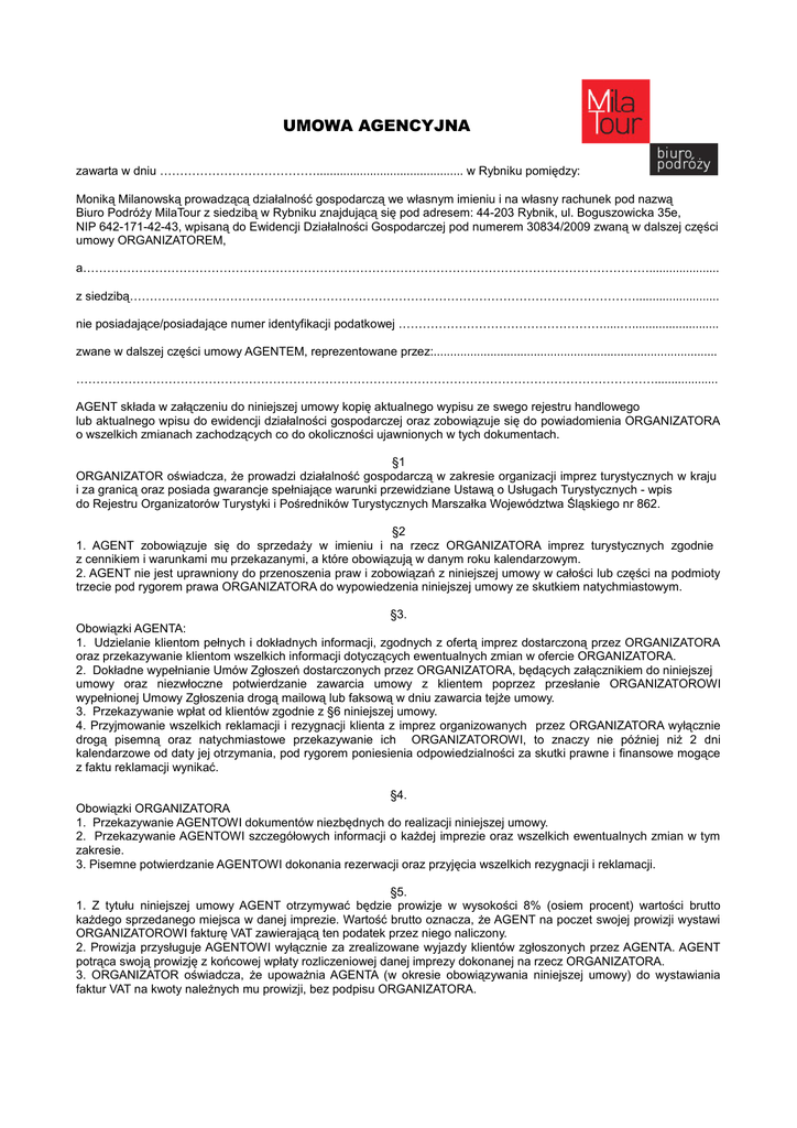 UMOWA AGENCYJNA zawarta w dniu …………………………………............................................ w Rybniku pomiędzy: Moniką Milanowską prowadzącą działalność gospodarczą we własnym imieniu i na własny rachunek pod nazwą Biuro Podróży MilaTour z siedzibą w Rybniku znajdującą się pod adresem: 44-203 Rybnik, ul. Boguszowicka 35e, NIP 642-171-42-43, wpisaną do Ewidencji Działalności Gospodarczej pod numerem 30834/2009 zwaną w dalszej części umowy ORGANIZATOREM, a……………………………………………………………………………………………………………………………..................... z siedzibą………………………………………………………………………………………………………………......................... nie posiadające/posiadające numer identyfikacji podatkowej …………………………………………….....….......................... zwane w dalszej części umowy AGENTEM, reprezentowane przez:..................................................................................... ………………………………………………………………………………………………………………………………................... AGENT składa w załączeniu do niniejszej umowy kopię aktualnego wypisu ze swego rejestru handlowego lub aktualnego wpisu do ewidencji działalności gospodarczej oraz zobowiązuje się do powiadomienia ORGANIZATORA o wszelkich zmianach zachodzących co do okoliczności ujawnionych w tych dokumentach. §1 ORGANIZATOR oświadcza, że prowadzi działalność gospodarczą w zakresie organizacji imprez turystycznych w kraju i za granicą oraz posiada gwarancje spełniające warunki przewidziane Ustawą o Usługach Turystycznych - wpis do Rejestru Organizatorów Turystyki i Pośredników Turystycznych Marszałka Województwa Śląskiego nr 862. §2 1. AGENT zobowiązuje się do sprzedaży w imieniu i na rzecz ORGANIZATORA imprez turystycznych zgodnie z cennikiem i warunkami mu przekazanymi, a które obowiązują w danym roku kalendarzowym. 2. AGENT nie jest uprawniony do przenoszenia praw i zobowiązań z niniejszej umowy w całości lub części na podmioty trzecie pod rygorem prawa ORGANIZATORA do wypowiedzenia niniejszej umowy ze skutkiem natychmiastowym. §3. Obowiązki AGENTA: 1. Udzielanie klientom pełnych i dokładnych informacji, zgodnych z ofertą imprez dostarczoną przez ORGANIZATORA oraz przekazywanie klientom wszelkich informacji dotyczących ewentualnych zmian w ofercie ORGANIZATORA. 2. Dokładne wypełnianie Umów Zgłoszeń dostarczonych przez ORGANIZATORA, będących załącznikiem do niniejszej umowy oraz niezwłoczne potwierdzanie zawarcia umowy z klientem poprzez przesłanie ORGANIZATOROWI wypełnionej Umowy Zgłoszenia drogą mailową lub faksową w dniu zawarcia tejże umowy. 3. Przekazywanie wpłat od klientów zgodnie z §6 niniejszej umowy. 4. Przyjmowanie wszelkich reklamacji i rezygnacji klienta z imprez organizowanych przez ORGANIZATORA wyłącznie drogą pisemną oraz natychmiastowe przekazywanie ich ORGANIZATOROWI, to znaczy nie później niż 2 dni kalendarzowe od daty jej otrzymania, pod rygorem poniesienia odpowiedzialności za skutki prawne i finansowe mogące z faktu reklamacji wynikać. §4. Obowiązki ORGANIZATORA 1. Przekazywanie AGENTOWI dokumentów niezbędnych do realizacji niniejszej umowy. 2. Przekazywanie AGENTOWI szczegółowych informacji o każdej imprezie oraz wszelkich ewentualnych zmian w tym zakresie. 3. Pisemne potwierdzanie AGENTOWI dokonania rezerwacji oraz przyjęcia wszelkich rezygnacji i reklamacji. §5. 1. Z tytułu niniejszej umowy AGENT otrzymywać będzie prowizje w wysokości 8% (osiem procent) wartości brutto każdego sprzedanego miejsca w danej imprezie. Wartość brutto oznacza, że AGENT na poczet swojej prowizji wystawi ORGANIZATOROWI fakturę VAT zawierającą ten podatek przez niego naliczony. 2. Prowizja przysługuje AGENTOWI wyłącznie za zrealizowane wyjazdy klientów zgłoszonych przez AGENTA. AGENT potrąca swoją prowizję z końcowej wpłaty rozliczeniowej danej imprezy dokonanej na rzecz ORGANIZATORA. 3. ORGANIZATOR oświadcza, że upoważnia AGENTA (w okresie obowiązywania niniejszej umowy) do wystawiania faktur VAT na kwoty należnych mu prowizji, bez podpisu ORGANIZATORA. §6. 1. AGENT zobowiązuje się do wpłaty na rzecz ORGANIZATORA zaliczki pobranej od klienta, w wysokości 30% ceny imprezy w terminie do 2 dni od daty podpisania przez klienta Umowy-Zgłoszenia lub całej ceny imprezy w przypadku, kiedy Umowa-Zgłoszenie została podpisana w terminie krótszym niż 21 dni od planowanej daty rozpoczęcia realizacji danej imprezy. 2. ORGANIZATOR ma prawo anulować Umowę-Zgłoszenie w przypadku braku wpłaty zaliczki lub braku wpłaty całej ceny imprezy w terminie krótszym niż 21 dni przed realizacją imprezy. W takiej sytuacji niezwłocznie powiadamia o tym fakcie AGENTA oraz klienta drogą mailową lub faksem. 3. Za dzień dokonania wpłaty uważa się dzień wpłaty na konto ORGANIZATORA lub dzień wpłaty gotówki w kasie ORGANIZATORA. 4. AGENT zobowiązuje się realizować wszelkie należności gotówką w kasie ORGANIZATORA lub przelewem na konto ORGANIZATORA prowadzone w: Bank Spółdzielczy w Jastrzębiu Zdroju 41 8470 0001 2001 0059 6978 0001 W razie opóźnienia w zapłacie należności o której mowa &6 punkt 1 ORGANIZATOROWI należą się odsetki ustawowe. §7. 1. Niniejsza umowa zostaje zawarta na czas nieokreślony. 2. Każda ze stron ma prawo rozwiązać umowę za uprzednim 30 -dniowym pisemnym wypowiedzeniem dokonanym ze skutkiem na koniec miesiąca kalendarzowego. W przypadku uchybienia przez AGENTA postanowieniom niniejszej umowy ORGANIZATOR uprawniony jest do rozwiązania niniejszej umowy bez zachowania okresu wypowiedzenia (w trybie natychmiastowym). 3. W sprawach nie uregulowanych umową mają zastosowanie przepisy Kode