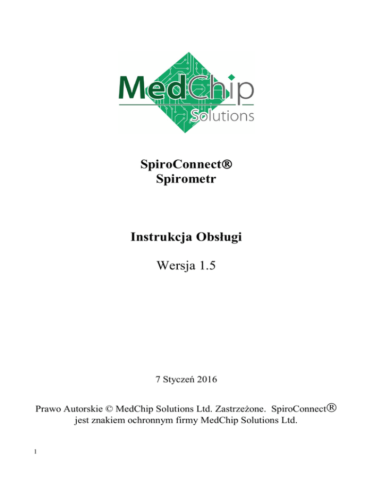 SpiroConnect Spirometr Instrukcja Obsługi Wersja 1.5 7 Styczeń 2016 Prawo Autorskie © MedChip Solutions Ltd. Zastrzeżone. SpiroConnect jest znakiem ochronnym firmy MedChip Solutions Ltd. 1 SpiroConnect Instrukcja Obslugi Spis treści 1 2 3 4 5 6 7 Wstęp ..................................................................................................................................................... 3 Sklad Zestawu: ....................................................................................................................................... 4 Uwagi i ostrzeżenia: ............................................................................................................................... 5 Przeciwskazania: .................................................................................................................................... 5 Przeznaczenie Urządzenia: ..................................................................................................................... 6 Warunki Badań: ...................................................................................................................................... 6 Rozpoczęcie Pracy.................................................................................................................................. 7 7.1 Instalacja Oprogramowania SpiroConnect Data Manager .................................................................. 7 8 Obsługa .................................................................................................................................................. 8 8.1 Wybranie pacjenta: ............................................................................................................................. 8 8.2 Podłączenie Urządzenia: ..................................................................................................................... 8 8.3 Spirometria natężona: ......................................................................................................................... 8 8.4 Spirometria spoczynkowa: ................................................................................................................ 11 8.5 Przegląd wyników: ........................................................................................................................... 13 8.6 Generalne informacje do przeglądu wyników: ................................................................................. 14 8.7 Kalibracja: ........................................................................................................................................ 14 8.8 Ustawienia: ....................................................................................................................................... 15 8.9 Główny pasek menu: ........................................................................................................................ 16 8.10 Baza danych pacjenta: ...................................................................................................................... 16 9 Baterie: ................................................................................................................................................. 16 10 Dbanie o spirometr: .............................................................................................................................. 16 11 Czyszczenie .......................................................................................................................................... 17 12 Akcesoria.............................................................................................................................................. 17 13 Serwis: .................................................................................................................................................. 17 14 Gwarancja i Obciążenia: ....................................................................................................................... 18 15 Licencja na oprogramowanie ................................................................................................................ 18 16 Rozwiązywanie problemów.................................................................................................................. 19 17 Kompatybilność elektromagnetyczna (EMC) ....................................................................................... 20 18 Znaczenie symboli ................................................................................................................................ 23 19 Klasyfikacja .......................................................................................................................................... 23 20 Specyfikacja: ........................................................................................................................................ 23 MedChip Solutions Ltd. Page 2 of 25 001.105.POL Wersja 1.5 SpiroConnect Instrukcja Obslugi 1 Wstęp Dziękujemy za zakup urządzenia SpiroConnect firmy MedChip Solutions. Przed pierwszym włączeniem urządzenia należy zapoznać się z niniejszą instrukcją obsługi. Więcej informacji znajduje się na stronie: www.medchipsolutions.com. Spirometr SpiroConnect przesyła w czasie rzeczywistym dane wykresów przepływu i objętości, następnie parametry diagnostyczne do komputera przy pomocy oprogramowania SpiroConnect Data Manager przez połączenie Bluetooth. Spirometr jest mały, przenośny, lekki i zasilany na baterie. Spirometr działa na zasadzie czujnika turbinowego firmy MedChip Solutions. Turbina jest szczególnie stabilnym czujnikiem objętości, który mierzy wydech powietrza bezpośrednio przy B.T.P.S. (Temperatura Ciała i Ciśnienie Nasycone Para), unikając w ten sposób problemów związanych z poprawkami temperatury. Ten typ czujnika jest odporny na negatywne efekty kondensacji i temperatury, nie wymaga on także kalibracji przed ka