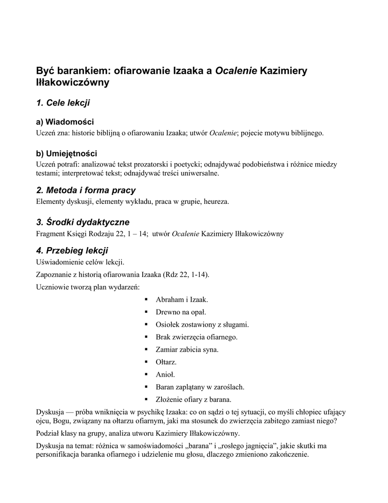 Być barankiem: ofiarowanie Izaaka a Ocalenie Kazimiery Iłłakowiczówny 1. Cele lekcji a) Wiadomości Uczeń zna: historie biblijną o ofiarowaniu Izaaka; utwór Ocalenie; pojecie motywu biblijnego. b) Umiejętności Uczeń potrafi: analizować tekst prozatorski i poetycki; odnajdywać podobieństwa i różnice miedzy testami; interpretować tekst; odnajdywać treści uniwersalne. 2. Metoda i forma pracy Elementy dyskusji, elementy wykładu, praca w grupie, heureza. 3. Środki dydaktyczne Fragment Księgi Rodzaju 22, 1 – 14; utwór Ocalenie Kazimiery Iłłakowiczówny 4. Przebieg lekcji Uświadomienie celów lekcji. Zapoznanie z historią ofiarowania Izaaka (Rdz 22, 1-14). Uczniowie tworzą plan wydarzeń: Abraham i Izaak. Drewno na opał. Osiołek zostawiony z sługami. Brak zwierzęcia ofiarnego. Zamiar zabicia syna. Ołtarz. Anioł. Baran zaplątany w zaroślach. Złożenie ofiary z barana. Dyskusja — próba wniknięcia w psychikę Izaaka: co on sądzi o tej sytuacji, co myśli chłopiec ufający ojcu, Bogu, związany na ołtarzu ofiarnym, jaki ma stosunek do zwierzęcia zabitego zamiast niego? Podział klasy na grupy, analiza utworu Kazimiery Iłłakowiczówny. Dyskusja na temat: różnica w samoświadomości „barana” i „rosłego jagnięcia”, jakie skutki ma personifikacja baranka ofiarnego i udzielenie mu głosu, dlaczego zmieniono zakończenie. Czy znane są wam zdarzenia z historii współczesnej o podobnym sensie — punkt widzenia zmienia rozumienie sytuacji — holocaust. 5. Bibliografia 1. Biblia tysiąclecia, dowolne wydanie. 2. Iłłakowiczówna K., Poezje wybrane, wybrał Hertz P., PIW, Poznań 1977. 7. Czas trwania lekcji 45 minut. 8. Uwagi do scenariusza Brak.