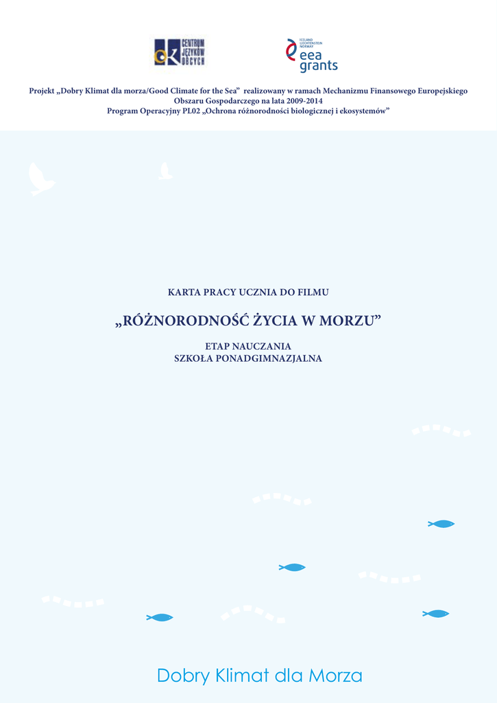 Projekt „Dobry Klimat dla morza/Good Climate for the Sea” realizowany w ramach Mechanizmu Finansowego Europejskiego Obszaru Gospodarczego na lata 2009-2014 Program Operacyjny PL02 „Ochrona różnorodności biologicznej i ekosystemów” KARTA PRACY UCZNIA DO FILMU „RÓŻNORODNOŚĆ ŻYCIA W MORZU” ETAP NAUCZANIA SZKOŁA PONADGIMNAZJALNA Dobry Klimat dla Morza Karta pracy do filmu „Różnorodność życia w morzu” Temat: Zróżnicowanie życia w Morzu Bałtyckim 1.Przeanalizuj mapę przedstawiającą zróżnicowanie zasolenia Morza Bałtyckiego oraz mapę występowania organizmów i na ich podstawie wykonaj poniższe polecenia. Dobry Klimat dla Morza a) Wymień region Bałtyku o najwyższym i najniższym stopniu zasolenia. Najwyższe zasolenie……………………………………………………………………………………………… Najniższe zasolenie………………………………………………………………………………………………. b) Jakie czynniki geograficzne wpływają na niskie zasolenie Morza Bałtyckiego? ………………………………………………………………………………………………………………………… ………………………………………………………………………………………………………………………… ………………………………………………………………………………………………………………………… ………………………………………………………………………………………………………………………… ………………………………………………………………………………………………………………………… ………………………………………………………………………………………………………………………… c) Porównaj liczebność występowania gatunków dennych z wielkością zasolenia wody morskiej. Jak zmieniają się te wartości? Zapisz prawidłowość. ………………………………………………………………………………………………………………………… ………………………………………………………………………………………………………………………… ………………………………………………………………………………………………………………………… ………………………………………………………………………………………………………………………… ………………………………………………………………………………………………………………………… ………………………………………………………………………………………………………………………… Dobry Klimat dla Morza 2. Dopasuj definicje do haseł: Populacja Biocenoza Biom Ekosystem Ekologia Biotop Biosfera Strefa kuli ziemskiej zamieszkana przez organizmy żywe, w której odbywają się procesy ekologiczne. ..................................... ..................................... ..................................... ..................................... Rozległy obszar o określonym klimacie, charakterystycznej szacie roślinnej i szczególnym świecie zwierzęcym. Zespół populacji organizmów roślinnych, zwierzęcych i mikroorganizmów danego środowiska, należących do różnych gatunków, ale powiązanych ze sobą różnorodnymi czynnikami ekologicznymi i zależnościami pokarmowymi, tworzących całość, która pozostaje w przyrodzie w stanie dynamicznej równowagi. Nauka o strukturze i funkcjonowaniu przyrody, zajmująca się badaniem oddziaływań pomiędzy organizmami a ich środowiskiem oraz wzajemnie między tymi organizmami. Często rozumiany jest jako siedlisko nieożywione, miejsce życia. ..................................... ..................................... ..................................... Dynamiczny układ ekologiczny, na który składa się zespół organizmów połączonych relacjami troficznymi wraz ze środowiskiem przezeń zajmowanym, w którym zachodzi przepływ energii i obieg materii. Zespół organizmów jednego gatunku żyjących równocześnie w określonym środowisku i wzajemnie na siebie wpływających, zdolnych do wydawania płodnego potomstwa. Dobry Klimat dla Morza 3. Z podanych gatunków organizmów występujących w Morzu Bałtyckim narysuj sieć troficzną. śledź atlantycki, foka szara, mewa śmieszka, dorsz, morświn, omułek pospolity, trawa morska, krasnorosty, nicienie, krewetka bałtycka, sinice 4. Dopasuj wymienione poniżej organizmy do odpowiedniej rubryki w tabeli mewa śmieszka, śledź atlantycki, pąkle, chełbia modra, trawa morska, foka obrączkowana, flądra, dorsz, sinice, moczarka kanadyjska, omułek pospolity, krabik amerykański, morświn, okrzemki, nicienie, kormoran czarny, babka bycza, sercówka, zielenice, krewetka bałtycka Organizmy poruszające się zgodnie z ruchami wody (plankton) Organizmy denne (bentos) Organizmy poruszające się wbrew prądom morskim (nekton) Dobry Klimat dla Morza