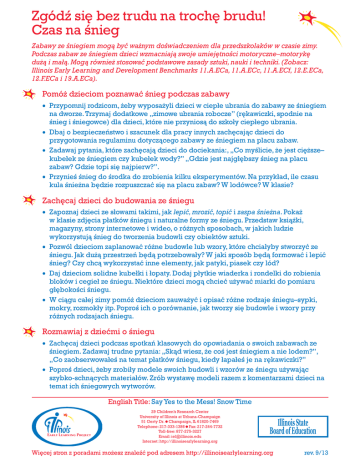 Zgódź się bez trudu na trochę brudu! Czas na śnieg Zabawy ze śniegiem mogą być ważnym doświadczeniem dla przedszkolaków w czasie zimy. Podczas zabaw ze śniegiem dzieci wzmacniają swoje umiejętności motoryczne–motorykę dużą i małą. Mogą również stosować podstawowe zasady sztuki, nauki i techniki. (Zobacz: Illinois Early Learning and Development Benchmarks 11.A.ECa, 11.A.ECc, 11.A.ECf, 12.E.ECa, 12.F.ECa i 19.A.ECa). Pomóż dzieciom poznawać śnieg podczas zabawy Przypomnij rodzicom, żeby wyposażyli dzieci w ciepłe ubrania do zabawy ze śniegiem na dworze. Trzymaj dodatkowe „zimowe ubrania robocze” (rękawiczki, spodnie na śnieg i śniegowce) dla dzieci, które nie przyniosą do szkoły ciepłego ubrania. Dbaj o bezpieczeństwo i szacunek dla pracy innych zachęcając dzieci do przygotowania regulaminu dotyczącego zabawy ze śniegiem na placu zabaw. Zadawaj pytania, które zachęcają dzieci do dociekania:, „Co myślicie, że jest cięższe– kubełek ze śniegiem czy kubełek wody?” „Gdzie jest najgłębszy śnieg na placu zabaw? Gdzie topi się najpierw?”. Przynieś śnieg do środka do zrobienia kilku eksperymentów. Na przykład, ile czasu kula śnieżna będzie rozpuszczać się na placu zabaw? W lodówce? W klasie? Zachęcaj dzieci do budowania ze śniegu Zapoznaj dzieci ze słowami takimi, jak lepić, mrozić, topić i zaspa śnieżna. Pokaż w klasie zdjęcia płatków śniegu i naturalne formy ze śniegu. Przedstaw książki, magazyny, strony internetowe i wideo, o różnych sposobach, w jakich ludzie wykorzystują śnieg do tworzenia budowli czy obiektów sztuki. Pozwól dzieciom zaplanować różne budowle lub wzory, które chciałyby stworzyć ze śniegu. Jak dużą przestrzeń będą potrzebowały? W jaki sposób będą formować i lepić śnieg? Czy chcą wykorzystać inne elementy, jak patyki, piasek czy lód? Daj dzieciom solidne kubełki i łopaty. Dodaj płytkie wiaderka i rondelki do robienia bloków i cegieł ze śniegu. Niektóre dzieci mogą chcieć używać miarki do pomiaru głębokości śniegu. W ciągu całej zimy pomóż dzieciom zauważyć i opisać różne rodzaje śniegu–sypki, mokry, rozmokły itp. Poproś ich o porównanie, jak tworzy się budowle i wzory przy różnych rodzajach śniegu. Rozmawiaj z dziećmi o śniegu Zachęcaj dzieci podczas spotkań klasowych do opowiadania o swoich zabawach ze śniegiem. Zadawaj trudne pytania: „Skąd wiesz, że coś jest śniegiem a nie lodem?”, „Co zaobserwowałeś na temat płatków śniegu, kiedy łapałeś je na rękawiczki?” Poproś dzieci, żeby zrobiły modele swoich budowli i wzorów ze śniegu używając szybko-schnących materiałów. Zrób wystawę modeli razem z komentarzami dzieci na temat ich śniegowych wytworów. English Title: Say Yes to the Mess! Snow Time Early Learning Project 29 Children’s Research Center University of Illinois at Urbana-Champaign 51 Gerty Dr.Champaign, IL 61820-7469 Telephone: 217-333-1386Fax: 217-244-7732 Toll-free: 877-275-3227 Email: [email protected] Internet: http://illinoisearlylearning.org Illinois State Board of Education Więcej stron z poradami możesz znaleźć pod adresem http://illinoisearlylearning.org rev. 9/13