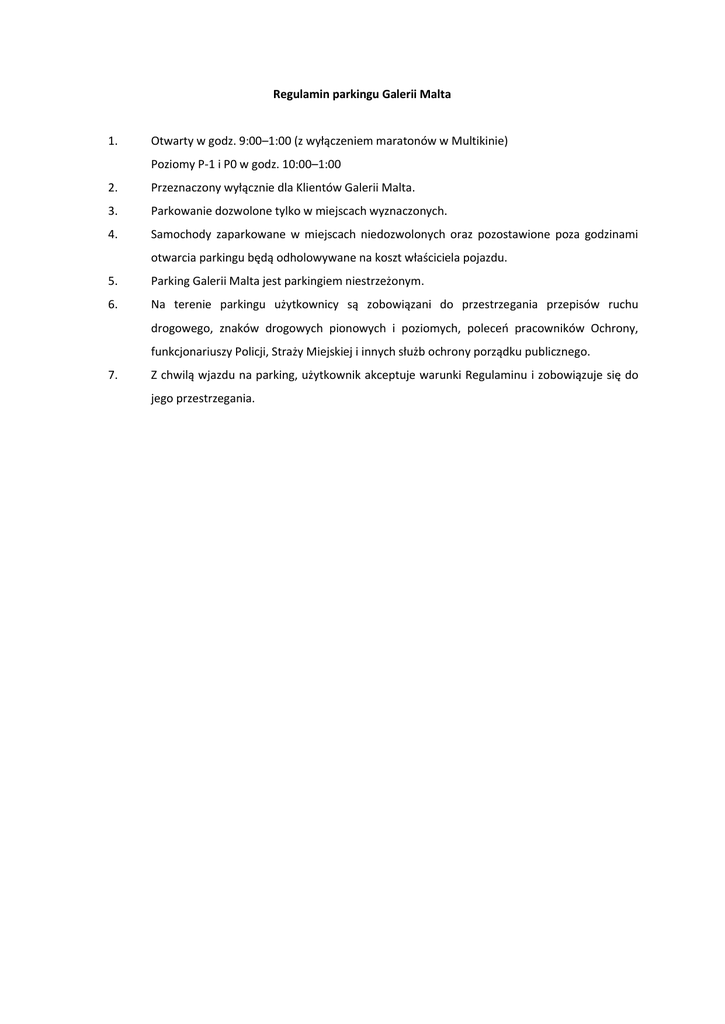 Regulamin parkingu Galerii Malta 1. Otwarty w godz. 9:00–1:00 (z wyłączeniem maratonów w Multikinie) Poziomy P-1 i P0 w godz. 10:00–1:00 2. Przeznaczony wyłącznie dla Klientów Galerii Malta. 3. Parkowanie dozwolone tylko w miejscach wyznaczonych. 4. Samochody zaparkowane w miejscach niedozwolonych oraz pozostawione poza godzinami otwarcia parkingu będą odholowywane na koszt właściciela pojazdu. 5. Parking Galerii Malta jest parkingiem niestrzeżonym. 6. Na terenie parkingu użytkownicy są zobowiązani do przestrzegania przepisów ruchu drogowego, znaków drogowych pionowych i poziomych, poleceń pracowników Ochrony, funkcjonariuszy Policji, Straży Miejskiej i innych służb ochrony porządku publicznego. 7. Z chwilą wjazdu na parking, użytkownik akceptuje warunki Regulaminu i zobowiązuje się do jego przestrzegania.