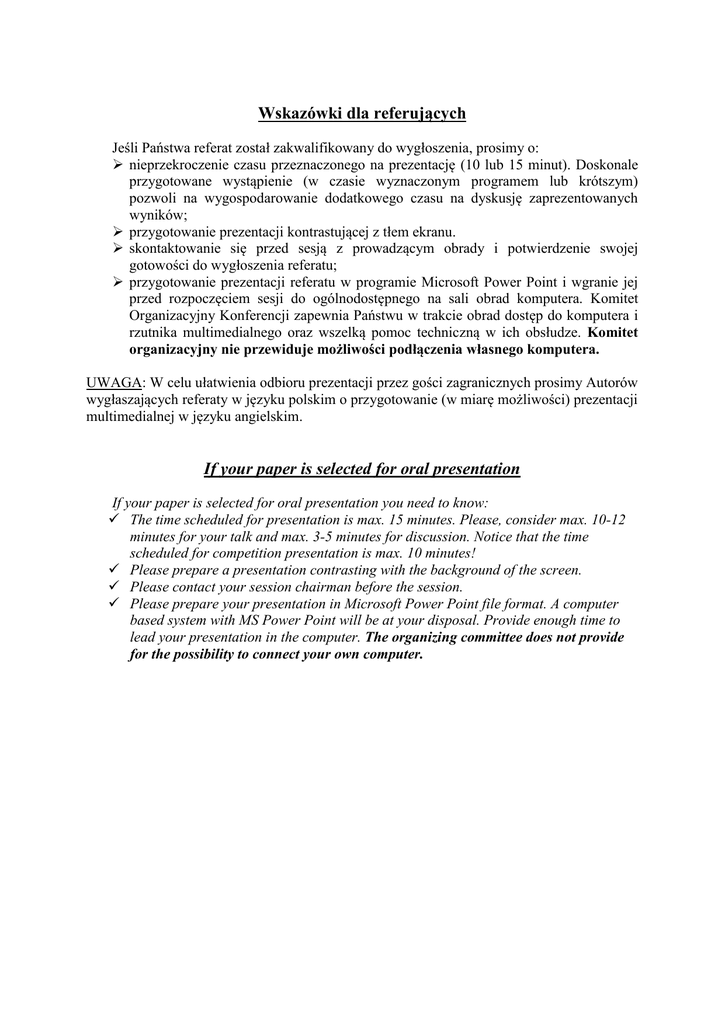 Wskazówki dla referujących Jeśli Państwa referat został zakwalifikowany do wygłoszenia, prosimy o: nieprzekroczenie czasu przeznaczonego na prezentację (10 lub 15 minut). Doskonale przygotowane wystąpienie (w czasie wyznaczonym programem lub krótszym) pozwoli na wygospodarowanie dodatkowego czasu na dyskusję zaprezentowanych wyników; przygotowanie prezentacji kontrastującej z tłem ekranu. skontaktowanie się przed sesją z prowadzącym obrady i potwierdzenie swojej gotowości do wygłoszenia referatu; przygotowanie prezentacji referatu w programie Microsoft Power Point i wgranie jej przed rozpoczęciem sesji do ogólnodostępnego na sali obrad komputera. Komitet Organizacyjny Konferencji zapewnia Państwu w trakcie obrad dostęp do komputera i rzutnika multimedialnego oraz wszelką pomoc techniczną w ich obsłudze. Komitet organizacyjny nie przewiduje możliwości podłączenia własnego komputera. UWAGA: W celu ułatwienia odbioru prezentacji przez gości zagranicznych prosimy Autorów wygłaszających referaty w języku polskim o przygotowanie (w miarę możliwości) prezentacji multimedialnej w języku angielskim. If your paper is selected for oral presentation If your paper is selected for oral presentation you need to know: The time scheduled for presentation is max. 15 minutes. Please, consider max. 10-12 minutes for your talk and max. 3-5 minutes for discussion. Notice that the time scheduled for competition presentation is max. 10 minutes! Please prepare a presentation contrasting with the background of the screen. Please contact your session chairman before the session. Please prepare your presentation in Microsoft Power Point file format. A computer based system with MS Power Point will be at your disposal. Provide enough time to lead your presentation in the computer. The organizing committee does not provide for the possibility to connect your own computer.