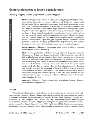Ochrona nietoperzy w lasach gospodarczych ARTYKUŁY / ARTICLES Andrzej Węgiel, Witold Grzywiński, Jolanta Węgiel Abstrakt. Pozyskiwanie drewna w ramach cięć rębnych i przedrębnych kształtuje strukturę drzewostanów, przez co wpływa na ich dostępność i atrakcyjność dla nietoperzy. Rębnie powodują powstawanie śródleśnych powierzchni otwartych, co zwykle korzystnie wpływa na aktywność żerowiskową nietoperzy. Jednak, poprzez usuwanie starych drzew mogą powodować zmniejszenie liczby dogodnych dla nich kryjówek. Trzebieże powodują zmniejszenie zagęszczenia drzew w drzewostanach średniowiekowych i starszych, co również wpływa pozytywnie na ich atrakcyjność dla żerujących nietoperzy. Dla ochrony populacji tych zwierząt istotne jest tworzenie zróżnicowanej wiekowo i gatunkowo mozaiki drzewostanów zapewniających dogodne miejsca żerowania wielu gatunkom nietoperzy. W pracy przedstawiono dotychczasowy stan wiedzy dotyczący wpływu różnych form użytkowania lasu na zespoły nietoperzy. Słowa kluczowe: Chiroptera, gospodarka leśna, rębnie, trzebieże, struktura drzewostanów, ochrona nietoperzy Abstract. The protection of bats in managed forests. Logging within the felling and pre-felling cuts shapes the structure of forest stands, which affects their availability and attractiveness for bats. Cutting systems gives rise to the creation of mid-forest open spaces, which usually have a positive effect on the activity of feeding bats. However, the removal of old trees may cause a reduction of roosts for them. Thinning decreases the density of trees in mid-aged stands which also has a positive effect on their attractiveness for foraging bats. In order to protect the population of these animals it is essential to create a diverse mosaic of stands (with respect to age and species) which will provide convenient feeding sites for many species of bats. The paper presents the current state of knowledge concerning the effects of different forms of forest utilization (logging) for bats. Keywords: Chiroptera, forest management, silvicultural harvest, thinning, stand structure, bat protection Wstęp Wszystkie gatunki nietoperzy zamieszkujące strefę umiarkowaną są w mniejszym lub większym stopniu związane z lasami. Środowiska leśne zapewniają im dwa podstawowe zasoby, a mianowicie kryjówki i bazę pokarmową (Grindal i Brigham 1999, Patriquin i Braclay 2003, Rachwald i in. 2004, Brigham 2007, Lesiński i in. 2007). Ogromna większość z nich odżywia się wyłącznie owadami nocnymi, odgrywając ważną rolę w ograniczaniu liczebności szkodników owadzich w lasach (Kunz i Fenton 2003, Kalda i in. 2015). Zainteresowanie nietoperzami oraz wpływem gospodarki leśnej na ich populacje znacząco wzrosło w ostatnich dwóch Studia i Materiały CEPL w Rogowie R. 18. Zeszyt 49A / 4 / 2016 177 dekadach. W dużej mierze było to spowodowane rozwojem technik badawczych i szerokim zastosowaniem urządzeń wykorzystujących rejestrowanie i przetwarzanie emitowanych przez nietoperze ultradźwięków (Loeb i O’Keefe 2006, Bender i in. 2015). Poszczególne grupy nietoperzy zdobywające pożywienie w środowisku leśnym zajmują określone typy środowisk. Niektóre gatunki żerują we wnętrzu drzewostanu (w koronach drzew lub pod nimi), inne na drogach leśnych i liniach oddziałowych (Hein i in. 2009, Lesiński i in. 2011, Ciechanowski 2015) lub wzdłuż krawędzi drzewostanów (Morris i in. 2010, Jantzen i Fenton 2013). Są też gatunki żerujące na otwartej przestrzeni (ponad koronami drzew oraz w lukach i na zrębach). Przy wyborze miejsc żerowania nietoperze uwzględniają strukturę drzewostanu, dostępność bazy żerowej oraz odległość od zajmowanych schronień. Przy tym, struktura drzewostanu jest elementem kluczowym (przede wszystkim dla gatunków żerujących wewnątrz drzewostanu i na jego obrzeżach). Wymagania poszczególnych gatunków nietoperzy odnośnie optymalnych warunków żerowania, jakie powinien spełniać las, są specyficzne i niekiedy wzajemnie się wykluczają (Borkin i Parsons 2014, Bender i in. 2015). Takie cechy strukturalne lasu, jak mniejsze zagęszczenie drzew czy obecność otwartych przestrzeni są korzystne dla większości gatunków nietoperzy. W celu zapewnienia dogodnych warunków do występowania jak największej różnorodności nietoperzy, lasy powinny tworzyć zróżnicowaną mozaikę różnych środowisk (Menzel i in. 2005). Celem artykułu jest przegląd światowej literatury dotyczącej wpływu gospodarczego użytkowania lasów strefy umiarkowanej na zespoły nietoperzy. W oparciu o dane literaturowe zaproponowano również zalecenia ochronne, które należy uwzględniać w trakcie projektowania i realizacji pozyskiwania drewna w lasach gospodarczych. Cięcia rębne w lasach gospodarczych Wiele badań wskazuje, że struktura przestrzenna lasu jest najważniejszym czynnikiem wpływającym na obecność nietoperzy. Otwarte przestrzenie leśne, takie jak polany, luki czy gniazda są bardzo atrakcyjnymi miejscami do żerowania dla wielu gatunków tych zwierząt (Tibbels i Kurta 2003, Kusch i in. 2004, Loeb i O’Keefe 2006). Przeprowadzono stosunkowo liczne badania dotyczące wpływu rębni zupełnych na nietoperze, pozostałe rębnie zostały poznane słabiej (Menzel i in. 2002). Uzyskane wyniki wskazują, że zarówno małopowierzchniowe rębnie zupełne (Owen i in. 2004, Loeb i O’Keefe 2006), jak i rębnie złożone (Menzel i in. 2002, Erickson i West 2003, Titchenell i in. 2011, Dodd i in. 2012) powodują wzrost aktywności nietoperzy w lesie. Ich wpływ jest jednak różny w zależności od intensywności cięć oraz sposobu żerowania poszczególnych gatunków nietoperzy (Brooks 2009, Dodd i in. 2012). Przy wykonywaniu cięć rębnych istnieje duże zagrożenie zmniejszenia dostępności schronień dla nietoperzy przez wycinanie starych drzew, w których najczęściej takie kryjówki są zlokalizowane (fot. 1). 17