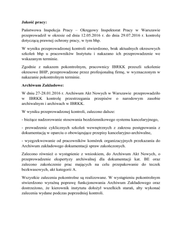 Jakość pracy: Państwowa Inspekcja Pracy – Okręgowy Inspektorat Pracy w Warszawie przeprowadził w okresie od dnia 12.05.2016 r. do dnia 29.07.2016 r. kontrolę dotyczącą prawnej ochrony pracy, w tym bhp. W wyniku przeprowadzonej kontroli stwierdzono, brak aktualnych okresowych szkoleń bhp u pracowników Instytutu i nakazano ich przeprowadzenie we wskazanym terminie. Zgodnie z nakazem pokontrolnym, pracownicy IBRKK przeszli szkolenie okresowe BHP, przeprowadzone przez profesjonalną firmę, w wyznaczonym w nakazanie pokontrolnym terminie. Archiwum Zakładowe: W dniu 27-28.01.2016 r. Archiwum Akt Nowych w Warszawie przeprowadziło w IBRKK kontrolę przestrzegania przepisów o narodowym zasobie archiwalnym i archiwach w IBRKK. W wyniku przeprowadzonej kontroli, zalecono dalsze: - bieżące nadzorowanie stosowania bezdziennikowego systemu kancelaryjnego, - prowadzenie cyklicznych szkoleń wewnętrznych z zakresu postępowania z dokumentacją w oparciu o obowiązujące przepisy kancelaryjno-archiwalne, - wyegzekwowanie od pracowników komórek organizacyjnych przekazania do Archiwum zakładowego dokumentacji spraw zakończonych. Zalecono również o wystąpienie z wnioskiem, do Archiwum Akt Nowych, o przeprowadzenie ekspertyzy archiwalnej dla dokumentacji kat. BE oraz zalecono zakończenie prac mających na celu przepakowanie do teczek bezkwasowych, akt kategorii A. Wszystkie zalecenia pokontrolne są realizowane. W wystąpieniu pokontrolnym stwierdzono wyraźną poprawę funkcjonowania Archiwum Zakładowego oraz dostrzeżono, że kierownik instytutu dołożył wszelkich starań, aby wykonać zalecenia wydane podczas poprzedniej kontroli.
