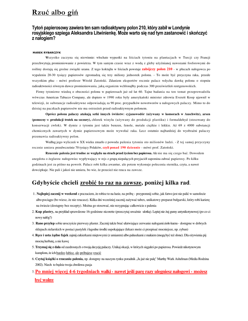 Rzuć albo giń Tytoń papierosowy zawiera ten sam radioaktywny polon 210, który zabił w Londynie rosyjskiego szpiega Aleksandra Litwinienkę. Może warto się nad tym zastanowić i skończyć z nałogiem? MAREK RYBARCZYK Wszystko zaczyna się niewinnie: włochate wypustki na liściach tytoniu na plantacjach w Turcji czy Francji przechwytują promieniowanie z powietrza. W tym samym czasie wraz z wodą z gleby użyźnianej nawozami fosforowymi do rośliny dostają się groźne związki uranu. Z tego koktajlu w liściach powstaje zabójczy polon 210 - w płucach nałogowca po wypaleniu 20-30 tysięcy papierosów zgromadzą się trzy miliony jednostek polonu. - To może być przyczyna raka, przede wszystkim płuc - mówi profesor Witold Zatoński. Zdaniem ekspertów rocznie palacz wdycha dawkę polonu o stopniu radioaktwności równym dawce promieniowania, jaką organizm wchłonąłby podczas 300 prześwietleń rentgenowskich. Firmy tytoniowe wiedzą o obecności polonu w papierosach już od lat 60. Tajne badania na ten temat przeprowadziła wówczas American Tabacco Company, ale dopiero w 1990 roku były amerykański minister zdrowia Everett Koop ujawnił w telewizji, że substancje radioaktywne odpowiadają za 90 proc. przypadków nowotworów u nałogowych palaczy. Mimo to do dzisiaj na paczkach papierosów nie ma ostrzeżeń przed radioaktywnym polonem. Oprócz polonu palaczy atakują setki innych świństw: cyjanowodór (używany w komorach w Auschwitz), arsen (pomocny w produkcji trutek na szczury), chlorek winylu (używany do produkcji plastiku) i formaldehyd (stosowany do konserwacji zwłok). W dymie z tytoniu jest także benzen, fenole, metale ciężkie i lekkie. Aż 69 z 4000 substancji chemicznych zawartych w dymie papierosowym może wywołać raka. Lecz ostatnio najbardziej do wyobraźni palaczy przemawia radioaktywny polon. Według jego wyliczeń w XX wieku zmarło z powodu palenia tytoniu sto milionów ludzi. - Z tej samej przyczyny rocznie umiera przedwcześnie 70 tysięcy Polaków, czyli ponad 190 dziennie - mówi prof. Zatoński. Rzucenie palenia jest trudne ze względu na strach przed życiem bez papierosa. Ale nie ma się czego bać. Dowodem anegdota o żeglarzu: nałogowiec wypływający w rejs z grupą niepalących przyjaciół zapomina zabrać papierosy. Po kilku godzinach jest za późno na powrót. Palacz robi kilka awantur, ale potem wykonuje polecenia sternika, czyta, a nawet dowcipkuje. Nie pali i jakoś nie umiera, bo wie, że przecież nie rzuca na zawsze. Gdybyście chcieli zrobić to raz na zawsze, poniżej kilka rad. 1. Najlepiej zacznij w weekend z poczuciem, że robisz to na luzie, na próbę - przypomnij sobie, jak fatwo jest nie palić w samolocie albo pociągu (bo wiesz, że nie rzucasz). Kilka dni wcześniej zacznij zażywać tabex, unikatowy preparat bułgarski, który robi karierę na świecie (dostępny bez recepty). Można go stosować, nie rezygnując całkowicie z palenia 2. Kup plastry, na przykład sprawdzone 16-godzinne nicorette (przeczytaj uważnie ulotkę). Lepiej nie żuj gumy antynikotynowej (po co ci nowy nałóg?) 3. Rano przylep sobie uroczyście pierwszy plaster. Zacznij także brać ułatwiające zerwanie nałogami zioło kurzu - dostępne w dobrych sklepach zielarskich w postaci pastylek i łagodne środki uspokajające (lekarz może ci przepisać mocniejsze, np. zyban) 4. Ręce i usta żądne fajek zajmij cukierkami miętowymi (z umiarem) albo paluszkami z makiem (mogą być też słone). Dla ożywienia pij mocną herbatę, a nie kawę 5. Trzymaj się z dala od zazdrosnych o twoją decyzję palaczy. Unikaj okazji, w których sięgałeś po papierosa. Powiedz nikotynowym kumplom, że ich bardzo lubisz, ale próbujesz rzucić 6. Czytaj książki o rzucaniu palenia, np. dostępny na naszym rynku poradnik „Ja już nie palę" Marthy Wark Ashelman (Media Rodzina 2002). Niech to będzie twoja chwilowa pasja 7. Po mniej więcej 4-6 tygodniach walki - nawet jeśli parę razy ulegniesz nałogowi - możesz być wolny