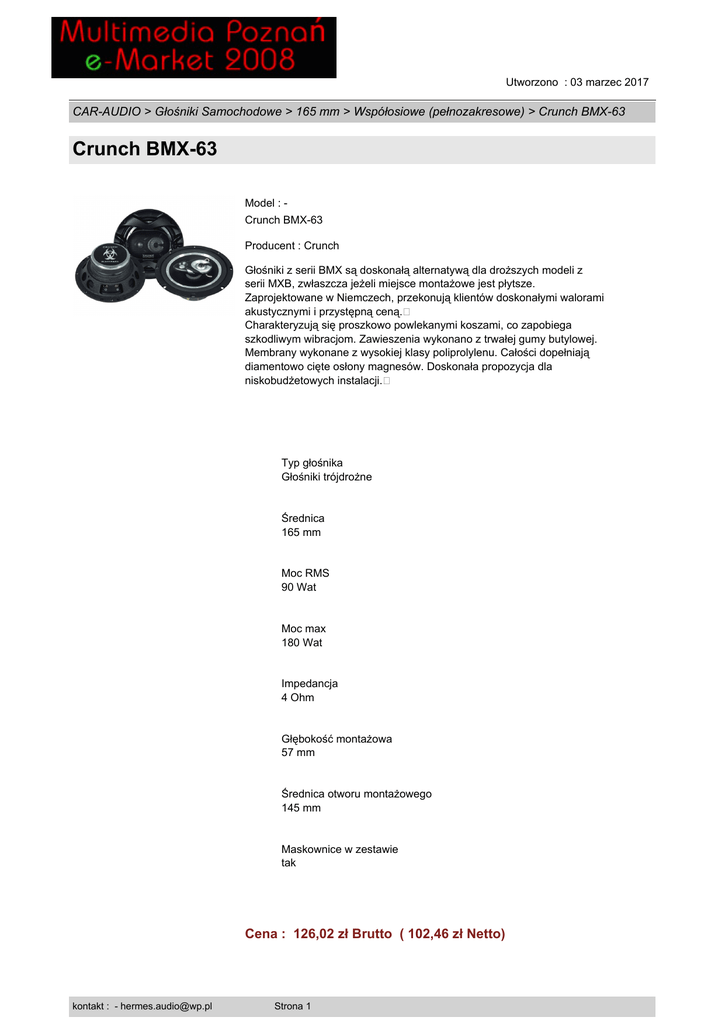 Utworzono : 03 marzec 2017 CAR-AUDIO > Głośniki Samochodowe > 165 mm > Współosiowe (pełnozakresowe) > Crunch BMX-63 Crunch BMX-63 Model : Crunch BMX-63 Producent : Crunch Głośniki z serii BMX są doskonałą alternatywą dla droższych modeli z serii MXB, zwłaszcza jeżeli miejsce montażowe jest płytsze. Zaprojektowane w Niemczech, przekonują klientów doskonałymi walorami akustycznymi i przystępną ceną. Charakteryzują się proszkowo powlekanymi koszami, co zapobiega szkodliwym wibracjom. Zawieszenia wykonano z trwałej gumy butylowej. Membrany wykonane z wysokiej klasy poliprolylenu. Całości dopełniają diamentowo cięte osłony magnesów. Doskonała propozycja dla niskobudżetowych instalacji. Typ głośnika Głośniki trójdrożne Średnica 165 mm Moc RMS 90 Wat Moc max 180 Wat Impedancja 4 Ohm Głębokość montażowa 57 mm Średnica otworu montażowego 145 mm Maskownice w zestawie tak Cena : 126,02 zł Brutto ( 102,46 zł Netto) kontakt : - [email protected] Strona 1 Utworzono : 03 marzec 2017 CAR-AUDIO > Głośniki Samochodowe > 165 mm > Współosiowe (pełnozakresowe) > Crunch BMX-63 Crunch BMX-63 Dostępność: Produkt dostępny w naszym sklepie od 29 listopad 2010 kontakt : - [email protected] Strona 2