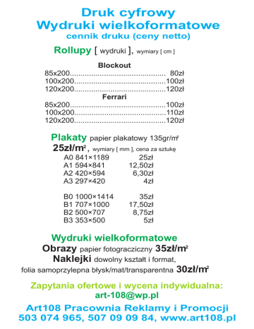 Druk cyfrowy Wydruki wielkoformatowe cennik druku (ceny netto) Rollupy [ wydruki ], wymiary [ cm ] Blockout 85x200............................................. 80z³ 100x200...........................................100z³ 120x200...........................................120z³ Ferrari 85x200.............................................100z³ 100x200...........................................110z³ 120x200...........................................120z³ Plakaty papier plakatowy 135gr/m 25z³/m2 , wymiary [ mm ], cena za sztukê 2 A0 841×1189 A1 594×841 A2 420×594 A3 297×420 25z³ 12,50z³ 6,30z³ 4z³ B0 1000×1414 B1 707×1000 B2 500×707 B3 353×500 35z³ 17,50z³ 8,75z³ 5z³ Wydruki wielkoformatowe Obrazy papier fotogracziczny 35z³/m2 Naklejki dowolny kszta³t i format, folia samoprzylepna b³ysk/mat/transparentna 30z³/m2 Zapytania ofertowe i wycena indywidualna: [email protected] Art108 Pracownia Reklamy i Promocji 503 074 965, 507 09 09 84, www.art108.pl