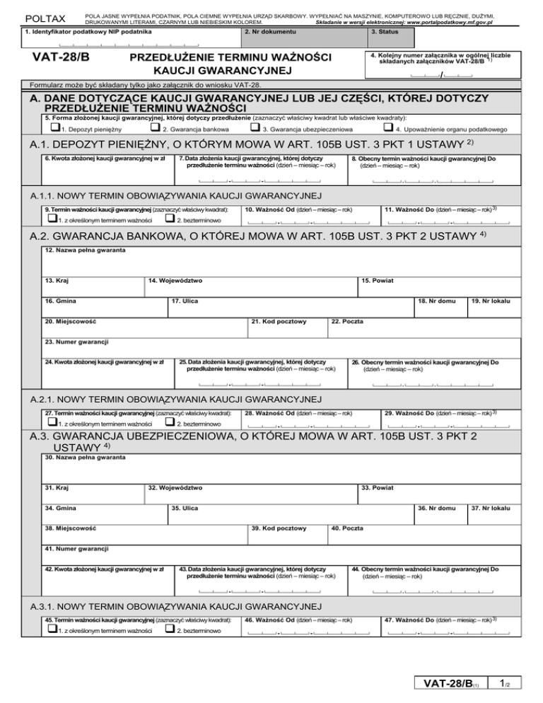 POLTAX POLA JASNE WYPEŁNIA PODATNIK, POLA CIEMNE WYPEŁNIA URZĄD SKARBOWY. WYPEŁNIAĆ NA MASZYNIE, KOMPUTEROWO LUB RĘCZNIE, DUŻYMI, DRUKOWANYMI LITERAMI, CZARNYM LUB NIEBIESKIM KOLOREM. Składanie w wersji elektronicznej: www.portalpodatkowy.mf.gov.pl 1. Identyfikator podatkowy NIP podatnika 2. Nr dokumentu 3. Status └────┴────┴────┴────┴────┴────┴────┴────┴────┴────┘ VAT-28/B PRZEDŁUŻENIE TERMINU WAŻNOŚCI KAUCJI GWARANCYJNEJ 4. Kolejny numer załącznika w ogólnej liczbie składanych załączników VAT-28/B 1) / └────┴────┘ └────┴────┘ Formularz może być składany tylko jako załącznik do wniosku VAT-28. A. DANE DOTYCZĄCE KAUCJI GWARANCYJNEJ LUB JEJ CZĘŚCI, KTÓREJ DOTYCZY PRZEDŁUŻENIE TERMINU WAŻNOŚCI 5. Forma złożonej kaucji gwarancyjnej, której dotyczy przedłużenie (zaznaczyć właściwy kwadrat lub właściwe kwadraty): 1. Depozyt pieniężny 2. Gwarancja bankowa 3. Gwarancja ubezpieczeniowa 4. Upoważnienie organu podatkowego A.1. DEPOZYT PIENIĘŻNY, O KTÓRYM MOWA W ART. 105B UST. 3 PKT 1 USTAWY 2) 6. Kwota złożonej kaucji gwarancyjnej w zł 7. Data złożenia kaucji gwarancyjnej, której dotyczy przedłużenie terminu ważności (dzień – miesiąc – rok) 8. Obecny termin ważności kaucji gwarancyjnej Do (dzień – miesiąc – rok) └────┴────┘-└────┴────┘-└────┴────┴────┴────┘ └────┴────┘-└────┴────┘-└────┴────┴────┴────┘ A.1.1. NOWY TERMIN OBOWIĄZYWANIA KAUCJI GWARANCYJNEJ 9. Termin ważności kaucji gwarancyjnej (zaznaczyć właściwy kwadrat): 1. z określonym terminem ważności 2. bezterminowo 11. Ważność Do (dzień – miesiąc – rok) 3) 10. Ważność Od (dzień – miesiąc – rok) └────┴────┘-└────┴────┘-└────┴────┴────┴────┘ └────┴────┘-└────┴────┘-└────┴────┴────┴────┘ A.2. GWARANCJA BANKOWA, O KTÓREJ MOWA W ART. 105B UST. 3 PKT 2 USTAWY 4) 12. Nazwa pełna gwaranta 13. Kraj 14. Województwo 16. Gmina 15. Powiat 17. Ulica 20. Miejscowość 18. Nr domu 21. Kod pocztowy 19. Nr lokalu 22. Poczta 23. Numer gwarancji 24. Kwota złożonej kaucji gwarancyjnej w zł 25. Data złożenia kaucji gwarancyjnej, której dotyczy przedłużenie terminu ważności (dzień – miesiąc – rok) 26. Obecny termin ważności kaucji gwarancyjnej Do (dzień – miesiąc – rok) └────┴────┘-└────┴────┘-└────┴────┴────┴────┘ └────┴────┘-└────┴────┘-└────┴────┴────┴────┘ A.2.1. NOWY TERMIN OBOWIĄZYWANIA KAUCJI GWARANCYJNEJ 27. Termin ważności kaucji gwarancyjnej (zaznaczyć właściwy kwadrat): 1. z określonym terminem ważności 2. bezterminowo 29. Ważność Do (dzień – miesiąc – rok) 3) 28. Ważność Od (dzień – miesiąc – rok) └────┴────┘-└────┴────┘-└────┴────┴────┴────┘ └────┴────┘-└────┴────┘-└────┴────┴────┴────┘ A.3. GWARANCJA UBEZPIECZENIOWA, O KTÓREJ MOWA W ART. 105B UST. 3 PKT 2 USTAWY 4) 30. Nazwa pełna gwaranta 31. Kraj 32. Województwo 34. Gmina 33. Powiat 35. Ulica 38. Miejscowość 36. Nr domu 39. Kod pocztowy 37. Nr lokalu 40. Poczta 41. Numer gwarancji 42. Kwota złożonej kaucji gwarancyjnej w zł 43. Data złożenia kaucji gwarancyjnej, której dotyczy przedłużenie terminu ważności (dzień – miesiąc – rok) 44. Obecny termin ważności kaucji gwarancyjnej Do (dzień – miesiąc – rok) └────┴────┘-└────┴────┘-└────┴────┴────┴────┘ └────┴────┘-└────┴────┘-└────┴────┴────┴────┘ A.3.1. NOWY TERMIN OBOWIĄZYWANIA KAUCJI GWARANCYJNEJ 45. Termin ważności kaucji gwarancyjnej (zaznaczyć właściwy kwadrat): 1. z określonym terminem ważności 2. bezterminowo 46. Ważność Od (dzień – miesiąc – rok) └────┴────┘-└────┴────┘-└────┴────┴────┴────┘ 47. Ważność Do (dzień – miesiąc – rok) 3) └────┴────┘-└────┴────┘-└────┴────┴────┴────┘ VAT-28/B(1) 1/2 POLTAX POLA JASNE WYPEŁNIA PODATNIK, POLA CIEMNE WYPEŁNIA URZĄD SKARBOWY. WYPEŁNIAĆ NA MASZYNIE, KOMPUTEROWO LUB RĘCZNIE, DUŻYMI, DRUKOWANYMI LITERAMI, CZARNYM LUB NIEBIESKIM KOLOREM. Składanie w wersji elektronicznej: www.portalpodatkowy.mf.gov.pl A.4. UPOWAŻNIENIE ORGANU PODATKOWEGO, O KTÓRYM MOWA W ART. 105B UST. 3 PKT 3 USTAWY 5) 48. Nazwa pełna banku (oddziału) lub spółdzielczej kasy oszczędnościowo-kredytowej, w którym lub w której prowadzony jest rachunek 49. Numer rachunku 50. Kraj 51. Województwo 53. Gmina 52. Powiat 54. Ulica 55. Nr domu 57. Miejscowość 58. Kod pocztowy 56. Nr lokalu 59. Poczta 60. Numer upoważnienia 61. Kwota złożonej kaucji gwarancyjnej w zł 62. Data złożenia kaucji gwarancyjnej, której dotyczy przedłużenie terminu ważności (dzień – miesiąc – rok) 63. Obecny termin ważności kaucji gwarancyjnej Do (dzień – miesiąc – rok) └────┴────┘-└────┴────┘-└────┴────┴────┴────┘ └────┴────┘-└────┴────┘-└
