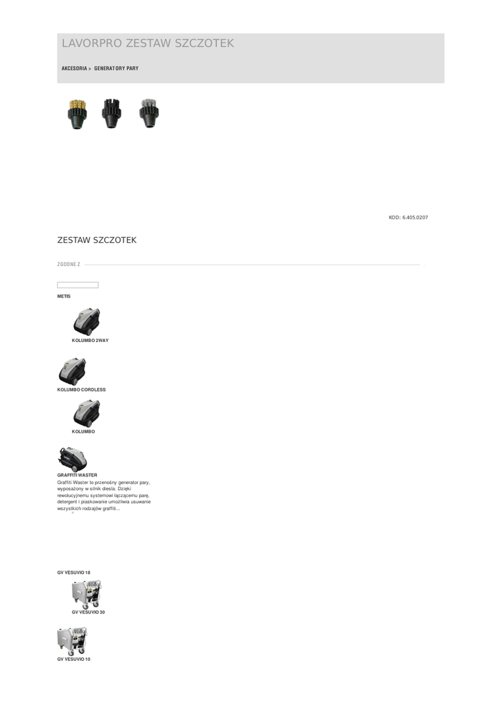 LAVORPRO ZESTAW SZCZOTEK AKCESORIA > GENERAT ORY PARY KOD: 6.405.0207 ZESTAW SZCZOTEK ZGODNE Z METIS KOLUMBO 2WAY KOLUMBO CORDLESS KOLUMBO GRAFFITI WASTER Graffiti Waster to przenośny generator pary, wyposażony w silnik diesla. Dzięki rewolucyjnemu systemowi łączącemu parę, detergent i piaskowanie umożliwia usuwanie wszystkich rodzajów graffiti... GV VESUVIO 18 GV VESUVIO 30 GV VESUVIO 10 GV 8T PLUS GV 3,3 M PLUS GV KATLA GV ETNA 4000 FOAM Uniwersalna maszyna do czyszczenia: detergentem, parą, parą z detergentem, pianą i ciepłą wodą. Wyposażona w złącze sprężonego powietrza i manometr dla powietrza i pary. Możliwość zasilenia... GV ETNA 4000 Date printed 03-03-2017 23:37:19