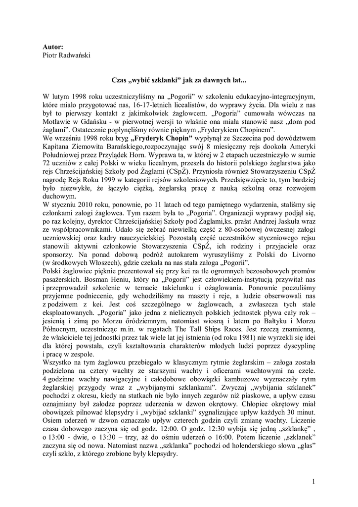 Autor: Piotr Radwański Czas „wybić szklanki” jak za dawnych lat... W lutym 1998 roku uczestniczyliśmy na „Pogorii” w szkoleniu edukacyjno-integracyjnym, które miało przygotować nas, 16-17-letnich licealistów, do wyprawy życia. Dla wielu z nas był to pierwszy kontakt z jakimkolwiek żaglowcem. „Pogoria” cumowała wówczas na Motławie w Gdańsku - w pierwotnej wersji to właśnie ona miała stanowić nasz „dom pod żaglami”. Ostatecznie popłynęliśmy równie pięknym „Fryderykiem Chopinem”. We wrześniu 1998 roku bryg „Fryderyk Chopin” wypłynął ze Szczecina pod dowództwem Kapitana Ziemowita Barańskiego,rozpoczynając swój 8 miesięczny rejs dookoła Ameryki Południowej przez Przylądek Horn. Wyprawa ta, w której w 2 etapach uczestniczyło w sumie 72 uczniów z całej Polski w wieku licealnym, przeszła do historii polskiego żeglarstwa jako rejs Chrześcijańskiej Szkoły pod Żaglami (CSpŻ). Przyniosła również Stowarzyszeniu CSpŻ nagrodę Rejs Roku 1999 w kategorii rejsów szkoleniowych. Przedsięwzięcie to, tym bardziej było niezwykłe, że łączyło ciężką, żeglarską pracę z nauką szkolną oraz rozwojem duchowym. W styczniu 2010 roku, ponownie, po 11 latach od tego pamiętnego wydarzenia, staliśmy się członkami załogi żaglowca. Tym razem była to „Pogoria”. Organizacji wyprawy podjął się, po raz kolejny, dyrektor Chrześcijańskiej Szkoły pod Żaglami,ks. prałat Andrzej Jaskuła wraz ze współpracownikami. Udało się zebrać niewielką część z 80-osobowej ówczesnej załogi uczniowskiej oraz kadry nauczycielskiej. Pozostałą część uczestników styczniowego rejsu stanowili aktywni członkowie Stowarzyszenia CSpŻ, ich rodziny i przyjaciele oraz sponsorzy. Na ponad dobową podróż autokarem wyruszyliśmy z Polski do Livorno (w środkowych Włoszech), gdzie czekała na nas stała załoga „Pogorii”. Polski żaglowiec pięknie prezentował się przy kei na tle ogromnych bezosobowych promów pasażerskich. Bosman Heniu, który na „Pogorii” jest człowiekiem-instytucją przywitał nas i przeprowadził szkolenie w temacie takielunku i ożaglowania. Ponownie poczuliśmy przyjemne podniecenie, gdy wchodziliśmy na maszty i reje, a ludzie obserwowali nas z podziwem z kei. Jest coś szczególnego w żaglowcach, a zwłaszcza tych stale eksploatowanych. „Pogoria” jako jedna z nielicznych polskich jednostek pływa cały rok – jesienią i zimą po Morzu őródziemnym, natomiast wiosną i latem po Bałtyku i Morzu Północnym, uczestnicząc m.in. w regatach The Tall Ships Races. Jest rzeczą znamienną, że właściciele tej jednostki przez tak wiele lat jej istnienia (od roku 1981) nie wyrzekli się idei dla której powstała, czyli kształtowania charakterów młodych ludzi poprzez dyscyplinę i pracę w zespole. Wszystko na tym żaglowcu przebiegało w klasycznym rytmie żeglarskim – załoga została podzielona na cztery wachty ze starszymi wachty i oficerami wachtowymi na czele. 4 godzinne wachty nawigacyjne i całodobowe obowiązki kambuzowe wyznaczały rytm żeglarskiej przygody wraz z „wybijanymi szklankami”. Zwyczaj „wybijania szklanek” pochodzi z okresu, kiedy na statkach nie było innych zegarów niż piaskowe, a upływ czasu oznajmiany był załodze poprzez uderzenia w dzwon okrętowy. Chłopiec okrętowy miał obowiązek pilnować klepsydry i „wybijać szklanki” sygnalizujące upływ każdych 30 minut. Osiem uderzeń w dzwon oznaczało upływ czterech godzin czyli zmianę wachty. Liczenie czasu dobowego zaczyna się od godz. 12:00. O godz. 12:30 wybija się jedną „szklankę” , o 13:00 - dwie, o 13:30 – trzy, aż do ośmiu uderzeń o 16:00. Potem liczenie „szklanek” zaczyna się od nowa. Natomiast nazwa „szklanka” pochodzi od holenderskiego słowa „glas” czyli szkło, z którego zrobione były klepsydry. 1 Stawianie i zrzucanie żagli (największy trud był naturalnie z ogromnym grotem), ich klarowanie oraz sterowanie i prowadzenie nawigacji – wszystko to przypominało nam w pewnym stopniu rejs „Fryderykiem Chopinem” sprzed 11 lat. No i oczywiście odśpiewanie nieśmiertelnego „Kiedy ranne wstają zorze” na porannym apelu, który jest jedną z niewielu okazji zebrania załogi w komplecie. Naturalnie nie mieliśmy, w przeciwieństwie do tamtej wyprawy, ani zajęć lekcyjnych, ani prac bosmańskich, choć na jedną z wacht spadł obowiązek sprzątnięcia pyłu z odpadów zbożowych, który pokrył pokład w czasie jednego z postojów. Nie było również nocnego wchodzenia na reje w celu sklarowania żagli, co tak miło wspominam z rejsu dookoła Ameryki Południowej... Mimo, że przygoda z „Pogorią” trwała zaledwie sześć dni, mieliśmy przyjemność doznać kawałka prawdziwego żeglarstwa, spowodowanego wiatrem na granicy sztormu – 6ºB, natomiast w szkwałach do 7ºB wiało przez kilkadziesiąt godzin. Oczywiście nie dla wszystkich okazało się to aż tak przyjemnym doświadczeniem. Dość powiedzieć, iż Neptun przez dwa dni nie narzekał na brak pożywienia. Bujało tak, że spod materaców musieliśmy wydostać półki zabezpieczające nas przed wypadnięciem z koi. Największą jednak sztuką dla mnie było przypomnienie sobie jak steruje się na dużych żaglowcach - w końcu nie robiłem tego od 11 lat. Operowanie kołem sterowym to nie taka łatwa sztuka, zwłaszcza gdy żaglowiec idzie ostro pod silny wiatr. Kiedy stanąłem za sterem tuż po objęciu wachty, nim się spostrzegłem, zrobiłem niekontrolowany zwrot przez sztag. Wprawiłem tym samym w nienajlepszy humor naszego Kapitana Bronisława Tarnackiego, a sporo fizycznej pracy zadałem naszej wachcie, która musiała popracować z żaglami w celi powrotu na właściwy kurs. Aby udowodnić, że był to jedynie przypływ chwilowej słabości, na następnej wachcie sterowałem już bezbłędnie... Żeglując w kapryśnej pogodzie, na przemian na żaglach i silniku, zwiedziliśmy