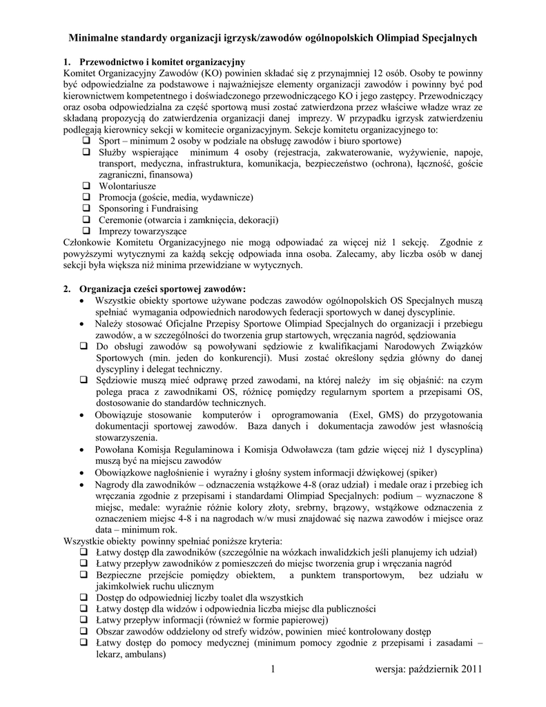 Minimalne standardy organizacji igrzysk/zawodów ogólnopolskich Olimpiad Specjalnych 1. Przewodnictwo i komitet organizacyjny Komitet Organizacyjny Zawodów (KO) powinien składać się z przynajmniej 12 osób. Osoby te powinny być odpowiedzialne za podstawowe i najważniejsze elementy organizacji zawodów i powinny być pod kierownictwem kompetentnego i doświadczonego przewodniczącego KO i jego zastępcy. Przewodniczący oraz osoba odpowiedzialna za część sportową musi zostać zatwierdzona przez właściwe władze wraz ze składaną propozycją do zatwierdzenia organizacji danej imprezy. W przypadku igrzysk zatwierdzeniu podlegają kierownicy sekcji w komitecie organizacyjnym. Sekcje komitetu organizacyjnego to: Sport – minimum 2 osoby w podziale na obsługę zawodów i biuro sportowe) Służby wspierające minimum 4 osoby (rejestracja, zakwaterowanie, wyżywienie, napoje, transport, medyczna, infrastruktura, komunikacja, bezpieczeństwo (ochrona), łączność, goście zagraniczni, finansowa) Wolontariusze Promocja (goście, media, wydawnicze) Sponsoring i Fundraising Ceremonie (otwarcia i zamknięcia, dekoracji) Imprezy towarzyszące Członkowie Komitetu Organizacyjnego nie mogą odpowiadać za więcej niż 1 sekcję. Zgodnie z powyższymi wytycznymi za każdą sekcję odpowiada inna osoba. Zalecamy, aby liczba osób w danej sekcji była większa niż minima przewidziane w wytycznych. 2. Organizacja cześci sportowej zawodów: Wszystkie obiekty sportowe używane podczas zawodów ogólnopolskich OS Specjalnych muszą spełniać wymagania odpowiednich narodowych federacji sportowych w danej dyscyplinie. Należy stosować Oficjalne Przepisy Sportowe Olimpiad Specjalnych do organizacji i przebiegu zawodów, a w szczególności do tworzenia grup startowych, wręczania nagród, sędziowania Do obsługi zawodów są powoływani sędziowie z kwalifikacjami Narodowych Związków Sportowych (min. jeden do konkurencji). Musi zostać określony sędzia główny do danej dyscypliny i delegat techniczny. Sędziowie muszą mieć odprawę przed zawodami, na której należy im się objaśnić: na czym polega praca z zawodnikami OS, różnicę pomiędzy regularnym sportem a przepisami OS, dostosowanie do standardów technicznych. Obowiązuje stosowanie komputerów i oprogramowania (Exel, GMS) do przygotowania dokumentacji sportowej zawodów. Baza danych i dokumentacja zawodów jest własnością stowarzyszenia. Powołana Komisja Regulaminowa i Komisja Odwoławcza (tam gdzie więcej niż 1 dyscyplina) muszą być na miejscu zawodów Obowiązkowe nagłośnienie i wyraźny i głośny system informacji dźwiękowej (spiker) Nagrody dla zawodników – odznaczenia wstążkowe 4-8 (oraz udział) i medale oraz i przebieg ich wręczania zgodnie z przepisami i standardami Olimpiad Specjalnych: podium – wyznaczone 8 miejsc, medale: wyraźnie różnie kolory złoty, srebrny, brązowy, wstążkowe odznaczenia z oznaczeniem miejsc 4-8 i na nagrodach w/w musi znajdować się nazwa zawodów i miejsce oraz data – minimum rok. Wszystkie obiekty powinny spełniać poniższe kryteria: Łatwy dostęp dla zawodników (szczególnie na wózkach inwalidzkich jeśli planujemy ich udział) Łatwy przepływ zawodników z pomieszczeń do miejsc tworzenia grup i wręczania nagród Bezpieczne przejście pomiędzy obiektem, a punktem transportowym, bez udziału w jakimkolwiek ruchu ulicznym Dostęp do odpowiedniej liczby toalet dla wszystkich Łatwy dostęp dla widzów i odpowiednia liczba miejsc dla publiczności Łatwy przepływ informacji (również w formie papierowej) Obszar zawodów oddzielony od strefy widzów, powinien mieć kontrolowany dostęp Łatwy dostęp do pomocy medycznej (minimum pomocy zgodnie z przepisami i zasadami – lekarz, ambulans) 1 wersja: październik 2011 Minimalne standardy organizacji igrzysk/zawodów ogólnopolskich Olimpiad Specjalnych Jasna i czytelna informacja i oznakowanie obiektu dla zawodników, trenerów, widzów, członków rodzin, mediów itp. Zapewnić wygodne miejsce dla zawodników, którzy nie biorą udziału w zawodach (idealnie w wiosce Olimpiad Specjalnych) Zapewnienie odpowiedniego miejsca na spotkania z trenerami - przed rozpoczęciem zawodów i ewentualnie podczas ich trwania jeśli będą konieczne. 3. Zakwaterowanie Wszystkie miejsca zakwaterowania powinny zostać skontrolowane przez członków KO przed podjęciem ostatecznej decyzji i zawarciem umowy. Miejsca zakwaterowania powinny spełniać poniższe kryteria: Pokoje z maksymalnie 6 łóżkami Jedno łóżko na osobę Nie więcej niż 10-12 osób na toaletę i prysznic Miejsce śniadań na miejscu lub w pobliżu Pokoje i toalety musza być czyste, zaopatrzone w papier toaletowy Pokoje muszą być zamykane na czas zawodów Ochrona kontrolująca aby osoby nieodpowiednie nie miały wstępu dostęp do budynków mieszkalnych Opieka medyczna powinna być dostępna w każdym miejscu zakwaterowania po zawodach i przez całą noc w wyznaczonym i oznakowanym miejscu. Na miejscu wtedy gdy są w pokojach uczestnicy zawodów musi być osoba – przedstawiciel komitetu organizacyjnego, do którego mogą zgłaszać się z problemami uczestnicy zawodów także w godzinach nocnych i osoba ta musi być w oznakowanym pomieszczeniu. W godzinach nocnych w miejscu zakwaterowania uczestników nie mogą się odbywać inne imprezy (np. nie związane z Olimpiadami Specjalnymi) zakłócające cisze nocna i mogące mieć wpływ na bezpieczeństwo uczestników. 4. Wyżywienie i napoje Trzy posiłki dziennie w tym przynajmniej jeden ciepły KO powinien zadbać o różnorodność i jakość posiłków (weryfikacja jadłospisów przed imprezą) KO powinien być przygotowany na spełnienie specyficznych i medycznych uwarunkowań oczekiwań żywieniowych zawodników (specjalne diety, uczulenia itd.). KO powinien zapewnić napoje zimne (woda lub innych napojów dla zawodników i trenerów) w ilościach niezbędnych by zapobiegać odwodnieniom i ci