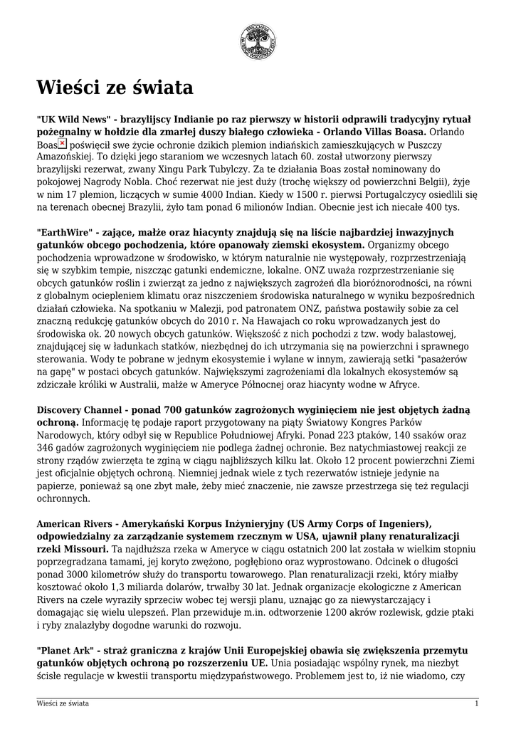 Wieści ze świata "UK Wild News" - brazylijscy Indianie po raz pierwszy w historii odprawili tradycyjny rytuał pożegnalny w hołdzie dla zmarłej duszy białego człowieka - Orlando Villas Boasa. Orlando Boas poświęcił swe życie ochronie dzikich plemion indiańskich zamieszkujących w Puszczy Amazońskiej. To dzięki jego staraniom we wczesnych latach 60. został utworzony pierwszy brazylijski rezerwat, zwany Xingu Park Tubylczy. Za te działania Boas został nominowany do pokojowej Nagrody Nobla. Choć rezerwat nie jest duży (trochę większy od powierzchni Belgii), żyje w nim 17 plemion, liczących w sumie 4000 Indian. Kiedy w 1500 r. pierwsi Portugalczycy osiedlili się na terenach obecnej Brazylii, żyło tam ponad 6 milionów Indian. Obecnie jest ich niecałe 400 tys. "EarthWire" - zające, małże oraz hiacynty znajdują się na liście najbardziej inwazyjnych gatunków obcego pochodzenia, które opanowały ziemski ekosystem. Organizmy obcego pochodzenia wprowadzone w środowisko, w którym naturalnie nie występowały, rozprzestrzeniają się w szybkim tempie, niszcząc gatunki endemiczne, lokalne. ONZ uważa rozprzestrzenianie się obcych gatunków roślin i zwierząt za jedno z największych zagrożeń dla bioróżnorodności, na równi z globalnym ociepleniem klimatu oraz niszczeniem środowiska naturalnego w wyniku bezpośrednich działań człowieka. Na spotkaniu w Malezji, pod patronatem ONZ, państwa postawiły sobie za cel znaczną redukcję gatunków obcych do 2010 r. Na Hawajach co roku wprowadzanych jest do środowiska ok. 20 nowych obcych gatunków. Większość z nich pochodzi z tzw. wody balastowej, znajdującej się w ładunkach statków, niezbędnej do ich utrzymania się na powierzchni i sprawnego sterowania. Wody te pobrane w jednym ekosystemie i wylane w innym, zawierają setki "pasażerów na gapę" w postaci obcych gatunków. Największymi zagrożeniami dla lokalnych ekosystemów są zdziczałe króliki w Australii, małże w Ameryce Północnej oraz hiacynty wodne w Afryce. Discovery Channel - ponad 700 gatunków zagrożonych wyginięciem nie jest objętych żadną ochroną. Informację tę podaje raport przygotowany na piąty Światowy Kongres Parków Narodowych, który odbył się w Republice Południowej Afryki. Ponad 223 ptaków, 140 ssaków oraz 346 gadów zagrożonych wyginięciem nie podlega żadnej ochronie. Bez natychmiastowej reakcji ze strony rządów zwierzęta te zginą w ciągu najbliższych kilku lat. Około 12 procent powierzchni Ziemi jest oficjalnie objętych ochroną. Niemniej jednak wiele z tych rezerwatów istnieje jedynie na papierze, ponieważ są one zbyt małe, żeby mieć znaczenie, nie zawsze przestrzega się też regulacji ochronnych. American Rivers - Amerykański Korpus Inżynieryjny (US Army Corps of Ingeniers), odpowiedzialny za zarządzanie systemem rzecznym w USA, ujawnił plany renaturalizacji rzeki Missouri. Ta najdłuższa rzeka w Ameryce w ciągu ostatnich 200 lat została w wielkim stopniu poprzegradzana tamami, jej koryto zwężono, pogłębiono oraz wyprostowano. Odcinek o długości ponad 3000 kilometrów służy do transportu towarowego. Plan renaturalizacji rzeki, który miałby kosztować około 1,3 miliarda dolarów, trwałby 30 lat. Jednak organizacje ekologiczne z American Rivers na czele wyraziły sprzeciw wobec tej wersji planu, uznając go za niewystarczający i domagając się wielu ulepszeń. Plan przewiduje m.in. odtworzenie 1200 akrów rozlewisk, gdzie ptaki i ryby znalazłyby dogodne warunki do rozwoju. "Planet Ark" - straż graniczna z krajów Unii Europejskiej obawia się zwiększenia przemytu gatunków objętych ochroną po rozszerzeniu UE. Unia posiadając wspólny rynek, ma niezbyt ścisłe regulacje w kwestii transportu międzypaństwowego. Problemem jest to, iż nie wiadomo, czy Wieści ze świata 1 zwierzę zostało zabrane z dzikiego terenu, czy też urodziło się w niewoli. Na przykład Czechy wyspecjalizowały się w rozmnażaniu papugi Ara, która jest gatunkiem zagrożonym wyginięciem w swych naturalnych siedliskach. "ENN News" - bieda ściera się z bogactwem w południowej Nigerii. Za każdym razem, gdy członkowie plemienia Yibo wyruszają na połów ryb niedaleko amerykańskich platform wydobywających ropę, żołnierze strzelają w powietrze starając się przepędzić rybaków. Tysiące żołnierzy zostało rozmieszczonych w okolicy platform, po tym jak miejscowi chłopi wzniecili bunt z powodu biedy. Nigeria jest jednym z największych producentów ropy, ale mieszkańcy terenów roponośnych w żaden sposób nie korzystają z jej eksploatacji. Zyski trafiają do wielkich korporacji paliwowych, jak Shell, Chevron/Texaco czy ExxonMobil, a miejscowe plemiona ponoszą z tego tytułu wyłącznie straty. Im w udziale przypada zatrucie środowiska, wylesienie rozległych terenów, liczne choroby, poronienia, kalectwa dzieci, postępujące ubóstwo z powodu utraty naturalnych źródeł zaspokajania potrzeb (np. rybołówstwo). Wywołało to bunt lokalnej ludności. Korporacje znajdują swoje sposoby na rozwiązanie konfliktu, jak np. przekupywanie lokalnych wodzów. Brytyjska organizacja pozarządowa ProNatura utworzyła fundusz, na który mają wpływać dary pieniężne, zamiast do kieszeni wodzów, a następnie zebrane w ten sposób środki mają służyć celom popieranym przez ogół mieszkańców. Pomysł został wsparty pieniędzmi Banku Światowego i Unii Europejskiej. Ze zgromadzonych funduszy utworzono już miejscowy uniwersytet i szpital. Reuters - w Australii wydano 25 pozwoleń na odstrzał słonowodnych krokodyli. Od kiedy wprowadzono pełną ochronę tych zwierząt w 1971 r., ich liczba wzrosła z 5 tys. do 70 tys. Choć organizacje ekologiczne przyznają, że znaczny wzrost populacji może zagrażać innym gatunkom, nie ma usprawiedliwienia dla polowań bogatych łowców trofeów na krokodyle. Lokalne władze twierdzą, że pieniądze z pozwoleń na polowania zosta