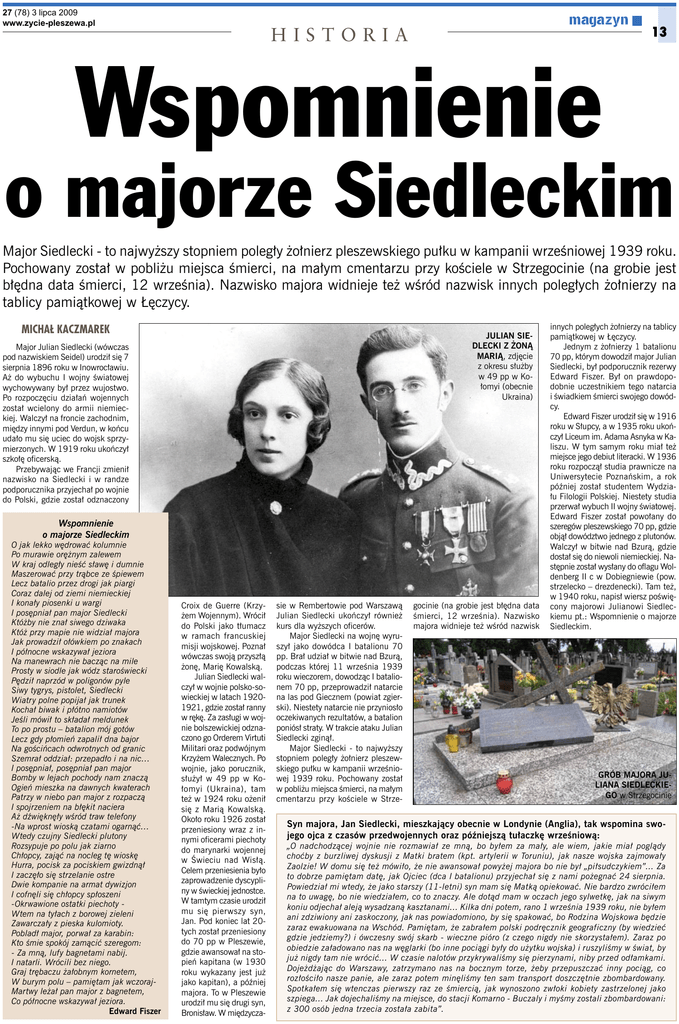 27 (78) 3 lipca 2009 www.zycie-pleszewa.pl magazyn HISTORIA Wspomnienie 13 o majorze Siedleckim Major Siedlecki - to najwyższy stopniem poległy żołnierz pleszewskiego pułku w kampanii wrześniowej 1939 roku. Pochowany został w pobliżu miejsca śmierci, na małym cmentarzu przy kościele w Strzegocinie (na grobie jest błędna data śmierci, 12 września). Nazwisko majora widnieje też wśród nazwisk innych poległych żołnierzy na tablicy pamiątkowej w Łęczycy. Michał Kaczmarek Julian Siedlecki z żoną Marią, zdjęcie z okresu służby w 49 pp w Kołomyi (obecnie Ukraina) Major Julian Siedlecki (wówczas pod nazwiskiem Seidel) urodził się 7 sierpnia 1896 roku w Inowrocławiu. Aż do wybuchu I wojny światowej wychowywany był przez wujostwo. Po rozpoczęciu działań wojennych został wcielony do armii niemieckiej. Walczył na froncie zachodnim, między innymi pod Verdun, w końcu udało mu się uciec do wojsk sprzymierzonych. W 1919 roku ukończył szkołę oficerską. Przebywając we Francji zmienił nazwisko na Siedlecki i w randze podporucznika przyjechał po wojnie do Polski, gdzie został odznaczony Wspomnienie o majorze Siedleckim O jak lekko wędrować kolumnie Po murawie orężnym zalewem W kraj odległy nieść sławę i dumnie Maszerować przy trąbce ze śpiewem Lecz batalio przez drogi jak piargi Coraz dalej od ziemi niemieckiej I konały piosenki u wargi I posępniał pan major Siedlecki Któżby nie znał siwego dziwaka Któż przy mapie nie widział majora Jak prowadził ołówkiem po znakach I północne wskazywał jeziora Na manewrach nie bacząc na mile Prosty w siodle jak wódz staroświecki Pędził naprzód w poligonów pyle Siwy tygrys, pistolet, Siedlecki Wiatry polne popijał jak trunek Kochał biwak i płótno namiotów Jeśli mówił to składał meldunek To po prostu – batalion mój gotów Lecz gdy płomień zapalił dna bajor Na gościńcach odwrotnych od granic Szemrał oddział: przepadło i na nic… I posępniał, posępniał pan major Bomby w lejach pochody nam znaczą Ogień mieszka na dawnych kwaterach Patrzy w niebo pan major z rozpaczą I spojrzeniem na błękit naciera Aż dźwięknęły wśród traw telefony -Na wprost wioską czatami ogarnąć… Wtedy czujny Siedlecki plutony Rozsypuje po polu jak ziarno Chłopcy, zająć na nocleg tę wioskę Hurra, pocisk za pociskiem gwizdnął I zaczęło się strzelanie ostre Dwie kompanie na armat dywizjon I cofnęli się chłopcy spłoszeni -Okrwawione ostatki piechoty Wtem na tyłach z borowej zieleni Zawarczały z pieska kulomioty. Pobladł major, porwał za karabin: Kto śmie spokój zamącić szeregom: - Za mną, lufy bagnetami nabij. I natarli. Wrócili bez niego. Graj trębaczu żałobnym kornetem, W burym polu – pamiętam jak wczorajMartwy leżał pan major z bagnetem, Co północne wskazywał jeziora. Edward Fiszer Croix de Guerre (Krzyżem Wojennym). Wrócił do Polski jako tłumacz w ramach francuskiej misji wojskowej. Poznał wówczas swoją przyszłą żonę, Marię Kowalską. Julian Siedlecki walczył w wojnie polsko-sowieckiej w latach 19201921, gdzie został ranny w rękę. Za zasługi w wojnie bolszewickiej odznaczono go Orderem Virtuti Militari oraz podwójnym Krzyżem Walecznych. Po wojnie, jako porucznik, służył w 49 pp w Kołomyi (Ukraina), tam też w 1924 roku ożenił się z Marią Kowalską. Około roku 1926 został przeniesiony wraz z innymi oficerami piechoty do marynarki wojennej w Świeciu nad Wisłą. Celem przeniesienia było zaprowadzenie dyscypliny w świeckiej jednostce. W tamtym czasie urodził mu się pierwszy syn, Jan. Pod koniec lat 20tych został przeniesiony do 70 pp w Pleszewie, gdzie awansował na stopień kapitana (w 1930 roku wykazany jest już jako kapitan), a później majora. To w Pleszewie urodził mu się drugi syn, Bronisław. W międzycza- sie w Rembertowie pod Warszawą Julian Siedlecki ukończył również kurs dla wyższych oficerów. Major Siedlecki na wojnę wyruszył jako dowódca I batalionu 70 pp. Brał udział w bitwie nad Bzurą, podczas której 11 września 1939 roku wieczorem, dowodząc I batalionem 70 pp, przeprowadził natarcie na las pod Giecznem (powiat zgierski). Niestety natarcie nie przyniosło oczekiwanych rezultatów, a batalion poniósł straty. W trakcie ataku Julian Siedlecki zginął. Major Siedlecki - to najwyższy stopniem poległy żołnierz pleszewskiego pułku w kampanii wrześniowej 1939 roku. Pochowany został w pobliżu miejsca śmierci, na małym cmentarzu przy kościele w Strze- gocinie (na grobie jest błędna data śmierci, 12 września). Nazwisko majora widnieje też wśród nazwisk innych poległych żołnierzy na tablicy pamiątkowej w Łęczycy. Jednym z żołnierzy 1 batalionu 70 pp, którym dowodził major Julian Siedlecki, był podporucznik rezerwy Edward Fiszer. Był on prawdopodobnie uczestnikiem tego natarcia i świadkiem śmierci swojego dowódcy. Edward Fiszer urodził się w 1916 roku w Słupcy, a w 1935 roku ukończył Liceum im. Adama Asnyka w Kaliszu. W tym samym roku miał też miejsce jego debiut literacki. W 1936 roku rozpoczął studia prawnicze na Uniwersytecie Poznańskim, a rok później został studentem Wydziału Filologii Polskiej. Niestety studia przerwał wybuch II wojny światowej. Edward Fiszer został powołany do szeregów pleszewskiego 70 pp, gdzie objął dowództwo jednego z plutonów. Walczył w bitwie nad Bzurą, gdzie dostał się do niewoli niemieckiej. Następnie został wysłany do oflagu Woldenberg II c w Dobiegniewie (pow. strzelecko – drezdenecki). Tam też, w 1940 roku, napisł wiersz poświęcony majorowi Julianowi Siedleckiemu pt.: Wspomnienie o majorze Siedleckim. Grób majora Juliana Siedleckiego w Strzegocinie Syn majora, Jan Siedlecki, mieszkający obecnie w Londynie (Anglia), tak wspomina swojego ojca z czasów przedwojennych oraz późniejszą tułaczkę wrześniową: „O nadchodzącej wojnie nie rozmawiał ze mną, bo byłem za mały, ale wie
