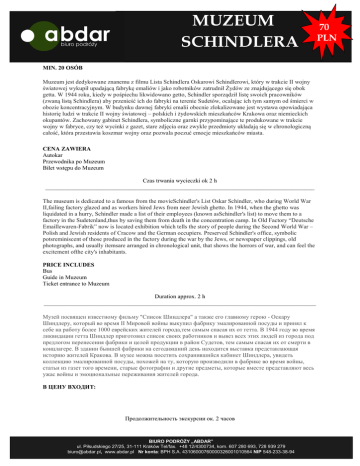 MUZEUM SCHINDLERA MIN. 20 OSÓB Muzeum jest dedykowane znanemu z filmu Lista Schindlera Oskarowi Schindlerowi, który w trakcie II wojny światowej wykupił upadającą fabrykę emaliów i jako robotników zatrudnił Żydów ze znajdującego się obok getta. W 1944 roku, kiedy w pośpiechu likwidowano getto, Schindler sporządził listę swoich pracowników (zwaną listą Schindlera) aby przenieść ich do fabryki na terenie Sudetów, ocalając ich tym samym od śmierci w obozie koncentracyjnym. W budynku dawnej fabryki emalii obecnie zlokalizowane jest wystawa opowiadająca historię ludzi w trakcie II wojny światowej – polskich i żydowskich mieszkańców Krakowa oraz niemieckich okupantów. Zachowany gabinet Schindlera, symboliczne garnki przypominające te produkowane w trakcie wojny w fabryce, czy też wycinki z gazet, stare zdjęcia oraz zwykle przedmioty układają się w chronologiczną całość, która przestawia koszmar wojny oraz pozwala poczuć emocje mieszkańców miasta. CENA ZAWIERA Autokar Przewodnika po Muzeum Bilet wstępu do Muzeum Czas trwania wycieczki ok 2 h _________________________________________________________________________________________ The museum is dedicated to a famous from the movieSchindler's List Oskar Schindler, who during World War II,failing factory glazed and as workers hired Jews from neer Jewish ghetto. In 1944, when the ghetto was liquidated in a hurry, Schindler made a list of their employees (known asSchindler's list) to move them to a factory in the Sudetenland,thus by saving them from death in the concentration camp. In Old Factory “Deutsche Emaillewaren-Fabrik” now is located exhibition which tells the story of people during the Second World War – Polish and Jewish residents of Cracow and the German occupiers. Preserved Schindler's office, symbolic potsreminiscent of those produced in the factory during the war by the Jews, or newspaper clippings, old photographs, and usually itemsare arranged in chronological unit, that shows the horrors of war, and can feel the excitement ofthe city's inhabitants. PRICE INCLUDES Bus Guide in Muzeum Ticket entrance to Muzeum Duration approx. 2 h __________________________________________________________________________________________ Музей посвящен известному фильму "Список Шиндлера" а также его главному герою - Оскару Шиндлеру, который во время II Мировой войны выкупил фабрику эмалированной посуды и принял к себе на работу более 1000 еврейских жителей города,тем самым спасая их от гетта. В 1944 году во время ликвидации гетта Шиндлер приготовил список своих работников и вывез всех этих людей из города под предлогом перенесения фабрики и целой продукции в район Судетов, тем самым спасая их от смерти в концлагере. В здании бывшей фабрики на сегодняшний день находится выставка представлающая историю жителей Кракова. В музее можна посетить сохранившийся кабинет Шиндлера, увидеть коллекцию эмалированной посуды, похожей на ту, которую производили в фабрике во время войны, статьи из газет того времени, старые фотографии и другие предметы, которые вместе представляют весь ужас войны и эмоциональные переживания жителей города. В ЦЕНУ ВХОДИТ: Продолжительность экскурсии ок. 2 часов BIURO PODRÓŻY „ABDAR” ul. Piłsudskiego 27/25, 31-111 Kraków Tel/fax. +48 12/4300734, kom. 607 280 693, 728 939 279 [email protected], www.abdar.pl Nr konta: BPH S.A. 43106000760000326001010564 NIP 548-233-38-94 70 PLN
