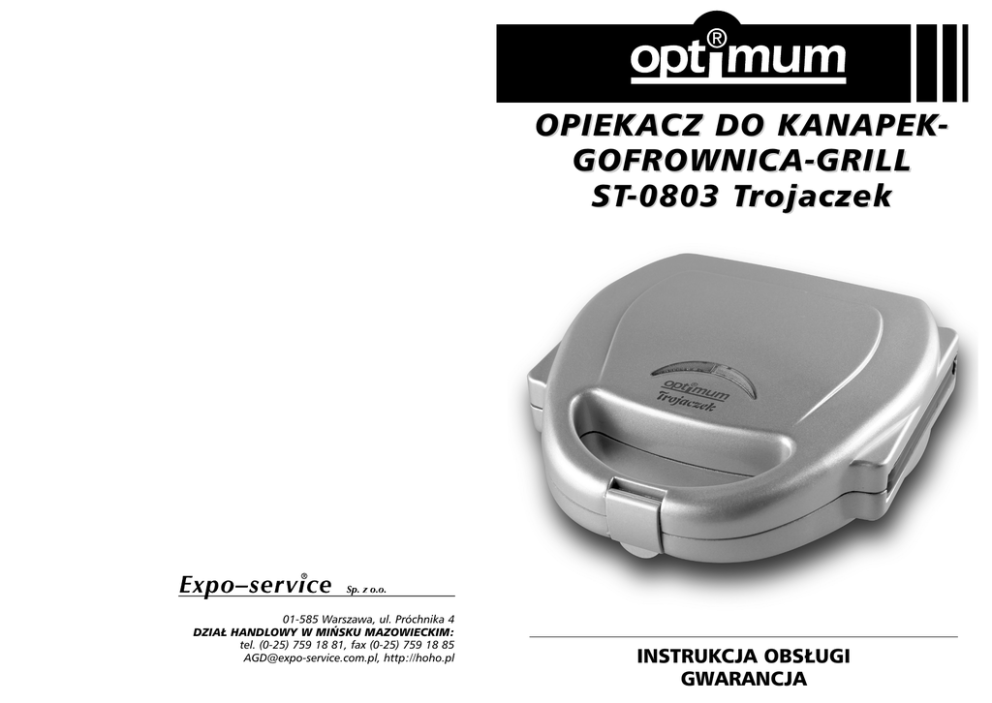 OPIEKACZ DO KANAPEKGOFROWNICA-GRILL ST-0803 Trojaczek 01-585 Warszawa, ul. Próchnika 4 DZIAŁ HANDLOWY W MIŃSKU MAZOWIECKIM: tel. (0-25) 759 18 81, fax (0-25) 759 18 85 [email protected], http://hoho.pl INSTRUKCJA OBSŁUGI GWARANCJA 58. 59. 60. 61. 62. 63. 64. 65. 66. 67. 68. 69. 70. 71. 72. 73. 74. 75. 76. 77. 78. 79. 80. 81. 82. 83. 84. 85. 86. 87. 88. 89. 90. 91. SIEDLCE 08-110 AGD SERWIS, ul. Fogla 41, tel. (025) 632-72-08 SIERADZ 98-200 ELEKTROMECHANIKA AGD, al. Pokoju 7, tel. (043) 822-71-11 SŁUPSK 76-200 N.S.G.D., ul. 3-go Maja 27, tel. (059) 843-24-58 SOKOŁÓW PODLASKI 08-300 ZHU ELDOM, ul. Wolności 49, tel. (025) 781-56-23 SOPOT 81-808 SERWIS G.D. ul. 23-go Marca 5, tel. (058) 551-30-11 SUWAŁKI 16-400 ELEKTRODOM-SERWIS, ul. Kościuszki 128, tel. (087) 565-37-70 STALOWA WOLA 37-450 CENTRUM SERWIS, ul. K.E.N. 11, tel. (015) 844-22-43 STAROGARD SZCZECIŃSKI 73-110 AGD-SERWIS, ul. Kramarska 2/2b, tel. (091) 577-26-76 SULECHÓW 66-100 PW AZ-PRIM, ul. PCK 4, tel. (068) 358-09-27, tel./fax 385-70-50 Oddział ZIELONA GÓRA 65-730, ul. Sikorskiego 41, tel. (068) 324-54-77 SZCZECIN 70-202 ELEKTRO-DOM, ul. Wyszyńskiego 27, tel. (091) 488-19-44 SZCZECIN 70-357 AMPOL PHU, ul. Pocztowa 37a, tel. (091) 484-31-93 SZCZECINEK 78-400 ZU Elektromechaniki, ul. Szczecińska 24D/6, tel. (094) 374-36-63, 0 605-288-141 ŚWIDNIK 21-040 PREDOM SERWIS, ul. Racławicka 34/44, tel. (082) 564-30-80 TARNÓW 33-100 Z.U.N.S.S. AGD, Oś. 25-lecia PRL blok 1, tel. (014) 621-25-90 TORUŃ 87-100 Z.U.H. AGD, ul. Łysakowskiego 29/35, tel. (056) 648-01-73 WEJHEROWO 84-200 B&J HURTOWNIA, ul. Obrońców Helu 3, tel. (058) 672-25-90 WIELUŃ 98-300 Z.U. ELDOM-SERWIS, ul. Baranowskiego 5, tel. (043) 843-34-15 WAŁBRZYCH 58-310 Z.U.H. ELDOM, ul. Główna 9, tel. (074) 841-55-08 WŁOCŁAWEK 87-800 Naprawa Sprzętu AGD, ul. Cyganka 24, tel. (054) 234-10-12 WROCŁAW 50-418 P.U.H. ARD, ul. Traugutta 60, tel. (071) 372-59-49, 341-82-50 WROCŁAW 53-608 BW, ul. Robotnicza 50, tel. (071) 781-81-10, 355-42-02 WARSZAWA 01-175 JURMAR, ul. Młynarska 34, tel. (022) 632-19-52 WARSZAWA 02-517 GRZEŚ, ul. Rakowiecka 2b, tel./fax (022) 849-49-74 WARSZAWA Mokotów PHU AGD, ul. Żuławskiego 2, tel. (022) 848-02-93 WARSZAWA 00-157 PHU AGD, ul. Anielewicza 8, tel. (022) 831-62-96 WARSZAWA Bemowo PHU AGD, ul. Uniejewska 6, tel. (022) 638-24-69 WARSZAWA 03-203 ABC BAZYL, ul. Bazyliańska 6, tel. (022) 11-11-14, 614-11-00 WARSZAWA 03-729 RADIONAPRAWA DAC SERVICE, ul. Targowa 63, tel. (022) 619-84-66 ZABRZE 41-800 Z.U.N.S. AGD, ul. Wallisa 14, tel. (032) 275-35-11 ZABRZE 41-800 Servis AGD, ul. Ślęczka 8, tel. (032) 276-86-553 ZAKOPANE 34-500 Z.N.S. AGD, ul. Szkolna 8a, tel. (018) 206-39-93 ZAMOŚĆ 22-400 Z.N.S. AGD ELDOM, ul. Spadek 33, tel. (084) 639-32-10 ZGIERZ 95-100 SERWIS AGD, ul. Łęczycka 55, tel. (042) 716-21-75 ŻORY 44-240 FHU EL-TECH S.C., ul. Rybnicka 113, tel. (032) 435-07-63 SERWIS CENTRALNY EXPO-SERVICE SP. Z O.O., ul. GROBELNEGO 4 05-300 MIŃSK MAZOWIECKI TEL. 0-25 758 88 19, FAX 0-25 758 36 16 Import: 01-585 Warszawa, ul. Próchnika 4 DZIAŁ HANDLOWY W MIŃSKU MAZOWIECKIM: tel. (0-25) 759 18 81, fax (0-25) 759 18 85 [email protected], http://hoho.pl 6 INSTRUKCJA OBSŁUGI OPIEKACZ DO KANAPEK-GOFROWNICA-GRILL ST-0803 Trojaczek WAŻNE ZASADY BEZPIECZEŃSTWA 1. Przeczytaj wszystkie zalecenia producenta. 2. Nie dotykaj bezpośrednio gorących powierzchni. Używaj przeznaczonych do tego celu uchwytów lub gałek. 3. Dla ochrony przed pożarem, porażeniem elektrycznym i zranieniem nie zanurzaj kabla, wtyczki lub samego opiekacza w wodzie lub innej cieczy. 4. Ścisły nadzór jest konieczny, gdy urządzenie obsługują dzieci lub znajdują się one w jego pobliżu. 5. Używanie dodatkowych akcesoriów niezalecanych przez producenta urządzenia może spowodować pożar, porażenie elektryczne lub zranienie. 6. Każdorazowo upewnij się, że urządzenie jest ustawione na stabilnej, płaskiej powierzchni. 7. JAK POWSZECHNIE większość URZĄDZEŃ KUCHENNYCH, OPIEKACZ NAGRZEWA SIĘ PODCZAS PRACY, W SZCZEGÓLNOŚCI JEGO PŁYTY GRZEJNE. PO POŁOŻENIU NA PŁYCIE GRZEJNEJ PRODUKTÓW PRZEZNACZONYCH DO ZAPIEKANIA, DOTYKAJ WYŁĄCZNIE ZAPADKI ZAMKA I UCHWYTU POKRYWY, TAK W CZASIE TRWANIA PROCESU 8. 9. 10. 11. 12. 13. 14. 15. ZAPIEKANIA JAK I PO JEGO ZAKOŃCZENIU. PODCZAS ZAPIEKANIA Z PRODUKTU ŻYWNOŚCIOWEGO BĘDZIE WYDZIELAĆ się PARA WODNA I GORĄCE POWIETRZE. ZACHOWAJ SZCZEGÓLNĄ OSTROŻNOŚĆ PODCZAS OTWIERANIA I ZAMYKANIA ROZGRZANEGO URZĄDZENIA. PRZED wyjęciem PŁYT GRZEJNYCH UPEWNIJ się, ŻE WTYCZKA ZASILANIA ELEKTRYCZNEGO URZĄDZENIA JEST ODŁĄCZONA. ZANIM PRZYSTĄPISZ DO ZAMIANY PŁYT ODCZEKAJ AŻ URZĄDZENIE OSTYGNIE. Jeżeli nie używasz urządzenia wyłącz je i odłącz wtyczkę przewodu elektrycznego. Jest to szczególnie ważne przed przystąpieniem do czyszczenia opiekacza. Nie zanurzaj urządzenia w wodzie lub innej cieczy. Nie dopuszczaj, aby przewód elektryczny zwisał poza krawędzią stołu lub dotykał powierzchni nagrzanych. Ustaw opiekacz z dala od innych nagrzewających się urządzeń kuchennych takich jak piecyk, kuchenka elektryczna, palnik gazowy itp. Nie podłączaj urządzenia z uszkodzonym przewodem lub 7 wtyczką po stwierdzeniu jego niesprawności lub, jeżeli zostało ono uszkodzone w jakikolwiek sposób w takim przypadku przekaż urządzenie do najbliższego przedstawiciela serwisu producenta. 16. Nie używaj urządzenia na zewnątrz pomieszczenia. 17. Urządzenie wolno podłączyć tylko do gniazda ze stykiem ochronnym. Urządzenie nie pracuje Jeżeli opiekacz nie pracuje sprawdź czy: 1. Wtyczka przewodu jest włożona w gniazdko i opiekacz został prawidłowo włączony. 2. Wtyczka lub gniazdo nie są uszkodzone - sprawdź podłączając inne urządzenie. ZACHOWAJ POWYŻSZE ZALECENIA OSTRZEŻENIE: NIE UŻYWAJ URZĄDZENIA DO ROBIENIA TOSTÓW LUB GRILLOWANIA BEZ PRAWIDŁOWO ZAŁOŻONYCH PŁYT GRZEJNYCH. ELEMENTY SKŁADOWE OPIEKACZA I GRILLA 1. Zapadka zamka pokrywy 2. Wyjmowane płyty grzejn