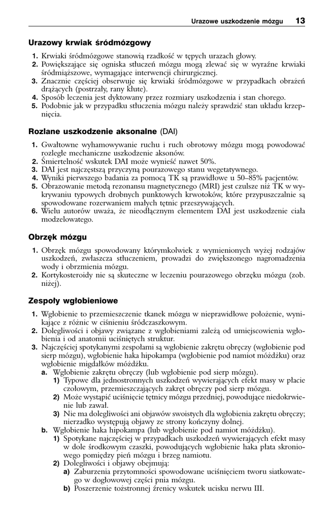 Urazowe uszkodzenie mózgu 13 Urazowy krwiak śródmózgowy 1. Krwiaki śródmózgowe stanowią rzadkość w tępych urazach głowy. 2. Powiększające się ogniska stłuczeń mózgu mogą zlewać się w wyraźne krwiaki śródmiąższowe, wymagające interwencji chirurgicznej. 3. Znacznie częściej obserwuje się krwiaki śródmózgowe w przypadkach obrażeń drążących (postrzały, rany kłute). 4. Sposób leczenia jest dyktowany przez rozmiary uszkodzenia i stan chorego. 5. Podobnie jak w przypadku stłuczenia mózgu należy sprawdzić stan układu krzepnięcia. Rozlane uszkodzenie aksonalne (DAI) 1. Gwałtowne wyhamowywanie ruchu i ruch obrotowy mózgu mogą powodować rozległe mechaniczne uszkodzenie aksonów. 2. Śmiertelność wskutek DAI może wynieść nawet 50%. 3. DAI jest najczęstszą przyczyną pourazowego stanu wegetatywnego. 4. Wyniki pierwszego badania za pomocą TK są prawidłowe u 50–85% pacjentów. 5. Obrazowanie metodą rezonansu magnetycznego (MRI) jest czulsze niż TK w wykrywaniu typowych drobnych punktowych krwotoków, które przypuszczalnie są spowodowane rozerwaniem małych tętnic przeszywających. 6. Wielu autorów uważa, że nieodłącznym elementem DAI jest uszkodzenie ciała modzelowatego. Obrzęk mózgu 1. Obrzęk mózgu spowodowany którymkolwiek z wymienionych wyżej rodzajów uszkodzeń, zwłaszcza stłuczeniem, prowadzi do zwiększonego nagromadzenia wody i obrzmienia mózgu. 2. Kortykosteroidy nie są skuteczne w leczeniu pourazowego obrzęku mózgu (zob. niżej). Zespoły wgłobieniowe 1. Wgłobienie to przemieszczenie tkanek mózgu w nieprawidłowe położenie, wyni- kające z różnic w ciśnieniu śródczaszkowym. 2. Dolegliwości i objawy związane z wgłobieniami zależą od umiejscowienia wgło- bienia i od anatomii uciśniętych struktur. 3. Najczęściej spotykanymi zespołami są wgłobienie zakrętu obręczy (wgłobienie pod sierp mózgu), wgłobienie haka hipokampa (wgłobienie pod namiot móżdżku) oraz wgłobienie migdałków móżdżku. a. Wgłobienie zakrętu obręczy (lub wgłobienie pod sierp mózgu). 1) Typowe dla jednostronnych uszkodzeń wywierających efekt masy w płacie czołowym, przemieszczających zakręt obręczy pod sierp mózgu. 2) Może wystąpić uciśnięcie tętnicy mózgu przedniej, powodujące niedokrwienie lub zawał. 3) Nie ma dolegliwości ani objawów swoistych dla wgłobienia zakrętu obręczy; nierzadko występują objawy ze strony kończyny dolnej. b. Wgłobienie haka hipokampa (lub wgłobienie pod namiot móżdżku). 1) Spotykane najczęściej w przypadkach uszkodzeń wywierających efekt masy w dole środkowym czaszki, powodujących wgłobienie haka płata skroniowego pomiędzy pień mózgu i brzeg namiotu. 2) Dolegliwości i objawy obejmują: a) Zaburzenia przytomności spowodowane uciśnięciem tworu siatkowatego w dogłowowej części pnia mózgu. b) Poszerzenie tożstronnej źrenicy wskutek ucisku nerwu III.