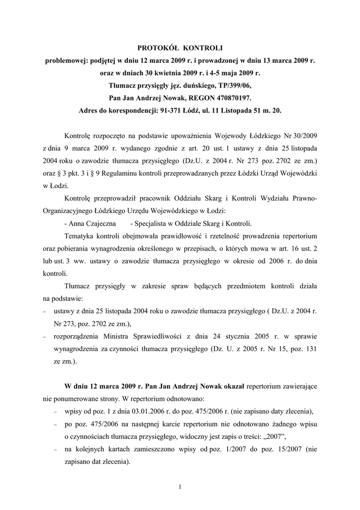 PROTOKÓŁ KONTROLI problemowej: podjętej w dniu 12 marca 2009 r. i prowadzonej w dniu 13 marca 2009 r. oraz w dniach 30 kwietnia 2009 r. i 4-5 maja 2009 r. Tłumacz przysięgły jęz. duńskiego, TP/399/06, Pan Jan Andrzej Nowak, REGON 470870197. Adres do korespondencji: 91-371 Łódź, ul. 11 Listopada 51 m. 20. Kontrolę rozpoczęto na podstawie upoważnienia Wojewody Łódzkiego Nr 30/2009 z dnia 9 marca 2009 r. wydanego zgodnie z art. 20 ust. 1 ustawy z dnia 25 listopada 2004 roku o zawodzie tłumacza przysięgłego (Dz.U. z 2004 r. Nr 273 poz. 2702 ze zm.) oraz § 3 pkt. 3 i § 9 Regulaminu kontroli przeprowadzanych przez Łódzki Urząd Wojewódzki w Łodzi. Kontrolę przeprowadził pracownik Oddziału Skarg i Kontroli Wydziału PrawnoOrganizacyjnego Łódzkiego Urzędu Wojewódzkiego w Łodzi: - Anna Czajeczna - Specjalista w Oddziale Skarg i Kontroli. Tematyka kontroli obejmowała prawidłowość i rzetelność prowadzenia repertorium oraz pobierania wynagrodzenia określonego w przepisach, o których mowa w art. 16 ust. 2 lub ust. 3 ww. ustawy o zawodzie tłumacza przysięgłego w okresie od 2006 r. do dnia kontroli. Tłumacz przysięgły w zakresie spraw będących przedmiotem kontroli działa na podstawie: − ustawy z dnia 25 listopada 2004 roku o zawodzie tłumacza przysięgłego ( Dz.U. z 2004 r. Nr 273, poz. 2702 ze zm.), − rozporządzenia Ministra Sprawiedliwości z dnia 24 stycznia 2005 r. w sprawie wynagrodzenia za czynności tłumacza przysięgłego (Dz. U. z 2005 r. Nr 15, poz. 131 ze zm.). W dniu 12 marca 2009 r. Pan Jan Andrzej Nowak okazał repertorium zawierające nie ponumerowane strony. W repertorium odnotowano: − wpisy od poz. 1 z dnia 03.01.2006 r. do poz. 475/2006 r. (nie zapisano daty zlecenia), − po poz. 475/2006 na następnej karcie repertorium nie odnotowano żadnego wpisu o czynnościach tłumacza przysięgłego, widoczny jest zapis o treści: „2007”, − na kolejnych kartach zamieszczono wpisy od poz. 1/2007 do poz. 15/2007 (nie zapisano dat zlecenia). 1 W repertorium numeracja jest prowadzona odrębnie dla roku 2006 i 2007. Z ogólnego oglądu okazanej księgi repertorium wynika, że: − datę zlecenia odnotowano jedynie w poz. 1/2006 i 2/2006; w pozycjach: 3 – 475/2006 oraz 1 – 15/2007 okazanej księgi repertorium nie zapisano daty zlecenia, − w okazanej księdze repertorium niektóre numery pozycji zostały pominięte (poz. 320/2006, 338/2006, 393/2006, 03/2007, 04/2007 i 09/2007), − w okazanej księdze repertorium znajdują się pozycje, w których zapisano jedynie numer pozycji; w pozycjach tych nie wypełniono żadnej innej rubryki, tj. „opis tłumaczonego dokumentu”, „oznaczenie czynności”, „tłumaczenie ustne”, „odmowa wykonania tłumaczenia”, „pobrane wynagrodzenie”, „zwrot dokumentu”, „uwagi” (poz. 40/2006, 41/2006, 56 – 59/2006, 96/2006, 143/2006, 146 – 149/2006, 164 – 171/2006, 232/2006, 264 – 273/2006, 372 – 377/2006, 406/2006, 462/2006), − w okazanej księdze repertorium znajdują się pozycje, w których odnotowano nazwę zleceniodawcy / zamawiającego, a w pozostałych rubrykach nie zamieszczono zapisów (w poz. 51 – 55/2006, w poz. 446/2007 – należy zauważyć, iż pozycję znajdującą się poniżej oznaczono numerem 447/2006 itd.; natomiast w poz. 61 – 62/2006 oprócz nazwy zleceniodawcy / zamawiającego zapisano jedynie ilość stron tłumaczenia), − wśród wpisów pochodzących z 2006 r. pomiędzy pozycją 386/2006 i 388/2006 znajduje się pozycja oznaczona numerem 387/2008, − w poz. 66/2006: w rubryce: „zleceniodawca lub zamawiający nazwisko (nazwa) i adres” zapisano nazwę sądu, w rubryce: „opis tłumaczonego dokumentu” w polu: „nazwa, data i numer dokumentu” zapisano: „dokumenty sprawy”, w rubryce: „uwagi o rodzaju treści, o formie i stanie dokumentu” zapisano: „liczba / rok”, w rubryce: „oznaczenie czynności” w polu: „rodzaj czynności wykonanej i język tłumaczenia” zapisano: „tłumaczenie pisemne DK”, w kolejnych pozycjach od 67 – 70/2006 w ww. rubrykach znajdują się odnośniki: „ -"- ”, 2 w poz. 66 i 67/2006 w rubryce: „opis tłumaczonego dokumentu” w polu: „język, w którym dokument sporządzono” zapisano: „PL”; w poz. 66 – 70/2006 w rubryce: „oznaczenie czynności”, w polu: „ilość stron tłumaczenia” widoczny jest zapis „3” albo „4” (trudno odczytać – na trójkę naniesiona czwórka), − w poz. 71/2006: w rubryce: „zleceniodawca lub zamawiający nazwisko (nazwa) i adres” zapisano nazwę sądu, w rubryce: „opis tłumaczonego dokumentu” w polu: „nazwa, data i numer dokumentu” zapisano: „dokument sprawy”; w rubryce: „uwagi o rodzaju treści, o formie i stanie dokumentu” zapisano: „liczba/rok”, w rubryce: „oznaczenie czynności” w polu: „rodzaj czynności wykonanej i język tłumaczenia” zapisano: „tłumaczenie DK”; w kolejnych pozycjach od 72 – 75/2006 w ww. rubrykach znajdują się odnośniki: „ -"- ”, w pozycjach 71 – 75/2006 w rubryce: „opis tłumaczonego dokumentu” w polu: „język, w którym dokument sporządzono” zapisano: „PL”; w rubryce: „oznaczenie czynności” w polu: „ilość stron tłumaczenia” zapisano: „4”, − w poz. 76/2006: w rubryce: „zleceniodawca lub zamawiający nazwisko (nazwa) i adres” zapisano nazwę sądu, w rubryce: „opis tłumaczonego dokumentu” w polu: „nazwa, data i numer dokumentu” zapisano: „akta sprawy”; w rubryce: „uwagi o rodzaju treści, o formie i stanie dokumentu” zapisano: „liczba/rok”, w rubryce: „oznaczenie czynności” w polu: „rodzaj czynności wykonanej i język tłumaczenia” zapisano: „tłumaczenie DK”; w kolejnych pozycjach od 77 – 80/2006 w ww. rubrykach znajdują się odnośniki: „ -"- ”, w poz. 76 – 80/2006 w rubryce: „opis tłumaczonego dokumentu” w polu: „język, w którym dokument sporządzono” zapisano: 