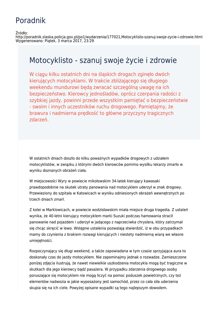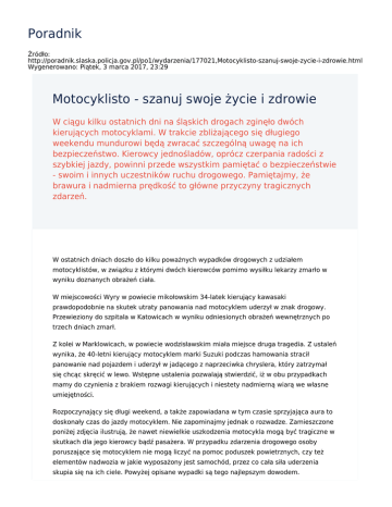 Poradnik Źródło: http://poradnik.slaska.policja.gov.pl/po1/wydarzenia/177021,Motocyklisto-szanuj-swoje-zycie-i-zdrowie.html Wygenerowano: Piątek, 3 marca 2017, 23:29 Motocyklisto - szanuj swoje życie i zdrowie W ciągu kilku ostatnich dni na śląskich drogach zginęło dwóch kierujących motocyklami. W trakcie zbliżającego się długiego weekendu mundurowi będą zwracać szczególną uwagę na ich bezpieczeństwo. Kierowcy jednośladów, oprócz czerpania radości z szybkiej jazdy, powinni przede wszystkim pamiętać o bezpieczeństwie - swoim i innych uczestników ruchu drogowego. Pamiętajmy, że brawura i nadmierna prędkość to główne przyczyny tragicznych zdarzeń. W ostatnich dniach doszło do kilku poważnych wypadków drogowych z udziałem motocyklistów, w związku z którymi dwóch kierowców pomimo wysiłku lekarzy zmarło w wyniku doznanych obrażeń ciała. W miejscowości Wyry w powiecie mikołowskim 34-latek kierujący kawasaki prawdopodobnie na skutek utraty panowania nad motocyklem uderzył w znak drogowy. Przewieziony do szpitala w Katowicach w wyniku odniesionych obrażeń wewnętrznych po trzech dniach zmarł. Z kolei w Marklowicach, w powiecie wodzisławskim miała miejsce druga tragedia. Z ustaleń wynika, że 40-letni kierujący motocyklem marki Suzuki podczas hamowania stracił panowanie nad pojazdem i uderzył w jadącego z naprzeciwka chryslera, który zatrzymał się chcąc skręcić w lewo. Wstępne ustalenia pozwalają stwierdzić, iż w obu przypadkach mamy do czynienia z brakiem rozwagi kierujących i niestety nadmierną wiarą we własne umiejętności. Rozpoczynający się długi weekend, a także zapowiadana w tym czasie sprzyjająca aura to doskonały czas do jazdy motocyklem. Nie zapominajmy jednak o rozwadze. Zamieszczone poniżej zdjęcia ilustrują, że nawet niewielkie uszkodzenia motocykla mogą być tragiczne w skutkach dla jego kierowcy bądź pasażera. W przypadku zdarzenia drogowego osoby poruszające się motocyklem nie mogą liczyć na pomoc poduszek powietrznych, czy też elementów nadwozia w jakie wyposażony jest samochód, przez co cała siła uderzenia skupia się na ich ciele. Powyżej opisane wypadki są tego najlepszym dowodem. Policjanci pełniący służbę na drogach w najbliższym czasie w sposób szczególny zwracać więc będą uwagę na bezpieczeństwo kierujących jednośladami. Ich głównymi grzechami na drodze jest brawura i nadmierna prędkość. Zaś kierujący pojazdami pamiętać powinni o fakcie, iż motocykl jest mniejszych gabarytów niż samochód, co wymaga większej uwagi by został zauważony wcześniej, szczególnie w przypadku gdy powinni oni ustąpić pierwszeństwa przejazdu jadącemu motocyklowi. Foto: nowiny.pl Foto: nowiny.pl Foto: nowiny.pl