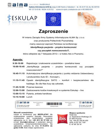 = Zaproszenie W imieniu Zarządu firmy Systemy Informatyczne ALMA Sp. z o.o. oraz producenta Politechniki Poznańskiej mamy zaszczyt zaprosić Państwa na konferencję: Identyfikacja pacjenta – przykra konieczność czy początek nowoczesności?, która odbędzie się 7 listopada 2012 r. w hotelu Ibis w Poznaniu. Agenda: 9:30-10:00 Rejestracja i znakowanie uczestników – powitalna kawa 10:00-10:45 „Identyfikacja pacjenta – przykra konieczność czy początek nowoczesności?” 10:45-11:15 Automatyczna identyfikacja pacjenta z punktu widzenia Ustawodawcy i producentów Auto ID – Koncept L 11:15-11:45 Opaski identyfikacyjne SATO – komfort i bezpieczeństwo dla każdego. Bo dla Nas liczy się człowiek. 11:45-12:00 Przerwa kawowa 12:00-13:00 Zastosowanie kodów kreskowych w systemie Eskulap – live 13:00-13:15 Pytania, ankieta handlowa 13:15-14:00 Lunch Warunki uczestnictwa: Udział w konferencji jest BEZPŁATNY dla użytkowników systemu Eskulap. Warunkiem uczestnictwa jest wcześniejsze wysłanie zgłoszenia na nr. fax: +48 (61) 82 97 242 lub e-mail: [email protected] z podaniem danych uczestników (imię/nazwisko/stanowisko). Na zgłoszenia czekamy do dnia 31.10.2012 do godz.13:00. Ilość miejsc ograniczona. Miejsce spotkania: Hotel ibis ul. Kazimierza Wielkiego 23 61-863 Poznań Tel. +48 (61) 85 84 400 GPS: N 52° 24' 7.95'' E 16° 56' 29.16'