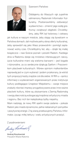 Szanowni Państwo Oddajemy do Waszych rąk zupełnie odmieniony Radomski Informator Kulturalny. Postanowiliśmy odświeżyć wydawnictwo – zmienić jego szatę graficzną i zwiększyć objętość. Chcielibyśmy, żeby RIK był kolorowy i ciekawy jak kultura w naszym mieście, żeby stając się bywalcem w Państwa domach, dał możliwie pełny obraz oferty kulturalnej, żeby sprawdził się jako Wasz przewodnik i pomógł zaplanować wolny czas. Chcielibyśmy też, aby – dzięki tej małej książeczce – nasi Goście poznali i polubili Radom. Każdego dnia w Radomiu dzieje się mnóstwo interesujących rzeczy, życie kulturalne mieni się wieloma barwami – jest bogate i różnorodne, za co serdecznie dziękuję Szefom i Pracownikom placówek kulturalnych. Wbrew opiniom malkontentów naprawdę jest w czym wybierać i jestem przekonany, że wśród tych propozycji każdy znajdzie coś dla siebie. W RIK-u – oprócz informacji o wydarzeniach organizowanych przez instytucje kultury podlegające Urzędowi Miejskiemu – swoje miejsce znalazły również imprezy przygotowywane przez inne ważne placówki kultury, które są utożsamiane z Ziemią Radomską i swoją obecnością wzbogacają krajobraz artystyczny miasta i regionu. Bez nich ten kalejdoskop byłby niepełny. Mam nadzieję, że nowy RIK spełni swoje zadanie – pokaże Radom jako miasto dynamiczne, pełne niebanalnych pomysłów i pozytywnej energii. Z tą wiarą przekazujemy Państwu Informator, życząc miłej lektury i wielu artystycznych przeżyć. Z pozdrowieniami Andrzej Kosztowniak Prezydent Miasta Radomia ul. Kilińskiego 30 siedziba główna tel. 048 362 02 10 www.radom.pl Urząd Miejski w Radomiu 1-7.06.2009 r. Spis treści Urząd Miejski w Radomiu 3 Centrum Rzeźby Polskiej 11 Dom Kultury BORKI 13 Dom Kultury IDALIN 15 Galeria ROGATKA 17 Klub Środowisk Twórczych ŁAŹNIA 19 Mazowieckie Centrum Sztuki Współczesnej ELEKTROWNIA 21 Miejska Biblioteka Publiczna 23 Miejski Ośrodek Kultury AMFITEATR 27 Młodzieżowy Dom Kultury im. H. Stadnickiej 29 Muzeum im. Jacka Malczewskiego 31 Muzeum Wsi Radomskiej 35 Ośrodek Kultury i Sztuki RESURSA OBYWATELSKA 37 Radomska Orkiestra Kameralna 41 Teatr Powszechny im. J. Kochanowskiego 43 2. Ogólnopolskie Spotkania Filmowe „Kameralne Lato” Jest to Festiwal będący połączeniem konkursu filmowego K A M E R A L N ELATO z warsztatami dla młodzieży, paRADOM 2009 1-7CZERWCA nelami dyskusyjnymi, otwartymi pokazami filmowymi i imprezami towarzyszącymi. W ramach imprezy planowane są m.in. warsztaty realizacji filmowej, warsztaty montażu filmowego, Hyde Park – Festiwal Filmów Odrzutowych (konkurs przeznaczony jest dla początkujących filmowców amatorów – 3.06.2009). Najważniejszą część Spotkań stanowi Ogólnopolski Konkurs Kina Niezależnego. Autorzy najciekawszych produkcji będą mogli nie tylko powalczyć o wyróżnienia i cenne nagrody, ale także zdobyć nominację do prestiżowej statuetki im. Jana Machulskiego – przyznawanej co roku najzdolniejszym twórcom i najlepszym filmom niezależnym powstałym w Polsce. Filmy oceni profesjonalne jury, w skład którego wejdą Anna Mucha, Mateusz Damięcki, Izabela Kuna. Pokazy konkursowe odbywać się będą w Kinie Helios w dniach 5-6.06.2009 r. 2. OGÓLNOPOLSKIE SPOTKANIA FILMOWE [] foto: M. Staszek W programie „Kameralnego Lata” m.in. 1.06.2009 r. 11.00 – uroczyste obchody „Dnia Dziecka” gry, zabawy i parady dla najmłodszych uczestników Festiwalu Plac Konstytucji 2.06.2009 r. 21.00 – wystawa prac artystów z Instytutu Sztuki Politechniki Radomskiej oraz Liceum Plastycznego w Radomiu kawiarnia Czekolada 3.06.2009 r. 15.00 – wykład otwarty „Sztuka montażu filmowego” Spotkanie z Rafałem Listopadem, autorem montażu nominowanego do nagrody Oscara filmu „Katyń” w reż. Andrzeja Wajdy 17.15 – wykład otwarty „Pierwszy krok aktorski – współpraca reżysera z aktorem”, prowadzenie – Anna Mucha 4.06.2009 r. 20.00 – „Humor w PRL-u” – zbiór najlepszych skeczy nakręconych przez operatorów Polskiej Kroniki Filmowej Kameralne Kino 22.00 „Gabinet dr Caligari” reż. Robert Wienne Pokaz filmu niemego z muzyką na żywo ul. Żeromskiego, nad fontannami 5.06. 2009 r. wykład otwarty „Pierwszy krok aktorski – prowadzenie aktora filmowego”, spotkanie z Mateuszem Damięckim 6.06.2009 r. 23.00 – Noc z kinem bollywoodzkim Prezentacja filmu „JOSH”, reż. Mansoon Khan Kino Helios, sala nr 4 7.07.2009 r. Pokaz filmów z Warszawskiej Szkoły Filmowej Teatr Powszechny Szczegółowy plan 2. Ogólnopolskich Spotkań Filmowych na stronie www.kameralnelato.pl [] foto: P. Mrówczyńska [] 2.06.2009 r. Koncert piosenek chrześcijańskich podzielony został na trzy części. W części drugiej odbędzie się występ artystów cyrkowych „Bravo” wiecznego kompleksu osadniczego (VIII–XIII w.). Będzie to niebanalna forma lekcji historii na żywo. Będzie się można nauczyć podstaw kowalstwa, skórnictwa, snycerki, garncarstwa, obróbki żywności, jej przetwarzania i konserwacji, odbędą się też warsztaty z ratownictwa medycznego czy samoobrony, warsztaty taneczne oraz koncerty zespołów „Stary Olsa” i „Rosalia”. 5.06.2009 r. 19-21.06.2009 godz. 12.00 Koncert „Ziarna” scena przy Łaźni, ul. Żeromskiego 56 Światowy Dzień Ochrony Środowiska Radom 2009 Plan imprezy: 10.00 – 12.00 – IX Proekologiczne Forum Dzieci i Młodzieży Klub Strefa G2, ul. Grzecznarowskiego. Wstęp za zaproszeniami. 12.50 – Korowód „Młodych Przyjaciół Środowiska” ulicami: pl. Jagielloński – ul. Focha – ul. Żeromskiego – Plac Corazziego (przed budynkiem Urzędu) 13.30 – 19.00 – Festyn „Radom – Czyste Miasto” Plac Corazziego przy ul. Żeromskiego, Deptak ul. Żeromskiego, Park im. Tadeusza Kościuszki Podczas Festynu odbędzie się m.in. zbiórka surowców wtórnych oraz zużytego sprzętu AGD i RTV, prezentacja firm i instytucji działających w ob