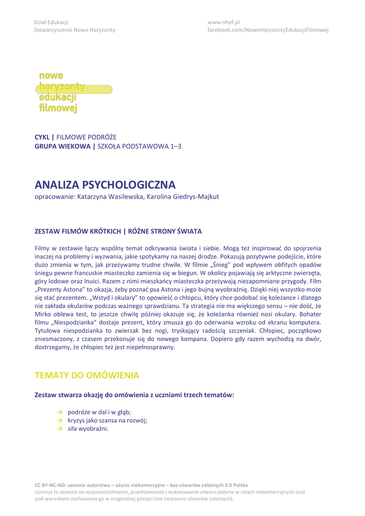 Dział Edukacji Stowarzyszenie Nowe Horyzonty www.nhef.pl facebook.com/NoweHoryzontyEdukacjiFilmowej CYKL | FILMOWE PODRÓŻE GRUPA WIEKOWA | SZKOŁA PODSTAWOWA 1–3 ANALIZA PSYCHOLOGICZNA opracowanie: Katarzyna Wasilewska, Karolina Giedrys-Majkut ZESTAW FILMÓW KRÓTKICH | RÓŻNE STRONY ŚWIATA Filmy w zestawie łączy wspólny temat odkrywania świata i siebie. Mogą też inspirować do spojrzenia inaczej na problemy i wyzwania, jakie spotykamy na naszej drodze. Pokazują pozytywne podejście, które dużo zmienia w tym, jak przeżywamy trudne chwile. W filmie „Śnieg” pod wpływem obfitych opadów śniegu pewne francuskie miasteczko zamienia się w biegun. W okolicy pojawiają się arktyczne zwierzęta, góry lodowe oraz Inuici. Razem z nimi mieszkańcy miasteczka przeżywają niezapomniane przygody. Film „Prezenty Astona” to okazja, żeby poznać psa Astona i jego bujną wyobraźnię. Dzięki niej wszystko może się stać prezentem. „Wstyd i okulary” to opowieść o chłopcu, który chce podobać się koleżance i dlatego nie zakłada okularów podczas ważnego sprawdzianu. Ta strategia nie ma większego sensu – nie dość, że Mirko oblewa test, to jeszcze chwilę później okazuje się, że koleżanka również nosi okulary. Bohater filmu „Niespodzianka” dostaje prezent, który zmusza go do oderwania wzroku od ekranu komputera. Tytułowa niespodzianka to zwierzak bez nogi, tryskający radością szczeniak. Chłopiec, początkowo zniesmaczony, z czasem przekonuje się do nowego kompana. Dopiero gdy razem wychodzą na dwór, dostrzegamy, że chłopiec też jest niepełnosprawny. TEMATY DO OMÓWIENIA Zestaw stwarza okazję do omówienia z uczniami trzech tematów: → podróże w dal i w głąb; → kryzys jako szansa na rozwój; → siła wyobraźni. CC BY-NC-ND: uznanie autorstwa – użycie niekomercyjne – bez utworów zależnych 3.0 Polska Licencja ta zezwala na rozpowszechnianie, przedstawianie i wykonywanie utworu jedynie w celach niekomercyjnych oraz pod warunkiem zachowania go w oryginalnej postaci (nie tworzenia utworów zależnych). Podróże w dal i w głąb Bohaterowie prezentowanych filmów podróżują, nawet jeśli nie ruszają się z miejsca. Odbywają podróże w sensie metaforycznym – konfrontują się z innością i odmiennością, poznają nowe osoby, miejsca oraz sposoby postrzegania pewnych rzeczy. W filmie „Śnieg” dochodzi do spotkania dwóch kultur, które wszystkim przynosi satysfakcję. Francja zmienia się w polarny krajobraz, dzięki czemu widzowie mają okazję poznać zwierzęta dalekiej Północy oraz obyczaje zamieszkujących ją ludzi. Przede wszystkim jednak dostrzegają, że bohaterowie filmu potrafią się porozumieć i działać razem mimo dzielącej ich bariery językowej – życzliwość i chęć poznania innego człowieka stoją ponad ograniczeniami. Dzieci oglądające film odbierają przekaz, że spotkanie z „innymi” to przygoda, szansa nawiązania przyjaźni oraz poszerzenia wiedzy o świecie. Bohaterowie pozostałych filmów w zestawie wyprawiają się poza granice swoich obaw i izolacji. Mirko z filmu „Wstyd i okulary” dzięki feralnej przygodzie zrozumie, że nie warto czynić pochopnych założeń odnośnie tego, jak inni mogą zareagować na naszą słabość (bo tak noszenie okularów postrzega chłopiec w wieku szkolnym, dla którego kwestia wyglądu i autoprezentacji są niezwykle istotne). Z kolei bohater filmu „Niespodzianka” decyduje się porzucić wygodną kanapę i grę, dające mu poczucie bezpieczeństwa w trudnej dla niego sytuacji. Obserwując pieska, który nie zważa na swoją niepełnosprawność i nie pozwala na to, by psuła mu zabawę, uświadamia sobie, że rezygnacja ze słońca, ruchu i aktywności jest bardziej jego własnym wyborem niż konsekwencją inwalidztwa. Robiąc krok w stronę ogrodu, robi krok w stronę akceptacji swojej sytuacji. Omawiając ten temat, warto zadać dzieciom następujące pytania: → → → → → → → co to znaczy wyprawić się w podróż? co dzieje się w trakcie podróży? czy to samo może stać się, gdy nie wyjeżdżamy, nie wychodzimy z domu? czy podróże nas zmieniają, a jeśli tak, to czy zmieniają nas na lepsze? co czujemy, spotykając się z nieznanym? co dają nam spotkania z nowymi miejscami i nowymi ludźmi? czasem znajdujemy się w trudnym położeniu – co pomaga nam wyjść z tej sytuacji? Kryzys jako szansa na rozwój Każda z filmowych opowieści w zestawie stawia bohaterów wobec wyzwań i kryzysu. Film „Śnieg” to tak naprawdę historia katastrofy naturalnej, którą z pewnością byłby dla małego miasteczka opad śniegu w takiej ilości. Twórcy filmu zadecydowali jednak, że nieprzejezdne ulice oraz domy pozbawione prądu i ogrzewania staną się scenerią fantastycznej przygody. Paraliż świata, jaki znamy, pozwala bohaterom filmu poszerzyć horyzonty oraz nawiązać głęboki kontakt z naturą. Podobnie optymistyczne podejście do kryzysu pokazane jest w filmie „Prezenty Astona”. Tutaj towarzyszymy Astonowi w okresie tuż przed urodzinami i po urodzinach, kiedy to przytrafia mu się cała seria niefortunnych przypadków. Jest chory, nie może bawić się prezentami, które dostał, w dodatku jeden z podarunków się psuje. Sympatyczny piesek każde z tych pechowych wydarzeń zamienia w przygodę. Wymyśla świetną zabawę w pakowanie wszystkiego w papier prezentowy. Ze wszystkich podatków do zabawy wybiera prostą deskę, gdyż może jej używać w czasie deszczu, zepsuty latawiec przerabia na łódkę dla taty. Pokazuje, jak wiele zależy od nas samych i naszego podejścia do kłopotów oraz niepowodzeń. Perypetie bohaterów pozostałych dwóch filmów prezentują kryzys z innej perspektywy. Mirko i Jake próbują sobie radzić z sytuacjami, które są dla nich niekomfortowe i bolesne, jednak strategie, na jakie się decydują są niekonstruktywne, a czasem wręcz szkodliwe. Chłopiec z filmu „W