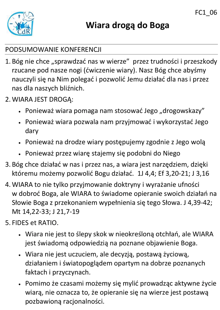 FC1_06 Wiara drogą do Boga PODSUMOWANIE KONFERENCJI 1. Bóg nie chce „sprawdzać nas w wierze” przez trudności i przeszkody rzucane pod nasze nogi (ćwiczenie wiary). Nasz Bóg chce abyśmy nauczyli się na Nim polegać i pozwolić Jemu działać dla nas i przez nas dla naszych bliźnich. 2. WIARA JEST DROGĄ: Ponieważ wiara pomaga nam stosować Jego „drogowskazy” Ponieważ wiara pozwala nam przyjmować i wykorzystać Jego dary Ponieważ na drodze wiary postępujemy zgodnie z Jego wolą Ponieważ przez wiarę stajemy się podobni do Niego 3. Bóg chce działać w nas i przez nas, a wiara jest narzędziem, dzięki któremu możemy pozwolić Bogu działać. 1J 4,4; Ef 3,20-21; J 3,16 4. WIARA to nie tylko przyjmowanie doktryny i wyrażanie ufności w dobroć Boga, ale WIARA to świadome opieranie swoich działań na Słowie Boga z przekonaniem wypełnienia się tego Słowa. J 4,39-42; Mt 14,22-33; J 21,7-19 5. FIDES et RATIO. Wiara nie jest to ślepy skok w nieokreśloną otchłań, ale WIARA jest świadomą odpowiedzią na poznane objawienie Boga. Wiara nie jest uczuciem, ale decyzją, postawą życiową, działaniem i światopoglądem opartym na dobrze poznanych faktach i przyczynach. Pomimo że czasami możemy się mylić prowadząc aktywne życie wiarą, nie oznacza to, że opieranie się na wierze jest postawą pozbawioną racjonalności. 6. Wiara jest naszą odpowiedzią: na Jego obietnice dla wszystkich (np. chrzest w Duchu, Łk 11,13) na objawienia dotyczące obecnej sytuacji (rozeznanie), 1 J 1,9 na to co wiemy o Nim, Mk 5: 24-34 7. Jak wzrastać w wierze? Staraj się być częścią środowiska wiary. Czytaj Słowo Boże i żyj sakramentami Kościoła. Czytaj i słuchaj pisma i komentarze „świadków wiary” Módl się o wiarę i podejmuj dzialania „od małych do większych” 8. Podejmij pierwsze kroki: Nie „stawaj na palcach” ale naucz się odpoczywać na modlitwie i bądź gotowy, aby spróbować - niech Pan nauczy Cię, jak to zrobić. Nie należy wzbudzać w sobie uczuć wiary - to prowadzi do skupiania się na sobie, lepiej skupić się na Chrystusie, jego mocy i mocy jego obietnic. Kiedy modlisz się o różne rzeczy, nie musisz użalać się nad sobą ale raczej módl się z ufnością, dziękuj Bogu za to co On zrobi, wyznając Jego panowanie i władzę, chwaląc Go. Módl się o więcej wiary. Wierzę; pomóż mojej niewierze! (Mk 9,24). DZIELENIE Co dzieje się w waszej rodzinie? W jakiej intencji trzeba się za Ciebie modlić? Jak spędzasz ostatnio wolny czas? Opowiedz o tym, w jaki sposób Bóg umacniał Twoją wiarę. Przedstaw, które kroki chciałbyś podjąć w przyszłości, by wzrastać w wierze.