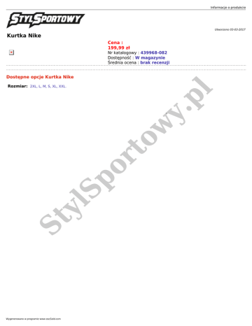 Informacje o produkcie Utworzono 03-03-2017 Kurtka Nike Cena : 199,99 zł Nr katalogowy : 439968-082 Dostępność : W magazynie Średnia ocena : brak recenzji Dostępne opcje Kurtka Nike St y lS p or to w y. pl Rozmiar: 2XL, L, M, S, XL, XXL. Wygenerowano w programie www.oscGold.com