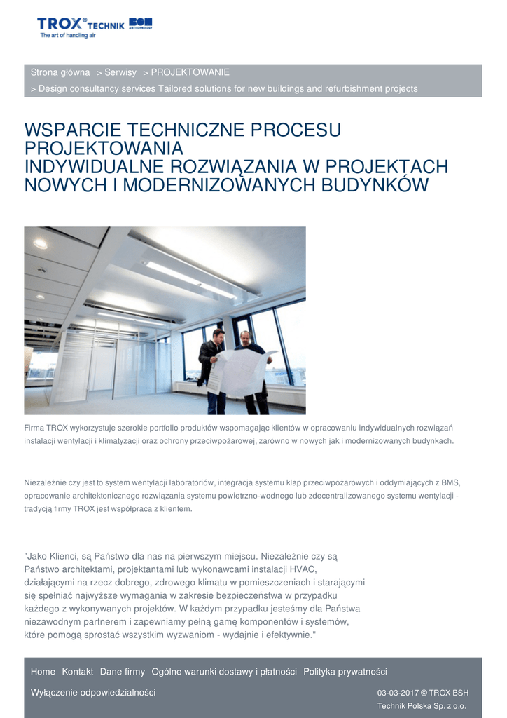 Strona główna > Serwisy > PROJEKTOWANIE > Design consultancy services Tailored solutions for new buildings and refurbishment projects WSPARCIE TECHNICZNE PROCESU PROJEKTOWANIA INDYWIDUALNE ROZWIĄZANIA W PROJEKTACH NOWYCH I MODERNIZOWANYCH BUDYNKÓW Firma TROX wykorzystuje szerokie portfolio produktów wspomagając klientów w opracowaniu indywidualnych rozwiązań instalacji wentylacji i klimatyzacji oraz ochrony przeciwpożarowej, zarówno w nowych jak i modernizowanych budynkach. Niezależnie czy jest to system wentylacji laboratoriów, integracja systemu klap przeciwpożarowych i oddymiających z BMS, opracowanie architektonicznego rozwiązania systemu powietrzno-wodnego lub zdecentralizowanego systemu wentylacji tradycją firmy TROX jest współpraca z klientem. "Jako Klienci, są Państwo dla nas na pierwszym miejscu. Niezależnie czy są Państwo architektami, projektantami lub wykonawcami instalacji HVAC, działającymi na rzecz dobrego, zdrowego klimatu w pomieszczeniach i starającymi się spełniać najwyższe wymagania w zakresie bezpieczeństwa w przypadku każdego z wykonywanych projektów. W każdym przypadku jesteśmy dla Państwa niezawodnym partnerem i zapewniamy pełną gamę komponentów i systemów, które pomogą sprostać wszystkim wyzwaniom - wydajnie i efektywnie." Home Kontakt Dane firmy Ogólne warunki dostawy i płatności Polityka prywatności Wyłączenie odpowiedzialności 03-03-2017 © TROX BSH Technik Polska Sp. z o.o. Strona główna > Serwisy > PROJEKTOWANIE > Design consultancy services Tailored solutions for new buildings and refurbishment projects Prezes Zarządu firmy TROX GmbH Firma TROX zachęca do współpracy ze specjalistami firmy oraz wykorzystania ich wiedzy w zakresie wyboru optymalnego rozwiązania do każdego projektu. Komponenty, urządzenia i systemy firmy były stosowane z sukcesem w następujących typach obiektów: Stacje kolejowe i lotniska Budynki biurowe Centra handlowe Restauracje Hotele Budynki przemysłowe i laboratoria Szpitale Hale targowe Muzea Statki Szkoły i uniwersytety Stadiony i sale gimnastyczne Teatry i sale koncertowe Tunele KORZYŚCI ZE WSÓŁPRACY Z FIRMĄ TROX Im wcześniej inżynierowie firmy TROX zostaną zaproszeni do współpracy przy projekcie tym większa szansa na duży sukces. Home Kontakt Dane firmy Ogólne warunki dostawy i płatności Polityka prywatności Wyłączenie odpowiedzialności 03-03-2017 © TROX BSH Technik Polska Sp. z o.o. Strona główna > Serwisy > PROJEKTOWANIE > Design consultancy services Tailored solutions for new buildings and refurbishment projects Proces projektowania w bliskiej współpracy z właścicielami budynków, architektami, projektantami, producentami wyposażenia zapewnia niezawodność i kontrolę kosztów nawet złożonych projektów. Firma TROX oferuje współpracę w zakresie: Wyboru rozwiązań architektonicznych Wyboru koncepcji i optymalizacji Analizy wariantów Określenia efektywności energetycznej Analizy kosztów Doradztwa w projektowaniu Wyboru rozwiązania Testów działania (chłodzenie, grzanie, akustyka, charakterystyki przepływu) Realizacji Korzyści Skrócony czas budowy Mniejsza wysokość kondygnacjiMniejsza wysokość kondygnacji Łatwa instalacja (plug and play) Szybszy zwrot kosztów inwestycyjnych Mniej interfejsów Redukcja kosztów konserwacji i eksploatacji Home Kontakt Dane firmy Ogólne warunki dostawy i płatności Polityka prywatności Wyłączenie odpowiedzialności 03-03-2017 © TROX BSH Technik Polska Sp. z o.o. Strona główna > Serwisy > PROJEKTOWANIE > Design consultancy services Tailored solutions for new buildings and refurbishment projects Oszczędności energii Elastyczne możliwości doposażenia/wymiany Inteligentna regulacja dzięki integracji z systemem BMS Zredukowane okablowanie Większa niezawodność działania Maksymalna elastyczność dzięki konfiguracji i technologii OPRACOWANIE NAWIEWNIKÓW WIROWYCH DLA LOTNISKA SANTOS DUMONT AIRPORT W RIO DE JANERIO Testy przepływu: pomieszczenie testowe w laboratorium badań i rozwoju firmy TROX Brazil: TROX swirl diffusers distribute fresh air to the halls and corridors of Rio de Janeiro's Santos Dumont Airport. TROX BSH Technik Polska Sp. z o.o. Kontakt online Formularz kontaktowy Kontakt TROX BSH Stara Iwiczna Zgłoszenie usterki TROX BSH Technik Polska Sp. z Zapytanie ofertowe - szafy Telefon: +48 22 73718 58 Fax: +48 22 737 18 59 o.o. Tel. Komórkowy: +48 662 129 415 ul. Kolejowa 13, Stara Iwiczna Kontakt 05-500 Piaseczno telefon +48 22 737 18 58 fax +48 22 737 18 59 e-mail: [email protected] Home Kontakt Dane firmy Ogólne warunki dostawy i płatności Polityka prywatności Wyłączenie odpowiedzialności 03-03-2017 © TROX BSH Technik Polska Sp. z o.o.