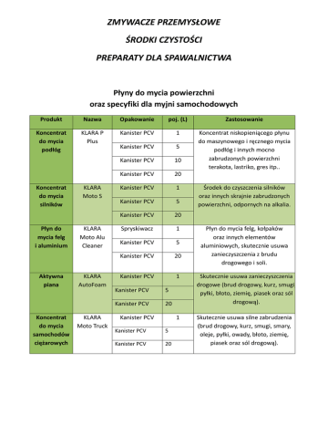 ZMYWACZE PRZEMYSŁOWE ŚRODKI CZYSTOŚCI PREPARATY DLA SPAWALNICTWA Płyny do mycia powierzchni oraz specyfiki dla myjni samochodowych Produkt Nazwa Opakowanie poj. (L) Zastosowanie Koncentrat do mycia podłóg KLARA P Plus Kanister PCV 1 Kanister PCV 5 Kanister PCV 10 Koncentrat niskopieniącego płynu do maszynowego i ręcznego mycia podłóg i innych mocno zabrudzonych powierzchni terakota, lastriko, gres itp.. Kanister PCV 20 Kanister PCV 1 Kanister PCV 5 Kanister PCV 20 Spryskiwacz 1 Kanister PCV 5 Kanister PCV 20 Kanister PCV 1 Skutecznie usuwa zanieczyszczenia drogowe (brud drogowy, kurz, smugi, pyłki, błoto, ziemię, piasek oraz sól drogową). 1 Skutecznie usuwa silne zabrudzenia (brud drogowy, kurz, smugi, smary, oleje, pyłki, owady, błoto, ziemię, piasek oraz sól drogową). Koncentrat do mycia silników Płyn do mycia felg i aluminium Aktywna piana Koncentrat do mycia samochodów ciężarowych KLARA Moto S KLARA Moto Alu Cleaner KLARA AutoFoam KLARA Moto Truck Kanister PCV 5 Kanister PCV 20 Kanister PCV Kanister PCV 5 Kanister PCV 20 Środek do czyszczenia silników oraz innych skrajnie zabrudzonych powierzchni, odpornych na alkalia. Płyn do mycia felg, kołpaków oraz innych elementów aluminiowych, skutecznie usuwa zanieczyszczenia z brudu drogowego i soli. Płyny do mycia powierzchni oraz specyfiki dla myjni samochodowych Produkt Płyn do usuwania owadów Nazwa poj. (L) KLARA Spryskiwacz Moto Insect 1 Kanister PCV 1 Kanister PCV 5 Kanister PCV 1 Kanister PCV 5 Kanister PCV 20 Kanister PCV 1 Kanister PCV 5 Koncentrat KLARA CEM do zaplamień cementowych Koncentrat płynu do spryskiwaczy – letni Opakowanie KLARA Auto SR Zastosowanie Usuwa owady i inne zanieczyszczenia pochodzenia organicznego z szyb i karoserii samochodowych nie zawiera agresywnych środków mogących uszkodzić lakier i elementy z tworzyw sztucznych. Kwaśny, skoncentrowany płyn do usuwania zaplamień cementowych i wapiennych, myje konstrukcje stalowe oraz narzędzia murarskie, szalunki oraz inne powierzchnie odporne na kwasy, np. kostka bruk. Doskonale usuwa brud z szyb i reflektorów, nie pozostawia smug, produkt jest całkowicie neutralny dla lakieru, powierzchni gumowych oraz innych elementów pojazdu. Płyny do czyszczenia i odtłuszczania metali Produkt Nazwa Środek do czyszczenia i nabłyszczania stali KLARA S Koncentrat do aluminium, INOX i stopów glinu KLARA ProCleaner Płyn do aluminium, INOX i stopów glinu KLARA P ProCleaner Kwaśny płyn do aluminium, INOX i stopów glinu KLARA AluCleaner Kwaśny zmywacz do stali węglowej BLITZ Steel 118 Kwaśny zmywacz do stali nierdzewnej BLITZ SN Koncentrat BLITZ AL detergentu do aluminium Płyn alkaiczny do odtłuszczania BLITZ Orange Cleaner Opakowanie poj. (L) Spryskiwacz 0,5 Kanister PCV 5 Kanister PCV 1 Kanister PCV 5 Kanister PCV 10 Kanister PCV 20 Spryskiwacz 1 Kanister PCV 5 Spryskiwacz 1 Kanister PCV 1 Kanister PCV 5 Spryskiwacz 1 Kanister PCV 1 Kanister PCV 5 Kanister PCV 1 Kanister PCV 5 Spryskiwacz 1 Kanister PCV 1 Kanister PCV 5 Spryskiwacz 1 Kanister PCV 1 Kanister PCV 5 Zastosowanie Czyszczenie i pielęgnacja urządzeń, mebli oraz wszelkich elementów ze stali nierdzewnych i stopowych usuwa najbardziej uporczywe zabrudzenia, tłuste ślady i odciski palców. Skoncentrowany alkaliczny środek do czyszczenia urządzeń przemysłowych oraz innych skrajnie zabrudzonych powierzchni, silny środek myjący, znajdujący szerokie zastosowanie do czyszczenia powierzchni metalowych. Gotowy do użycia płyn o zastosowaniu jak powyżej. Lekko kwaśny preparat do czyszczenia aluminium, stali nierdzewnej oraz stopów glinu, usuwa typowe tłuszcze, zabrudzenia organiczne, rdzawe ślady oraz naloty z klocków hamulcowych. Trawiący, lekko kwaśny do stali, nie zawiera silnych kwasów nieorganicznych. Stosowany do czyszczenia felg, szyn kolejowych, oczyszczania i pasywacji. Kwaśny płyn do czyszczenia INOX. Usuwa tłuszcze, zabrudzenia oraz naloty ferrytowe. Nie matowi powierzchni. Czyszczenie silnych, przemysłowych zabrudzeń z powierzchni aluminium. Niskopieniące detergenty pozwalają na łatwe spłukiwanie z umytych części. Wielozadaniowy alkaiczny płyn na bazie terpeny pomarańczowej do odtłuszczania różnych powierzchni. Preparaty antyodpryskowe dla spawalnictwa Produkt Preparat antyodpryskowy Nazwa KLARA Weld Opakowanie pojemn ość Zastosowanie Spryskiwacz 1L Kanister PCV 1L Kanister PCV 5L Kanister PCV 20 L Kanister PCV 1L Kanister PCV 5L Kanister PCV 20 L Antyodpryskowy BLITZ WPspray 01 spawalniczy spray 400 ml Chroni dysze palników przed przywieraniem odprysków spawalniczych. Antyodpryskowa Pasta WPpasta 03 spawalnicza puszka 340 ml Chroni dysze palników przed przywieraniem odprysków spawalniczych. Preparat antyodpryskowy beczka 200 L Kubikontener 900 L Większe opakowania przemysłowe w razie intensywnego używania środka mając własny rozpylacz Preparat KLARA antyodpryskowy Weld z odtłuszczaczem Special KLARA Weld Preparat zabezpieczający końcówki prądowe, dysze, dociski, narzędzia oraz powierzchnie spawane przed przywieraniem i wtapianiem się odprysków spawalniczych. Nie zawiera silikonu oraz rozpuszczalników organicznych. Produkt niepalny, biodegradowalny. Posiada takie same właściwości jak KLARA Weld. Dodatkowo zawiera środek odtłuszczający.