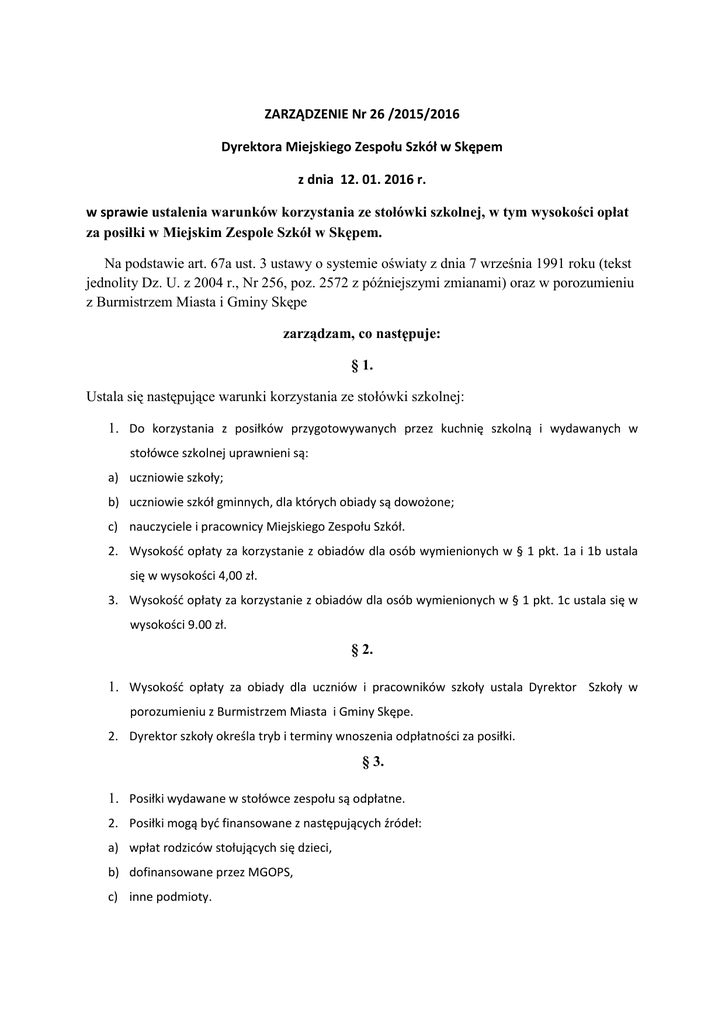 ZARZĄDZENIE Nr 26 /2015/2016 Dyrektora Miejskiego Zespołu Szkół w Skępem z dnia 12. 01. 2016 r. w sprawie ustalenia warunków korzystania ze stołówki szkolnej, w tym wysokości opłat za posiłki w Miejskim Zespole Szkół w Skępem. Na podstawie art. 67a ust. 3 ustawy o systemie oświaty z dnia 7 września 1991 roku (tekst jednolity Dz. U. z 2004 r., Nr 256, poz. 2572 z późniejszymi zmianami) oraz w porozumieniu z Burmistrzem Miasta i Gminy Skępe zarządzam, co następuje: § 1. Ustala się następujące warunki korzystania ze stołówki szkolnej: 1. Do korzystania z posiłków przygotowywanych przez kuchnię szkolną i wydawanych w stołówce szkolnej uprawnieni są: a) uczniowie szkoły; b) uczniowie szkół gminnych, dla których obiady są dowożone; c) nauczyciele i pracownicy Miejskiego Zespołu Szkół. 2. Wysokość opłaty za korzystanie z obiadów dla osób wymienionych w § 1 pkt. 1a i 1b ustala się w wysokości 4,00 zł. 3. Wysokość opłaty za korzystanie z obiadów dla osób wymienionych w § 1 pkt. 1c ustala się w wysokości 9.00 zł. § 2. 1. Wysokość opłaty za obiady dla uczniów i pracowników szkoły ustala Dyrektor Szkoły w porozumieniu z Burmistrzem Miasta i Gminy Skępe. 2. Dyrektor szkoły określa tryb i terminy wnoszenia odpłatności za posiłki. § 3. 1. Posiłki wydawane w stołówce zespołu są odpłatne. 2. Posiłki mogą być finansowane z następujących źródeł: a) wpłat rodziców stołujących się dzieci, b) dofinansowane przez MGOPS, c) inne podmioty. 3. Zmianę wysokości opłat za posiłki dyrektor może wprowadzić w każdym czasie, jeżeli zaistnieje konieczność zmiany po przeanalizowaniu kosztów. 4. Wysokość opłaty za jeden posiłek jest określana w Zarządzeniu Dyrektora Szkoły. 5. Zmiana wysokości opłat za posiłki będzie obowiązywać od pierwszego dnia następnego miesiąca. § 4. 1. Ustala się termin uiszczania opłat za posiłki do 10 dnia każdego miesiąca, którego dotyczy opłata. Po ustalonym terminie uczeń/pracownik korzystający z obiadów, będzie wykreślony z listy żywionych. 2. Opłaty za posiłki uiszcza się na konto szkoły: 77 9546 0004 2001 0000 0521 0001 BS Skępe. § 5. 1. W przypadku nieobecności ucznia/pracownika w szkole uczeń/pracownik korzystający ze stołówki szkolnej otrzymuje zwrot za posiłek. Zwrotowi podlega wysokość opłaty za korzystanie ze stołówki za każdy dzień, z wyłączeniem pierwszego dnia nieobecności, z zastrzeżeniem ust. 2. Zasada ta ma także zastosowanie w przypadku rezygnacji ucznia/pracownika a z korzystania ze stołówki. 2. Nieobecność ucznia/pracownika musi być zgłoszona w sekretariacie szkoły lub u intendenta pisemnie przez rodzica lub pracownika. 3. Dopuszcza się możliwość zwrotu dziennej wysokości opłaty za korzystanie ze stołówki szkolnej przez ucznia/pracownika , za pierwszy dzień nieobecności lub pierwszy dzień rezygnacji, w przypadku gdy nieobecność zostanie zgłoszona nie później niż w ostatnim dniu roboczym poprzedzającym nieobecność lub rezygnację do godz. 8.00. 4. Zwrot za obiady, o którym mowa w ust. 1, dokonuje się w formie odpisu należności za obiady w następnym miesiącu rozliczeniowym. 5. Należna kwota zwrotu, o której mowa w ust. 1, stanowi iloczyn opłaty za jeden obiad i liczby dni nieobecności. 6. Obowiązek zgłaszania nieobecności uczniów uczestniczących w wycieczce szkolnej lub innym zorganizowanym przez szkołę wyjeździe za niewykorzystany posiłek przez ucznia, spoczywa na wychowawcy klasy lub na organizatorze wycieczki/imprezy szkolnej. 7. Zgłoszenie nieobecności, o której mowa w ust. 5 musi nastąpić najpóźniej na 2 dni przed planowaną wycieczką/ imprezą. § 6. 1. Zasady korzystania ze stołówki szkolnej określa szczegółowo Regulamin stanowiący załącznik nr 1 do Zarządzenia. 2. Wzór oświadczenia rodziców o niekorzystaniu przez dziecko z dożywiania stanowi załącznik nr 2 do Zarządzenia. 3. Wzór oświadczenia nauczyciela/pracownika o niekorzystaniu z obiadów stanowi załącznik nr 3 do Zarządzenia. 4. Wzór zgłoszenia wychowawcy o niekorzystaniu przez uczniów z obiadów stanowi załącznik nr 4 do Zarządzenia. § 7. Zmiany do niniejszego Zarządzenia wymagają formy pisemnej. § 8. Zarządzenie wchodzi w życie z dniem podpisania. Załącznik Nr 1 do Zarządzenia nr 26/2015/2016 Dyrektora Miejskiego Zespołu Szkół w Skępem z dnia 12. 01. 2016 r. Regulamin korzystania ze stołówki szkolnej w Miejskim Zespole Szkół w Skępem § 1. Podstawa prawna funkcjonowania stołówki Ustawa z dnia 7 września 1991 r. o systemie oświaty art. 67a (Dz. U. Nr 256, poz. 2572 z 2004 r. z późn. zm.). § 2. Postanowienia ogólne 1. W celu zapewnienia prawidłowej realizacji zadań opiekuńczych, w szczególności wspierania prawidłowego rozwoju uczniów, szkoła prowadzi stołówkę szkolną. 2. Stołówka szkolna funkcjonuje w dni nauki szkolnej. 3. Stołówka nie funkcjonuje w czasie ustawowych dni wolnych od pracy, świąt i przerw w zajęciach szkolnych oraz w dni wolne od zajęć dydaktycznych. 4. Regulamin korzystania ze stołówki określa zasady odpłatności oraz warunki korzystania przez uczniów i nauczycieli szkoły z posiłków wydawanych w stołówce szkolnej. 5. Niniejszy regulamin oraz wszelkie zmiany w nim wprowadzone podane są do publicznej wiadomości w sposób przyjęty przez szkołę. § 3. Uprawnieni do korzystania ze stołówki. 1. Do korzystania z posiłków przygotowywanych w stołówce szkolnej uprawnieni są: a) uczniowie Miejskiego Zespołu Szkół w Skępem wnoszący opłaty indywidualne; b) uczniowie Miejskiego Zespołu Szkół w Skępem, których obiady są refundowane przez ośrodki pomocy społecznej i inne podmioty; c) uczniowie Szkoły Podstawowej w Wólce oraz Szkoły Podstawowej w Czermnie, którzy stosują się do regulaminu obowiązującego w Miejskim Zespole Szkół w Skępem, d) nauczyciele i pracownicy Miejskiego Zespołu Szk