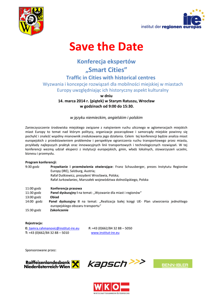 Save the Date Konferecja ekspertów „Smart Cities” Traffic in Cities with historical centres Wyzwania i koncepcje rozwiązań dla mobilności miejskiej w miastach Europy uwzględniając ich historyczny aspekt kulturalny w dniu 14. marca 2014 r. (piątek) w Starym Ratuszu, Wrocław w godzinach od 9:00 do 15:30. w języku niemieckim, angielskim i polskim Zanieczyszczenie środowiska miejskiego związane z natężeniem ruchu ulicznego w aglomeracjach miejskich miast Europy to temat nad którym politycy, organizacje pozarządowe i samorządy miejskie powinny się pochylić i znaleźć wspólny mianownik zredukowania jego działania. Celem tej konferencji będzie analiza miast europejskich z przedstawieniem problemów i perspektyw ograniczenia ruchu transportowego przez miasta, przykłady najlepszych praktyk oraz innowacyjnych linii transportowych i technologicznych rozwiązań. W tej konferencji wezmą udział eksperci z instytucji europejskich, gmin, władz lokalnych, stowarzyszeń uczelni, biznesu i przemysłu. Program konferencji: 9:30 godz Przywitanie i przemówienia otwierające: Franz Schausberger, prezes Instytutu Regionów Europy (IRE), Salzburg, Austria; Rafał Dutkiewicz, prezydent Wrocławia, Polska; Rafał Jurkowlaniec, Marszałek województwa dolnośląskiego, Polska 11:00 godz 11:30 godz 13:00 godz 14:00 godz 15:30 godz Konferencja prasowa Panel dyskusyjny I na temat: „Wyzwanie dla miast i regionów“ Obiad Panel dyskusyjny II na temat: „Realizacja bałej księgi UE- Plan utworzenia jednolitego europejskiego obszaru transportu“ Zakończenie Rejestracja: E: [email protected] T: +43 (0)662/84 32 88 – 5010 Sponsorowane przez: F: +43 (0)662/84 32 88 – 5050 www.institut-ire.eu