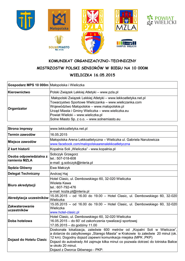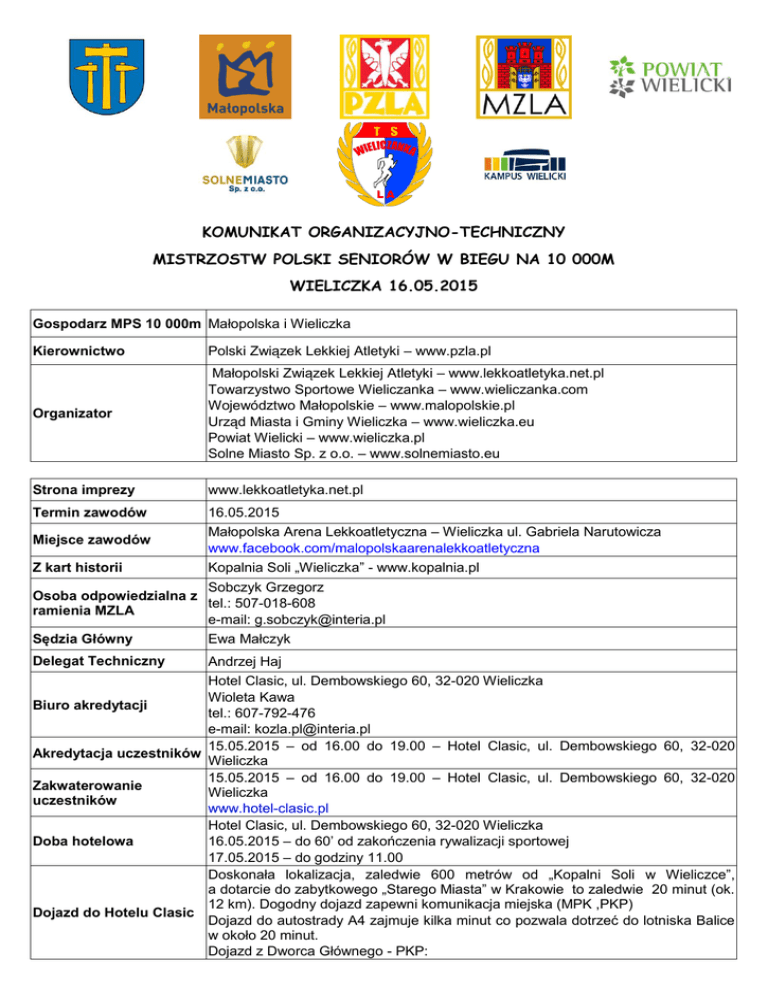 KOMUNIKAT ORGANIZACYJNO-TECHNICZNY MISTRZOSTW POLSKI SENIORÓW W BIEGU NA 10 000M WIELICZKA 16.05.2015 Gospodarz MPS 10 000m Małopolska i Wieliczka Kierownictwo Polski Związek Lekkiej Atletyki – www.pzla.pl Organizator Małopolski Związek Lekkiej Atletyki – www.lekkoatletyka.net.pl Towarzystwo Sportowe Wieliczanka – www.wieliczanka.com Województwo Małopolskie – www.malopolskie.pl Urząd Miasta i Gminy Wieliczka – www.wieliczka.eu Powiat Wielicki – www.wieliczka.pl Solne Miasto Sp. z o.o. – www.solnemiasto.eu Strona imprezy www.lekkoatletyka.net.pl Termin zawodów 16.05.2015 Małopolska Arena Lekkoatletyczna – Wieliczka ul. Gabriela Narutowicza Miejsce zawodów www.facebook.com/malopolskaarenalekkoatletyczna Z kart historii Kopalnia Soli „Wieliczka” - www.kopalnia.pl Sobczyk Grzegorz Osoba odpowiedzialna z tel.: 507-018-608 ramienia MZLA e-mail: [email protected] Sędzia Główny Ewa Małczyk Delegat Techniczny Andrzej Haj Hotel Clasic, ul. Dembowskiego 60, 32-020 Wieliczka Wioleta Kawa Biuro akredytacji tel.: 607-792-476 e-mail: [email protected] 15.05.2015 – od 16.00 do 19.00 – Hotel Clasic, ul. Dembowskiego 60, 32-020 Akredytacja uczestników Wieliczka 15.05.2015 – od 16.00 do 19.00 – Hotel Clasic, ul. Dembowskiego 60, 32-020 Zakwaterowanie Wieliczka uczestników www.hotel-clasic.pl Hotel Clasic, ul. Dembowskiego 60, 32-020 Wieliczka Doba hotelowa 16.05.2015 – do 60’ od zakończenia rywalizacji sportowej 17.05.2015 – do godziny 11.00 Doskonała lokalizacja, zaledwie 600 metrów od „Kopalni Soli w Wieliczce”, a dotarcie do zabytkowego „Starego Miasta” w Krakowie to zaledwie 20 minut (ok. 12 km). Dogodny dojazd zapewni komunikacja miejska (MPK ,PKP) Dojazd do Hotelu Clasic Dojazd do autostrady A4 zajmuje kilka minut co pozwala dotrzeć do lotniska Balice w około 20 minut. Dojazd z Dworca Głównego - PKP: Projekt - wyżywienie uczestników z przystanku Dworzec Główny do przystanku Wieliczka Park Dojazd z Dworca Głównego - MPK: 304 autobus (z przystanku Dworzec Główny Zachód do Wieliczka Kościół) Dojazd z lotniska Balice - MPK: 292 autobus (z przystanku Kraków Airport do przystanku Cracovia) i dalej 304 autobus ( z przystanku Cracovia do przystanku Wieliczka Kościół) Hotel Clasic, ul. Dembowskiego 60, 32-020 Wieliczka 15.05.2015 Kolacja 18.00-20.00 16.05.2015: Śniadanie 08.00-09.00 Obiad 13.00-14.00 Kolacja 17.00-18.00 – propozycja Obowiązuje wyłącznie system zgłoszeń elektronicznych, który wraz z instrukcją zamieszczony jest pod adresem: http://www.domtel-sport.pl/zgłoszenia/. System zgłoszeń otwarty jest od dnia 4.05.2015 r. do godz. 20.00 w dniu 12.05.2015 r. Zgłoszenie Biuro zawodów Weryfikacja Procedura weryfikacji Dojazd do miejsca rywalizacji Uroczyste Otwarcie Prawo udziału w Mistrzostwach Polski posiadają zawodnicy, którzy posiadają ważną licencję PZLA oraz uzyskali w latach 2014-2015 następujące minima: kobiety – 39:00.00; mężczyźni – 31:30.00 Hotel Clasic, ul. Dembowskiego 60, 32-020 Wieliczka Małgorzata Mędrecka tel.: 509-879-076 e-mail: [email protected] 15.05.2015 – od 16.00 do 20.00 – Hotel Clasic, ul. Dembowskiego 60, 32-020 Wieliczka 16.05.2015 – od 14.00 do 15.00 – Hotel Clasic, ul. Dembowskiego 60, 32-020 Wieliczka Procedura weryfikacji: A. Część sportowa Kierownicy otrzymują przy weryfikacji sportowej: komunikat organizacyjno-techniczny program minutowy B. Część organizacyjna Kierownicy odpowiedzialni za sprawy organizacyjne otrzymują: skierowanie na zakwaterowanie kartki żywieniowe Doskonała lokalizacja, zaledwie 600 metrów od „Kopalni Soli w Wieliczce”, a dotarcie do zabytkowego „Starego Miasta” w Krakowie to zaledwie 20 minut (ok. 12 km). Dogodny dojazd zapewni komunikacja miejska (MPK, PKP) Dojazd do autostrady A4 zajmuje kilka minut co pozwala dotrzeć do lotniska Balice w około 20 minut. Dojazd z Dworca Głównego - PKP: z przystanku Dworzec Główny do przystanku Wieliczka Park Dojazd z Dworca Głównego - MPK: 304 autobus (z przystanku Dworzec Główny Zachód do Wieliczka Kościół) Dojazd z lotniska Balice - MPK: 292 autobus (z przystanku Kraków Airport do przystanku Cracovia) i dalej 304 autobus ( z przystanku Cracovia do przystanku Wieliczka Kościół) 16.05.2015 – 19.00 (do 15’) – Małopolska Arena Lekkoatletyczna – Wieliczka ul. Gabriela Narutowicza Nagrody regulaminowe Małopolska Arena Lekkoatletyczna – Wieliczka ul. Gabriela Narutowicza Zawodnicy i drużyny, które zajęły miejsca 1-3 zapraszamy do Biura Dekoracji. Zbiórka do dekoracji odbywać się będzie według harmonogramu - bardzo prosimy o punktualność. Do dekoracji zapraszamy Trenera złotego medalisty. Zawodnicy i drużyny, którzy zajęli miejsca 1-3 otrzymują medale. Opieka medyczna Podczas zawodów czynny będzie punkt medyczny. Rozgrzewka Dekoracje medalistów Parkingi Przed Hotelem Clasic, ul. Dembowskiego 60, 32-020 Wieliczka. Przy Małopolskiej Arenie Lekkoatletycznej - Biedronka Parkingi w Wieliczce: www.wieliczkacity.pl/dzialy/wieliczka/parkingi-w-wieliczce