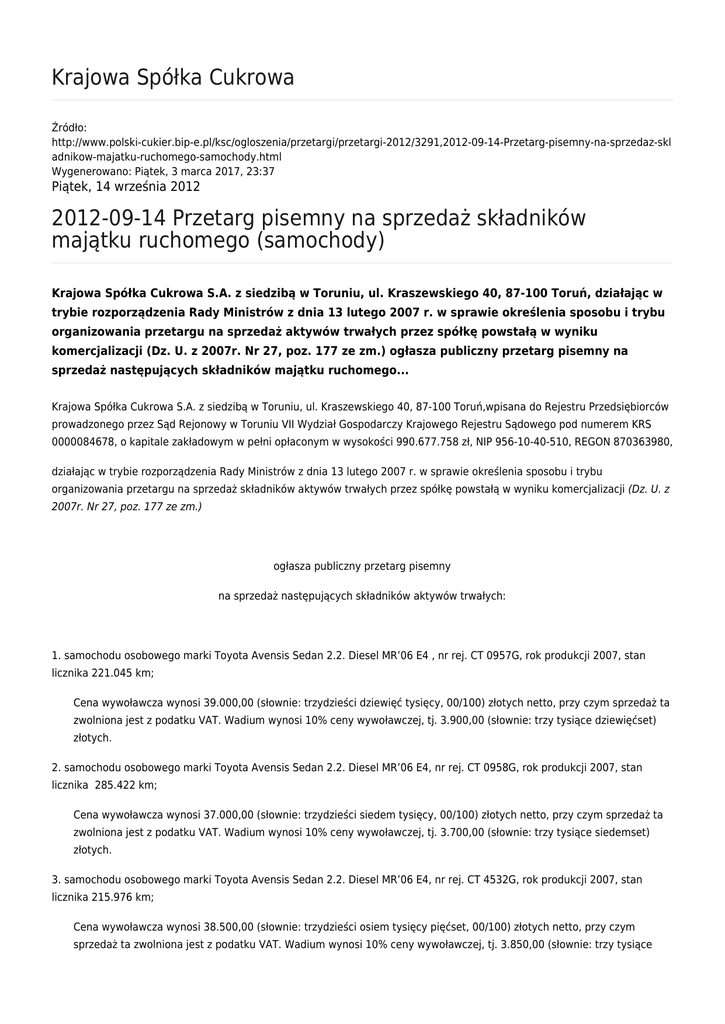 Krajowa Spółka Cukrowa Źródło: http://www.polski-cukier.bip-e.pl/ksc/ogloszenia/przetargi/przetargi-2012/3291,2012-09-14-Przetarg-pisemny-na-sprzedaz-skl adnikow-majatku-ruchomego-samochody.html Wygenerowano: Piątek, 3 marca 2017, 23:37 Piątek, 14 września 2012 2012-09-14 Przetarg pisemny na sprzedaż składników majątku ruchomego (samochody) Krajowa Spółka Cukrowa S.A. z siedzibą w Toruniu, ul. Kraszewskiego 40, 87-100 Toruń, działając w trybie rozporządzenia Rady Ministrów z dnia 13 lutego 2007 r. w sprawie określenia sposobu i trybu organizowania przetargu na sprzedaż aktywów trwałych przez spółkę powstałą w wyniku komercjalizacji (Dz. U. z 2007r. Nr 27, poz. 177 ze zm.) ogłasza publiczny przetarg pisemny na sprzedaż następujących składników majątku ruchomego... Krajowa Spółka Cukrowa S.A. z siedzibą w Toruniu, ul. Kraszewskiego 40, 87-100 Toruń,wpisana do Rejestru Przedsiębiorców prowadzonego przez Sąd Rejonowy w Toruniu VII Wydział Gospodarczy Krajowego Rejestru Sądowego pod numerem KRS 0000084678, o kapitale zakładowym w pełni opłaconym w wysokości 990.677.758 zł, NIP 956-10-40-510, REGON 870363980, działając w trybie rozporządzenia Rady Ministrów z dnia 13 lutego 2007 r. w sprawie określenia sposobu i trybu organizowania przetargu na sprzedaż składników aktywów trwałych przez spółkę powstałą w wyniku komercjalizacji (Dz. U. z 2007r. Nr 27, poz. 177 ze zm.) ogłasza publiczny przetarg pisemny na sprzedaż następujących składników aktywów trwałych: 1. samochodu osobowego marki Toyota Avensis Sedan 2.2. Diesel MR’06 E4 , nr rej. CT 0957G, rok produkcji 2007, stan licznika 221.045 km; Cena wywoławcza wynosi 39.000,00 (słownie: trzydzieści dziewięć tysięcy, 00/100) złotych netto, przy czym sprzedaż ta zwolniona jest z podatku VAT. Wadium wynosi 10% ceny wywoławczej, tj. 3.900,00 (słownie: trzy tysiące dziewięćset) złotych. 2. samochodu osobowego marki Toyota Avensis Sedan 2.2. Diesel MR’06 E4, nr rej. CT 0958G, rok produkcji 2007, stan licznika 285.422 km; Cena wywoławcza wynosi 37.000,00 (słownie: trzydzieści siedem tysięcy, 00/100) złotych netto, przy czym sprzedaż ta zwolniona jest z podatku VAT. Wadium wynosi 10% ceny wywoławczej, tj. 3.700,00 (słownie: trzy tysiące siedemset) złotych. 3. samochodu osobowego marki Toyota Avensis Sedan 2.2. Diesel MR’06 E4, nr rej. CT 4532G, rok produkcji 2007, stan licznika 215.976 km; Cena wywoławcza wynosi 38.500,00 (słownie: trzydzieści osiem tysięcy pięćset, 00/100) złotych netto, przy czym sprzedaż ta zwolniona jest z podatku VAT. Wadium wynosi 10% ceny wywoławczej, tj. 3.850,00 (słownie: trzy tysiące osiemset pięćdziesiąt) złotych. 4. samochodu osobowego marki Toyota Avensis Sedan MR’03 E4, nr rej. CT 9589C, rok produkcji 2005, stan licznika 214.562 km; Cena wywoławcza wynosi 23.000,00 (słownie: dwadzieścia trzy tysiące, 00/100) złotych netto, przy czym sprzedaż ta zwolniona jest z podatku VAT. Wadium wynosi 10% ceny wywoławczej, tj. 2.300,00 (słownie: dwa tysiące trzysta) złotych. 5. samochodu osobowego marki Toyota Avensis Sedan MR’06 E4, nr rej. CT 8290F, rok produkcji 2006, stan licznika 229.436 km; Cena wywoławcza wynosi 28.000,00 (słownie: dwadzieścia osiem tysięcy, 00/100) złotych netto, przy czym sprzedaż ta zwolniona jest z podatku VAT. Wadium wynosi 10% ceny wywoławczej, tj. 2.800,00 (słownie: dwa tysiące osiemset) złotych. 6. samochodu osobowego marki Toyota Avensis Sedan MR’03 E4, nr rej. CT 9591C, rok produkcji 2005, stan licznika 219.392 km; Cena wywoławcza wynosi 24.500,00 (słownie: dwadzieścia cztery tysiące pięćset, 00/100) złotych netto, przy czym sprzedaż ta zwolniona jest z podatku VAT. Wadium wynosi 10% ceny wywoławczej, tj. 2.450,00 (słownie: dwa tysiące czterysta pięćdziesiąt) złotych. 7. samochodu osobowego marki Toyota Avensis Sedan MR’03 E4, nr rej. CT 9852E, rok produkcji 2005, stan licznika 219.564 km; Cena wywoławcza wynosi 24.000,00 (słownie: dwadzieścia cztery tysiące, 00/100) złotych netto, przy czym sprzedaż ta zwolniona jest z podatku VAT. Wadium wynosi 10% ceny wywoławczej, tj. 2.400,00 (słownie: dwa tysiące czterysta) złotych. 8. samochodu osobowego marki Toyota Avensis Liftback MR’06 E4, nr rej. GMB 51RA, rok produkcji 2006, stan licznika 200.418 km; Cena wywoławcza wynosi 27.000,00 (słownie: dwadzieścia siedem tysięcy, 00/100) złotych netto, przy czym sprzedaż ta zwolniona jest z podatku VAT. Wadium wynosi 10% ceny wywoławczej, tj. 2.700,00 (słownie: dwa tysiące siedemset) złotych. Oferent może złożyć ofertę dotyczącą jednego lub większej liczby ww. składników aktywów trwałych. Pisemne oferty należy składać w terminie do dnia 08.10.2012 r. do godz. 10:00 w siedzibie Krajowej Spółki Cukrowej S.A. przy ul. Kraszewskiego 40 w Toruniu, w Kancelarii Ogólnej w zamkniętej, nieuszkodzonej kopercie z adnotacją „przetarg pisemny dnia 08.10.2012 r. – sprzedaż samochodów osobowych – nie otwierać” oraz z podaniem telefonu kontaktowego do Oferenta. Otwarcie ofert nastąpi w dniu 08.10.2012 r. o godz. 11:00, w siedzibie Krajowej Spółki Cukrowej S.A. W otwarciu ofert wezmą udział wyłącznie przedstawiciele Krajowej Spółki Cukrowej S.A. Oferta powinna zawierać: - imię, nazwisko i adres lub firmę i siedzibę Oferenta wraz z numerem telefonu kontaktowego, - datę sporządzenia oferty, - wskazanie składnika aktywów trwałych (składników aktywów trwałych), którego dotyczy wraz z oferowaną ceną, - dowód wniesienia wadium, - oświadczenie Oferenta, że zapoznał się ze stanem przedmiotu przetargu oraz oświadczenie Oferenta, iż nie wnosi on zastrzeżeń, co do warunków przetargu, - aktualny odpis z właściwego rejestru lub zaświadczenie o wpisie do ewidencji działalności gospodarczej, - zaświadczenie o numerze REGON, decyzję o nadaniu NIP, - w przypadku działania Oferenta przez pełnomocnika 