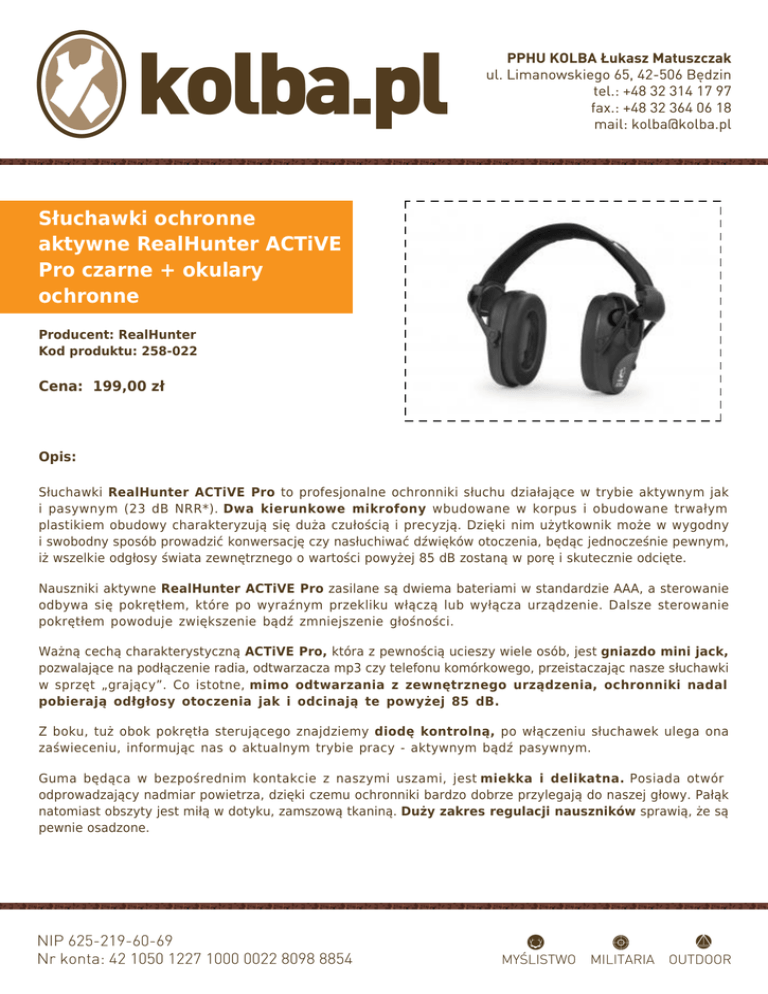 Słuchawki ochronne aktywne RealHunter ACTiVE Pro czarne + okulary ochronne Producent: RealHunter Kod produktu: 258-022 Cena: 199,00 zł Opis: Słuchawki RealHunter ACTiVE Pro to profesjonalne ochronniki słuchu działające w trybie aktywnym jak i pasywnym (23 dB NRR*). Dwa kierunkowe mikrofony wbudowane w korpus i obudowane trwałym plastikiem obudowy charakteryzują się duża czułością i precyzją. Dzięki nim użytkownik może w wygodny i swobodny sposób prowadzić konwersację czy nasłuchiwać dźwięków otoczenia, będąc jednocześnie pewnym, iż wszelkie odgłosy świata zewnętrznego o wartości powyżej 85 dB zostaną w porę i skutecznie odcięte. Nauszniki aktywne RealHunter ACTiVE Pro zasilane są dwiema bateriami w standardzie AAA, a sterowanie odbywa się pokrętłem, które po wyraźnym przekliku włączą lub wyłącza urządzenie. Dalsze sterowanie pokrętłem powoduje zwiększenie bądź zmniejszenie głośności. Ważną cechą charakterystyczną ACTiVE Pro, która z pewnością ucieszy wiele osób, jest gniazdo mini jack, pozwalające na podłączenie radia, odtwarzacza mp3 czy telefonu komórkowego, przeistaczając nasze słuchawki w sprzęt „grający”. Co istotne, mimo odtwarzania z zewnętrznego urządzenia, ochronniki nadal pobierają odłgłosy otoczenia jak i odcinają te powyżej 85 dB. Z boku, tuż obok pokrętła sterującego znajdziemy diodę kontrolną, po włączeniu słuchawek ulega ona zaświeceniu, informując nas o aktualnym trybie pracy - aktywnym bądź pasywnym. Guma będąca w bezpośrednim kontakcie z naszymi uszami, jest miekka i delikatna. Posiada otwór odprowadzający nadmiar powietrza, dzięki czemu ochronniki bardzo dobrze przylegają do naszej głowy. Pałąk natomiast obszyty jest miłą w dotyku, zamszową tkaniną. Duży zakres regulacji nauszników sprawią, że są pewnie osadzone. RealHunter ACTiVE Pro na pewno zwróci uwagę myśliwych, strzelców sportowych oraz pracowników służb mundurowych mających na co dzień do czynienia z bronią długą, a wszystko to za sprawą wąskiego profilu słuchawek przygotowanego specjalnie pod bakę. Wraz ze słuchawki klient otrzymuje również okulary ochronne Protect posiadające standard ANSI. Grube szkła wykonane z przeźroczystego nie niezniekształcającego obraz tworzywa skutecznie chronią wzrok w kryzysowych sytuacjach. Trwałość i odporność szkieł potwierdził nasz test – bezpośredni strzał śrutem ostrym z karabinka pneumatycznego o energi 17J z odległości 1 metra, nie przebił szkieł okularów RealHunter. Należy również wspomnieć o 3 stopniowej regulacji zauszników i miękkim gumowym poduszkom na nos. Słuchawki ochronne RealHunter ACTiVE Pro dostępne są w kolorach: ● ● ● czarnym oliwkowym pomarańczowym Cechy charakterystyczne ACTiVE Pro: ● ● ● ● ● tryb pracy pasywny (23 dB NRR*) i aktywny ( odcięcie powyżej 85 dB) dwa, trwale osadzone mikrofony kierunkowe gniazdo mini jack do podpięcia zewnętrznego urządzenia (przewód w zestawie) dioda informująca o aktualnym trybie pracy urządzenia boczny profil pod bakę Dane techniczne: ● ● ● ● współczynnik redukcji hałasu NRR*: 23 dB odcięcie dźwięków powyżej: 85 dB zasilanie: 2 x AAA (brak w zestawie) waga: 272 gram (bez baterii) Gwarancja 24 miesiące. *NRR – Noise Reduction Rating – po polsku wskaźnik redukcji hałasu, oznacza przybliżony poziom redukcji hałasu uzyskiwany dzięki ochronnikowi, wyrażony w dB.