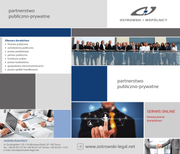 partnerstwo publiczno-prywatne Obszary doradztwa: • finanse publiczne; • zamówienia publiczne; • prawo podatkowe; • pomoc publiczna; • fundusze unijne; • prawo budowlane; • gospodarka nieruchomościami; • prawo spółek handlowych; partnerstwo publiczno-prywatne SERWIS ONLINE Nowoczesne doradztwo siedziba Kancelarii ul. Grudziądzka 110-114 (Business Park), 87-100 Toruń tel.: +48 56 651 07 93 +48 56 651 07 94 fax: +48 56 621 13 81 e-mail: [email protected] www.ostrowski-legal.net partnerstwo publiczno-prywatne Czynności doradztwa: • ekspertyzy i konsultacje - obejmujące weryfikację zamierzeń partnera publicznego w szczególności pod kątem finansów publicznych, pomocy publicznej, prawa podatkowego i funduszy unijnych oraz wskazówki w zakresie wyboru optymalnej koncepcji realizacji zadania publicznego w formule partnerstwa publiczno-prywatnego, koncesji na roboty budowlane lub usługi albo w innej dopuszczalnej formule prawnej; • podział zadań i ryzyk - wsparcie prawne przy podejmowaniu decyzji o podziale zadań i ryzyk pomiędzy podmiotem publicznym i partnerem prywatnym; • kryteria oceny ofert - pomoc w zakresie ustalenia kryteriów ocen na podstawie, których ma zastać wybrany partner prywatny; • dokumentacja postępowania - przygotowywanie/weryfikacja dokumentacji w zakresie wyboru partnera prywatnego przetargowej (ogłoszenie), SIWZ, istotnych postanowień umowy/projektów umów; • negocjacje z partnerami prywatnymi - wsparcie prawne podczas etapu prowadzeniu negocjacji z partnerami prywatnymi w zakresie ustalenia ostatecznej treści warunków realizacji przedsięwzięcia oraz wyboru partnera prywatnego; • umowa o partnerstwie prywatno-publicznym/koncesji na roboty budowlane lub usługi - przygotowanie ostatecznej wersji umowy po zakończeniu etapu negocjacji; • Partnerstwo publiczno-prywatne w formie spółki - przygotowanie umowy spółki oraz jej rejestracja w KRS; • opinie, konsultacje - udzielanie porad i wyjaśnień w trakcie realizacji inwestycji a następnie na etapie eksploatacji powstałego obiektu przez partnera prywatnego; • reprezentacja w postępowaniu sądowym w ewentualnych sporach pomiędzy partnerami realizującymi przedsięwzięcia w ramach partnerstwa publiczno-prywatnego; świadczenie pomocy prawnej odbywa się w formie dyżurów w siedzibie jednostki według zapotrzebowania - poza dyżurami stały kontakt telefoniczny i mailowy (możliwy również kontakt w trybie konferencji audio/wideo);