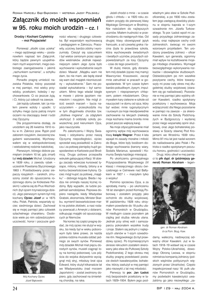 Roman Marceli Bąk-Bąkowski – weteran Jazdy Polskiej Załącznik do moich wspomnień w 95. roku moich urodzin – cz. I Drodzy i Kochani Czytelnicy – moi Przyjaciele! Ponieważ „słodki czas ucieka” – mego sędziwego wieku – postanowiłem napisać ten Załącznik, który będzie pewnym uzupełnieniem mych wspomnień, mego osobistego zaangażowania i jakimś „rachunkiem sumienia”, u schyłku mego życia. Ponadto pragnę umieścić nazwiska Polaków, którzy pozostali w mej pamięci, moi wielcy przywódcy, przełożeni, koledzy i wychowankowie. Ci co jeszcze żyją, i Ci, którzy już odeszli na zawsze. Jak każdy człowiek, tak i ja miałem pewne wzloty i upadki. U schyłku mego życia patrzę innymi oczami na otaczający świat i ludzi mej Ojczyzny. Dla przypomnienia dodaję, że urodziłem się 26 kwietnia 1910 roku w m. Zakrocz pow. Rypin pod zaborem rosyjskim, ówczesnej tzw. guberni warszawskiej. Wychowywałem się w wielopokoleniowej i wielodzietnej rodzinie katolickiej. Pierwszym, którego dobrze pamiętam (miałem 10 lat, gdy zmarł) był mój dziadek Michał. Urodzony w 1839 roku, z zawodu rybak – uczestnik Powstania Styczniowego 1863 r. Prześladowany przez siepaczy rosyjskich – carskich, zmuszony został do opuszczenia rodzinnego domu (w Królestwie Polskim) i udania się do Prus Wschodnich (był ojcem trzynaściorga dzieci). Jego pierwszym synem był mój kochany Ojciec Józef ur. w 1875 roku. Polak, Patriota, wspaniały ojciec siedmiorga dzieci. Zachował się w mojej pamięci jako człowiek szlachetnego charakteru. Osobiście wiele po nim odziedziczyłem: uczciwość, honor i poczucie god- Mój Kochany Ojciec Józef Bąkowski 24 ności własnej i drugiego człowieka. Był wspaniałym wychowawcą i pedagogiem w Zakroczu. Pracowity, uczciwy, bardzo zdolny i wyrozumiały. Cieszył się szacunkiem i był wielce cenionym przez sąsiadów wieśniaków. Jednak najważniejszym celem Jego życia było wychowanie i wykształcenie swych dzieci. Mawiał: „Majątku wam nie dam, bo nie mam, ale będę starał się wam dać majątek niezniszczalny – wykształcenie.” Sam nie posiadał wykształcenia – był samoukiem. Mimo tego władał biegle w mowie i piśmie językiem niemieckim i rosyjskim. Nie mógł ziścić swoich marzeń – bycia nauczycielem – przeszkodziła mu w tym długotrwała choroba tzw. „złośliwa migrena”. Ja zdążyłem ukończyć 3 oddziały szkoły powszechnej pod kierunkiem Ojca, jako nauczyciela. Po zakończeniu I Wojny Światowej i odzyskaniu przez naszą Ojczyznę niepodległości, ojciec sprzedał swą posiadłość w Zakroczu i za połowę pieniędzy kupił gospodarstwo w Karbowie pod Brodnicą. Druga połowa przepadła wskutek galopującej inflacji. W obiegu zaczęły wówczas kursować tysiące, miliony, miliardy, biliony a w końcu bezwartościowe tryliony. Ojciec mógł kupić za połowę „majątku” – dobrego koguta. Bieda i nędza nie ominęła naszej licznej rodziny. Były wypadki, że ludzie popełniali samobójstwa. Poprawa dopiero nastąpiła, kiedy Władysław Grabski, ekonomista, Minister Skarbu, wymienił bezwartościowe marki na polskie złotówki, a nasi rodacy powracali z Ameryki z dolarami, odkupując majątki od opuszczających je Niemców. Na koniec tej części pragnę dodać, że mój ojciec nie służył w wojsku, bo kiedy był w wieku poborowym było takie prawo, że każda polska rodzina musiała oddać jednego ze swych synów. Ponieważ mój dziadek Michał miał pięciu dorosłych synów, musieli ciągnąć losy na komisji poborowej. Los pójścia do wojska dożywotnio wyciągnął mój stryj, młodszy brat ojca Edward, który służył kilkanaście lat we Władywostoku (nad morzem Japońskim) – został zwolniony dopiero, gdy zachorował na śmiertelną chorobę, na raka. Jeżeli chodzi o mnie – w czasie głodu i chłodu – w 1920 roku zostałem przyjęty do pierwszej klasy Męskiego Gimnazjum w Brodnicy. Nie należałem do najlepszych uczniów. Miałem trudności w przechodzeniu do następnych klas. Od drugiej klasy obowiązywał język francuski, a od czwartej greka i łacina (była to prawdziwa szkoła, która wychowywała świadomych i światłych uczniów, przyszłych odpowiedzialnych za losy Ojczyzny – czas do tego powrócić!). W dużej mierze, gdy dorastałem mój dziadek (ojciec mej mamy) Wawrzyniec Kraszewski, zaczął mnie zatrudniać w pracach w gospodarstwie. W tym czasie byłem bardzo pobudliwym, żywym, impulsywnym i niepoprawnym chłopcem, potem młodzieńcem. Otrzymywałem kary cielesne w szkole od nauczycieli i w domu od ojca, który był wobec mnie rygorystycznym i surowym za moje nieodpowiednie zachowanie na lekcjach (niekiedy moja kochana mama broniła mnie przed jeszcze większą karą). Na moje zdyscyplinowanie miał ogromny wpływ mój wychowawca klasy ksiądz Wagner. Przez 4 lata wpajał mi zasady moralne i miłość do Boga, które były bodźcem dobrego wychowania (kanony wiary, Sodalis Marianus, spowiedź i Komunia Święta każdego miesiąca). Po ukończeniu gimnazjalnego Przysposobienia Wojskowego (VI klasa) i miesięcznego obozu ćwiczebnego w Cetniewie nad Bałtykiem w 1927 r. – marzyłem tylko o wojsku! Pomimo sprzeciwu Ojca, a za aprobatą mamy – po ukończeniu 18 lat stanąłem przed Komisją Poborową i zostałem przyjęty jako ochotnik do służby wojskowej. W październiku 1928 roku otrzymałem powołanie do 18 pułku ułanów Pomorskich w Grudziądzu. W niedługim czasie poznałem jak ciężką jest służba rekruta ułana. Jednak przy silnej woli i samozaparciu pokonałem wszelkie trudy i znoje. Stałem się jednym z najlepszych ułanów w 1-szym szwadronie rtm. Niegowskiego (to był prawdziwy ojciec). Po trzymiesięcznym okresie rekruckim zostałem skierowany jako elew do Pułkowej Szkoły Podoficerskiej. Z tego okresu mej służby pragnę przedstawić postacie dwóch kawalerzystów, bohaterów, którzy zasłużyli w mej pamięci jako niezwykli z l