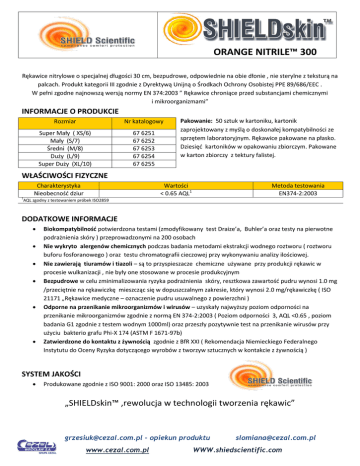 ORANGE NITRILE™ 300 Rękawice nitrylowe o specjalnej długości 30 cm, bezpudrowe, odpowiednie na obie dłonie , nie sterylne z teksturą na palcach. Produkt kategorii III zgodnie z Dyrektywą Unijną o Środkach Ochrony Osobistej PPE 89/686/EEC . W pełni zgodne najnowszą wersją normy EN 374:2003 ” Rękawice chroniące przed substancjami chemicznymi i mikroorganizmami” INFORMACJE O PRODUKCIE Rozmiar Nr katalogowy Super Mały ( XS/6) Mały (S/7) Średni (M/8) Duży (L/9) Super Duży (XL/10) 67 6251 67 6252 67 6253 67 6254 67 6255 Pakowanie: 50 sztuk w kartoniku, kartonik zaprojektowany z myślą o doskonałej kompatybilności ze sprzętem laboratoryjnym. Rękawice pakowane na płasko. Dziesięd kartoników w opakowaniu zbiorczym. Pakowane w karton zbiorczy z tektury falistej. WŁAŚCIWOŚCI FIZYCZNE Charakterystyka Nieobecnośd dziur Wartości < 0.65 AQL1 Metoda testowania EN374-2:2003 1 AQL zgodny z testowaniem próbek ISO2859 DODATKOWE INFORMACJE Biokompatybilnośd potwierdzona testami (zmodyfikowany test Draize’a, Buhler’a oraz testy na pierwotne podrażnienia skóry ) przeprowadzonymi na 200 osobach Nie wykryto alergenów chemicznych podczas badania metodami ekstrakcji wodnego roztworu ( roztworu buforu fosforanowego ) oraz testu chromatografii cieczowej przy wykonywaniu analizy ilościowej. Nie zawierają tiuramów i tiazoli – są to przyspieszacze chemiczne używane przy produkcji rękawic w procesie wulkanizacji , nie były one stosowane w procesie produkcyjnym Bezpudrowe w celu zminimalizowania ryzyka podrażnienia skóry, resztkowa zawartośd pudru wynosi 1.0 mg /przeciętnie na rękawiczkę mieszcząc się w dopuszczalnym zakresie, który wynosi 2.0 mg/rękawiczkę ( ISO 21171 „Rękawice medyczne – oznaczenie pudru usuwalnego z powierzchni ) Odporne na przenikanie mikroorganizmów i wirusów – uzyskały najwyższy poziom odporności na przenikanie mikroorganizmów zgodnie z normą EN 374-2:2003 ( Poziom odporności 3, AQL <0.65 , poziom badania G1 zgodnie z testem wodnym 1000ml) oraz przeszły pozytywnie test na przenikanie wirusów przy użyciu bakterio grafu Phi-X 174 (ASTM F 1671-97b) Zatwierdzone do kontaktu z żywnością zgodnie z BfR XXI ( Rekomendacja Niemieckiego Federalnego Instytutu do Oceny Ryzyka dotyczącego wyrobów z tworzyw sztucznych w kontakcie z żywnością ) SYSTEM JAKOŚCI Produkowane zgodnie z ISO 9001: 2000 oraz ISO 13485: 2003 „SHIELDskin™ ,rewolucja w technologii tworzenia rękawic” [email protected] – opiekun produktu www.cezal.com.pl [email protected] WWW.shiedscientific.com
