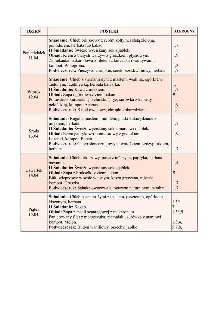 DZIEŃ POSIŁKI Śniadanie: Chleb orkiszowy z serem żółtym, sałatą zieloną, pomidorem, herbata lub kakao. II Śniadanie: Świeżo wyciskany sok z jabłek. Poniedziałek Obiad: Krem z białych warzyw z groszkiem ptysiowym. 11.04. Zapiekanka makaronowa z filetem z kurczaka i warzywami, kompot. Winogrona. Podwieczorek: Pieczywo chrupkie, serek brzoskwiniowy, herbata. Wtorek 12.04. Środa 13.04. Czwartek 14.04. Piątek 15.04. Śniadanie: Chleb z ziarnami dyni z masłem, wędliną, ogórkiem zielonym, rzodkiewką, herbata bawarka. II Śniadanie: Kawa z mlekiem. Obiad: Zupa ogórkowa z ziemniakami. Potrawka z kurczaka "po chińsku", ryż, surówka z kapusty pekińskiej, kompot. Ananas Podwieczorek: Kisiel owocowy, chrupki kukurydziane. Śniadanie: Rogal z masłem i miodem, płatki kukurydziane z mlekiem, herbata. II Śniadanie: Świeżo wyciskany sok z marchwi i jabłek. Obiad: Krem paprykowo-pomidorowy z grzankami. Łazanki, kompot. Banan. Podwieczorek: Chleb słonecznikowy z twarożkiem, szczypiorkiem, herbata. Śniadanie: Chleb orkiszowy, pasta z tuńczyka, papryka, herbata bawarka. II Śniadanie: Świeżo wyciskany sok z jabłek. Obiad: Zupa z brukselki z ziemniakami. Bitki wieprzowe w sosie własnym, kasza gryczana, mizeria, kompot. Gruszka. Podwieczorek: Sałatka owocowa z jogurtem naturalnym, herabata. Śniadanie: Chleb pszenno-żytni z masłem, pasztetem, ogórkiem kiszonym, herbata. II Śniadanie: Kakao. Obiad: Zupa z fasoli szparagowej z makaronem. Panierowany filet z morszczuka, ziemniaki, surówka z marchwi, kompot. Melon. Podwieczorek: Budyń waniliowy, orzechy, jabłko. ALERGENY 1,7, 1,9 1,3 1,7 1, 1,7 9 1,9 1, 1,7 1,9 1, 1,7 1,4, 9 1,7 1,7 1,3* 7 1,3*,9 1,3,4, 5,7,8,