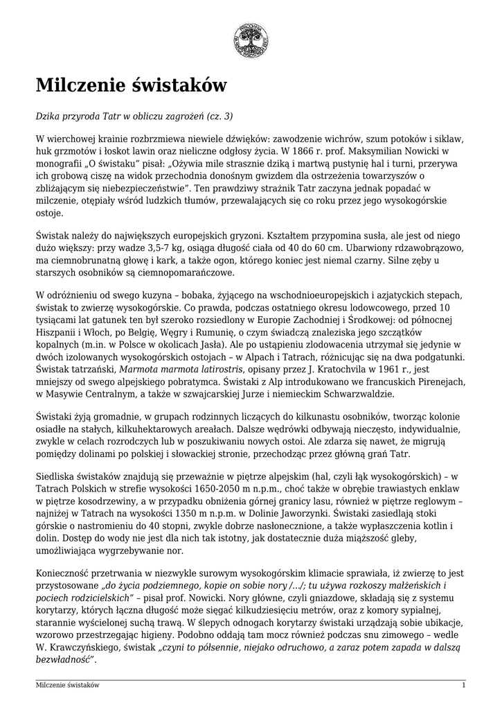 Milczenie świstaków Dzika przyroda Tatr w obliczu zagrożeń (cz. 3) W wierchowej krainie rozbrzmiewa niewiele dźwięków: zawodzenie wichrów, szum potoków i siklaw, huk grzmotów i łoskot lawin oraz nieliczne odgłosy życia. W 1866 r. prof. Maksymilian Nowicki w monografii „O świstaku” pisał: „Ożywia mile strasznie dziką i martwą pustynię hal i turni, przerywa ich grobową ciszę na widok przechodnia donośnym gwizdem dla ostrzeżenia towarzyszów o zbliżającym się niebezpieczeństwie”. Ten prawdziwy strażnik Tatr zaczyna jednak popadać w milczenie, otępiały wśród ludzkich tłumów, przewalających się co roku przez jego wysokogórskie ostoje. Świstak należy do największych europejskich gryzoni. Kształtem przypomina susła, ale jest od niego dużo większy: przy wadze 3,5-7 kg, osiąga długość ciała od 40 do 60 cm. Ubarwiony rdzawobrązowo, ma ciemnobrunatną głowę i kark, a także ogon, którego koniec jest niemal czarny. Silne zęby u starszych osobników są ciemnopomarańczowe. W odróżnieniu od swego kuzyna – bobaka, żyjącego na wschodnioeuropejskich i azjatyckich stepach, świstak to zwierzę wysokogórskie. Co prawda, podczas ostatniego okresu lodowcowego, przed 10 tysiącami lat gatunek ten był szeroko rozsiedlony w Europie Zachodniej i Środkowej: od północnej Hiszpanii i Włoch, po Belgię, Węgry i Rumunię, o czym świadczą znaleziska jego szczątków kopalnych (m.in. w Polsce w okolicach Jasła). Ale po ustąpieniu zlodowacenia utrzymał się jedynie w dwóch izolowanych wysokogórskich ostojach – w Alpach i Tatrach, różnicując się na dwa podgatunki. Świstak tatrzański, Marmota marmota latirostris, opisany przez J. Kratochvila w 1961 r., jest mniejszy od swego alpejskiego pobratymca. Świstaki z Alp introdukowano we francuskich Pirenejach, w Masywie Centralnym, a także w szwajcarskiej Jurze i niemieckim Schwarzwaldzie. Świstaki żyją gromadnie, w grupach rodzinnych liczących do kilkunastu osobników, tworząc kolonie osiadłe na stałych, kilkuhektarowych areałach. Dalsze wędrówki odbywają nieczęsto, indywidualnie, zwykle w celach rozrodczych lub w poszukiwaniu nowych ostoi. Ale zdarza się nawet, że migrują pomiędzy dolinami po polskiej i słowackiej stronie, przechodząc przez główną grań Tatr. Siedliska świstaków znajdują się przeważnie w piętrze alpejskim (hal, czyli łąk wysokogórskich) – w Tatrach Polskich w strefie wysokości 1650-2050 m n.p.m., choć także w obrębie trawiastych enklaw w piętrze kosodrzewiny, a w przypadku obniżenia górnej granicy lasu, również w piętrze reglowym – najniżej w Tatrach na wysokości 1350 m n.p.m. w Dolinie Jaworzynki. Świstaki zasiedlają stoki górskie o nastromieniu do 40 stopni, zwykle dobrze nasłonecznione, a także wypłaszczenia kotlin i dolin. Dostęp do wody nie jest dla nich tak istotny, jak dostatecznie duża miąższość gleby, umożliwiająca wygrzebywanie nor. Konieczność przetrwania w niezwykle surowym wysokogórskim klimacie sprawiała, iż zwierzę to jest przystosowane „do życia podziemnego, kopie on sobie nory /.../; tu używa rozkoszy małżeńskich i pociech rodzicielskich” – pisał prof. Nowicki. Nory główne, czyli gniazdowe, składają się z systemu korytarzy, których łączna długość może sięgać kilkudziesięciu metrów, oraz z komory sypialnej, starannie wyścielonej suchą trawą. W ślepych odnogach korytarzy świstaki urządzają sobie ubikacje, wzorowo przestrzegając higieny. Podobno oddają tam mocz również podczas snu zimowego – wedle W. Krawczyńskiego, świstak „czyni to półsennie, niejako odruchowo, a zaraz potem zapada w dalszą bezwładność”. Milczenie świstaków 1 Zdolność hibernacji, czyli zapadania w głęboki letarg połączony ze znacznym spowolnieniem metabolizmu, umożliwia świstakom przetrwanie wysokogórskiej zimy przy minimalnym, koniecznym do utrzymania podstawowych funkcji życiowych, zużyciu energii. Jak zanotował Stanisław Barabasz, świstaki "do snu zimowego układają się nie zawsze w tym samym czasie i nie wszystkie naraz. Zależy to od tego, jak długo trwa ciepła jesień i od położenia zamieszkania świstaków. Zamieszkujące w okolicy więcej zacienionej, idą wcześniej spać, niż te w miejscach słonecznych. Górale mówią, że w >suche dni<, tj. po 20 września świstaki zakopują się”. Zatykają bowiem starannie wejściowy otwór nory i układają się do snu jeden przy drugim, zwrócone łebkami ku sobie. Już w połowie XIX w. prof. Ludwik Zejszner, hodując oswojonego świstaka, jako pierwszy polski badacz opisał symptomy świstaczego letargu: „serce zdawało się zupełnie nie bić; /.../ termometr podniósł się do +9,4 stopni C. Ze snem zimowym nie tylko ustają działania zewnętrzne zmysłów, ale nadto do najwyższego stopnia wolnieją funkcje wewnętrzne; zdaje się, że obieg krwi prawie ustaje, a z nim oddychanie”. Władysław Spausta podawał zaś w 1898 r. następujące obserwacje z sekcji: „Żołądek ściśnięty, /.../ wątroba do niepoznania zmalała, skurczyła się, a tylko mózg, śledziona i nerki widocznych zmian nie okazują. /.../ po ucięciu głowy śpiącemu zwierzęciu, serce, niby jakiś samoistny organ przez trzy godziny uderza /.../”. Ze snu zimowego budzą się w kwietniu i wychodzą z nor, przekopując się przez zalegającą jeszcze wówczas w wyższych partiach gór grubą pokrywę śniegu. Gody odbywają w połowie maja, a po 33-35 dniach, w połowie czerwca rodzą młode – w Tatrach zwykle w miocie 2-3 (do 6 sztuk). Świstaczęta otwierają oczy w czwartym tygodniu życia, a w siódmym zaczynają wychodzić z nor i baraszkować pod czujnym nadzorem rodziców. Jak bowiem podawał prof. Nowickiemu Jędrzej Wala (zawzięty kłusownik, a później strażnik tatrzańskiej fauny), „Po obeschnięciu rosy świstaki z nor wyłażą, rozchodzą się po upłazku w różne strony, a gdy się inne