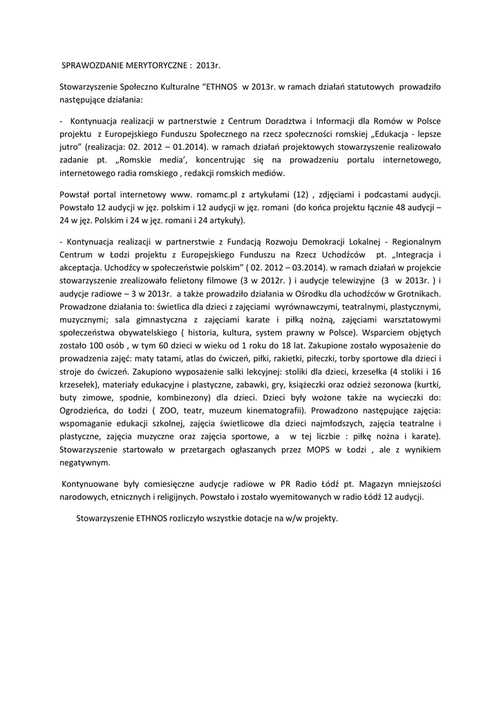 SPRAWOZDANIE MERYTORYCZNE : 2013r. Stowarzyszenie Społeczno Kulturalne “ETHNOS w 2013r. w ramach działań statutowych prowadziło następujące działania: - Kontynuacja realizacji w partnerstwie z Centrum Doradztwa i Informacji dla Romów w Polsce projektu z Europejskiego Funduszu Społecznego na rzecz społeczności romskiej „Edukacja - lepsze jutro” (realizacja: 02. 2012 – 01.2014). w ramach działań projektowych stowarzyszenie realizowało zadanie pt. „Romskie media’, koncentrując się na prowadzeniu portalu internetowego, internetowego radia romskiego , redakcji romskich mediów. Powstał portal internetowy www. romamc.pl z artykułami (12) , zdjęciami i podcastami audycji. Powstało 12 audycji w jęz. polskim i 12 audycji w jęz. romani (do końca projektu łącznie 48 audycji – 24 w jęz. Polskim i 24 w jęz. romani i 24 artykuły). - Kontynuacja realizacji w partnerstwie z Fundacją Rozwoju Demokracji Lokalnej - Regionalnym Centrum w Łodzi projektu z Europejskiego Funduszu na Rzecz Uchodźców pt. „Integracja i akceptacja. Uchodźcy w społeczeństwie polskim” ( 02. 2012 – 03.2014). w ramach działań w projekcie stowarzyszenie zrealizowało felietony filmowe (3 w 2012r. ) i audycje telewizyjne (3 w 2013r. ) i audycje radiowe – 3 w 2013r. a także prowadziło działania w Ośrodku dla uchodźców w Grotnikach. Prowadzone działania to: świetlica dla dzieci z zajęciami wyrównawczymi, teatralnymi, plastycznymi, muzycznymi; sala gimnastyczna z zajęciami karate i piłką nożną, zajęciami warsztatowymi społeczeństwa obywatelskiego ( historia, kultura, system prawny w Polsce). Wsparciem objętych zostało 100 osób , w tym 60 dzieci w wieku od 1 roku do 18 lat. Zakupione zostało wyposażenie do prowadzenia zajęć: maty tatami, atlas do ćwiczeń, piłki, rakietki, piłeczki, torby sportowe dla dzieci i stroje do ćwiczeń. Zakupiono wyposażenie salki lekcyjnej: stoliki dla dzieci, krzesełka (4 stoliki i 16 krzesełek), materiały edukacyjne i plastyczne, zabawki, gry, książeczki oraz odzież sezonowa (kurtki, buty zimowe, spodnie, kombinezony) dla dzieci. Dzieci były wożone także na wycieczki do: Ogrodzieńca, do Łodzi ( ZOO, teatr, muzeum kinematografii). Prowadzono następujące zajęcia: wspomaganie edukacji szkolnej, zajęcia świetlicowe dla dzieci najmłodszych, zajęcia teatralne i plastyczne, zajęcia muzyczne oraz zajęcia sportowe, a w tej liczbie : piłkę nożna i karate). Stowarzyszenie startowało w przetargach ogłaszanych przez MOPS w Łodzi , ale z wynikiem negatywnym. Kontynuowane były comiesięczne audycje radiowe w PR Radio Łódź pt. Magazyn mniejszości narodowych, etnicznych i religijnych. Powstało i zostało wyemitowanych w radio Łódź 12 audycji. Stowarzyszenie ETHNOS rozliczyło wszystkie dotacje na w/w projekty.