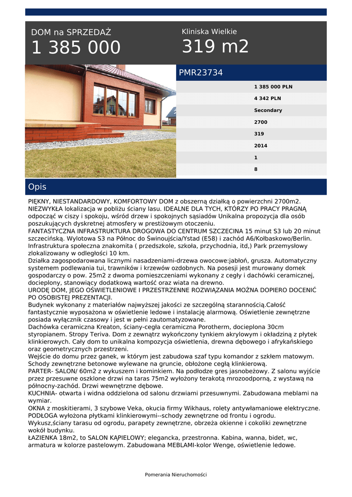 DOM na SPRZEDAŻ 1 385 000 Kliniska Wielkie 319 m2 PMR23734 1 385 000 PLN 4 342 PLN Secondary 2700 319 2014 1 8 Opis PIĘKNY, NIESTANDARDOWY, KOMFORTOWY DOM z obszerną działką o powierzchni 2700m2. NIEZWYKŁA lokalizacja w pobliżu ściany lasu. IDEALNE DLA TYCH, KTÓRZY PO PRACY PRAGNĄ odpocząć w ciszy i spokoju, wśród drzew i spokojnych sąsiadów Unikalna propozycja dla osób poszukujących dyskretnej atmosfery w prestiżowym otoczeniu. FANTASTYCZNA INFRASTRUKTURA DROGOWA DO CENTRUM SZCZECINA 15 minut S3 lub 20 minut szczecińską. Wylotowa S3 na Północ do Świnoujścia/Ystad (E58) i zachód A6/Kołbaskowo/Berlin. Infrastruktura społeczna znakomita ( przedszkole, szkoła, przychodnia, itd,) Park przemysłowy zlokalizowany w odległości 10 km. Działka zagospodarowana licznymi nasadzeniami-drzewa owocowe:jabłoń, grusza. Automatyczny systemem podlewania tui, trawników i krzewów ozdobnych. Na posesji jest murowany domek gospodarczy o pow. 25m2 z dwoma pomieszczeniami wykonany z cegły i dachówki ceramicznej, docieplony, stanowiący dodatkową wartość oraz wiata na drewno. URODĘ DOM, JEGO OŚWIETLENIOWE I PRZESTRZENNE ROZWIĄZANIA MOŻNA DOPIERO DOCENIĆ PO OSOBISTEJ PREZENTACJI. Budynek wykonany z materiałów najwyższej jakości ze szczególną starannością.Całość fantastycznie wyposażona w oświetlenie ledowe i instalację alarmową. Oświetlenie zewnętrzne posiada wyłącznik czasowy i jest w pełni zautomatyzowane. Dachówka ceramiczna Kreaton, ściany-cegła ceramiczna Porotherm, docieplona 30cm styropianem. Stropy Teriva. Dom z zewnątrz wykończony tynkiem akrylowym i okładziną z płytek klinkierowych. Cały dom to unikalna kompozycja oświetlenia, drewna dębowego i afrykańskiego oraz geometrycznych przestrzeni. Wejście do domu przez ganek, w którym jest zabudowa szaf typu komandor z szkłem matowym. Schody zewnętrzne betonowe wylewane na gruncie, obłożone cegłą klinkierową. PARTER- SALON/ 60m2 z wykuszem i kominkiem. Na podłodze gres jasnobeżowy. Z salonu wyjście przez przesuwne oszklone drzwi na taras 75m2 wyłożony terakotą mrozoodporną, z wystawą na północny-zachód. Drzwi wewnętrzne dębowe. KUCHNIA- otwarta i widna oddzielona od salonu drzwiami przesuwnymi. Zabudowana meblami na wymiar. OKNA z moskitierami, 3 szybowe Veka, okucia firmy Wikhaus, rolety antywłamaniowe elektryczne. PODŁOGA wyłożona płytkami klinkierowymi--schody zewnętrzne od frontu i ogrodu. Wykusz,ściany tarasu od ogrodu, parapety zewnętrzne, obrzeża okienne i cokoliki zewnętrzne wokół budynku. ŁAZIENKA 18m2, to SALON KĄPIELOWY; elegancka, przestronna. Kabina, wanna, bidet, wc, armatura w kolorze pastelowym. Zabudowana MEBLAMI-kolor Wenge, oświetlenie ledowe. Pomerania Nieruchomości POKÓJ16m2; sypialnia 42m2, zabudowa szaf typu komandor. Kotłownia 21m2-( piec Vaillant kondensacyjny z zasobnikiem), pralnia, garaż na 2 samochody z drzwiami Wiśniowski. Woda ciepła i CO - dwuobiegowy kondensacyjny piec Vaillant z zasobnikiem wody, instalacje w miedzi. Część komunikacyjna domu, łazienki, kuchnia, salon - ogrzewanie podłogowe, pozostałe pomieszczenia ogrzewane metodą tradycyjną - grzejniki płytowe. W salonie głównym zainstalowany biokominek, natomiast jest możliwość wymiany i zamontowania kominka klasycznego. Użycie energooszczędnych materiałów do budowy domu daje efekt niskich rachunków w okresie zimowymi za gaz - w granicach 500 zł za 2 miesiące. SCHODY Z DRZEWA AFRYKAŃSKIEGO PROWADZĄ na I PIĘTRO Tu mamy strefę ciszy i relaksu. SAUNA (sucha). Na tym poziomie korytarz ok 21m2 łączy poszczególne pokoje i łazienkę. Pokój z garderobą ok 16m2 z lekkimi skosami. POKOJE 18m2 i 2x pokoje po 8 i 12m2 (może być jeden 20m2) W tych pokojach okna Velux z roletami materiałowymi przeciwsłonecznymi i moskitierami. Trzecie pomieszczenie bez okien -właściciel używa jako kancelarię. ŁAZIENKA przestrzennie rozwiązana na zasadzie trójkąta, różnorodne podświetlenia. Wnęki z 4 rodzajami oświetleń. Zwieńczeniem jest SALON 40m2 z barkiem wykonanym granicie z blatem marmurowym. Ogrzewanie podłogowe na obu poziomach uzupełnione grzejnikami panelowymi. Czujniki przeciwgazowe, przeciwdymne i przeciwpożarowe. Dom z zewnątrz wykończony tynkiem akrylowym i okładziną z płytek klinkierowych. Dom monitorowany: 2x kamery zewnętrzne, 3x kamery wewnętrzne. W oknach na parterze domu rolety antywłamaniowe automatyczne. Podbitka wokół domu oświetlona- lampy ledowe 44 szt. Nieruchomość ekskluzywna i wygodna zarazem. Dom z uwagi na swoją wielkość- 319 m 2 i funkcjonalne rozwiązania przestrzenne , zachowuje podział na strefę dzienną, wypoczynkową i towarzyską, umożliwiając wygodne i niezależnie funkcjonowanie. Obszerny ogród o powierzchni 2639 m 2 z dużym tarasem o powierzchni 75 m 2 wyłożony terakotą mrozoodporną, z wystawą na północny-zachód zapewnia fantastyczny komfort wypoczynku i relaksu. Ogród jest tak usytuowany, że zabezpiecza poczucie osobistej intymności, wypielęgnowany, z przycinanymi na bieżąco nasadzeniami oraz w pełni zautomatyzowanym systemem nawadniania. Cała nieruchomość ogrodzona częściowo ozdobnym murem kamiennym oraz ogrodzeniem z metalowymi przęsłami na podmurówce betonowej wyłożonej cegłą klinkierową, brama wjazdowa i furtka metalowe kute. Lokalizacja domu w sąsiedztwie Lasku Pucickiego umożliwia uprawianie różnych form wypoczynku oraz codziennego korzystania z pięknych terenów spacerowych i rowerowych. W niedalekiej odległości zlokalizowana jest strzelnica w Pucicach oraz obszary wodne do uprawiania wędkarstwa czy sportów wodnych. Nieruchomość będąca przedmiotem sprzedaży składa się z działki o powierzchni 2639 m 2 zabudowana domem o powierzchni użytkowej 319 m 2 oraz budynkiem gospodarczym o powierzchni 25 m 2 . Zachęcam do uwagi ze względu na lokalizację, wysoki standard wykończenia i wszystkie walory pełnego komfortu. W związku 
