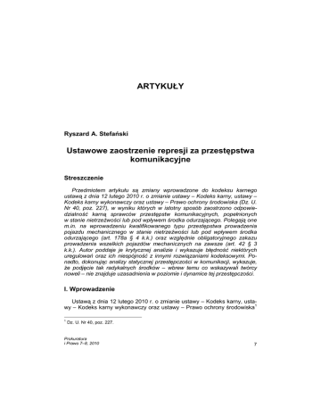 Ustawowe zaostrzenie represji… ARTYKUŁY Ryszard A. Stefański Ustawowe zaostrzenie represji za przestępstwa komunikacyjne Streszczenie Przedmiotem artykułu są zmiany wprowadzone do kodeksu karnego ustawą z dnia 12 lutego 2010 r. o zmianie ustawy – Kodeks karny, ustawy – Kodeks karny wykonawczy oraz ustawy – Prawo ochrony środowiska (Dz. U. Nr 40, poz. 227), w wyniku których w istotny sposób zaostrzono odpowiedzialność karną sprawców przestępstw komunikacyjnych, popełnionych w stanie nietrzeźwości lub pod wpływem środka odurzającego. Polegają one m.in. na wprowadzeniu kwalifikowanego typu przestępstwa prowadzenia pojazdu mechanicznego w stanie nietrzeźwości lub pod wpływem środka odurzającego (art. 178a § 4 k.k.) oraz względnie obligatoryjnego zakazu prowadzenia wszelkich pojazdów mechanicznych na zawsze (art. 42 § 3 k.k.). Autor poddaje je krytycznej analizie i wykazuje błędność niektórych uregulowań oraz ich niespójność z innymi rozwiązaniami kodeksowymi. Ponadto, dokonując analizy statycznej przestępczości w komunikacji, wykazuje, Ŝe podjęcie tak radykalnych środków – wbrew temu co wskazywali twórcy noweli – nie znajduje uzasadnienia w poziomie i dynamice tej przestępczości. I. Wprowadzenie Ustawą z dnia 12 lutego 2010 r. o zmianie ustawy – Kodeks karny, ustawy – Kodeks karny wykonawczy oraz ustawy – Prawo ochrony środowiska1 1 Dz. U. Nr 40, poz. 227. Prokuratura i Prawo 7–8, 2010 7 R. A. Stefański w istotny sposób zaostrzono odpowiedzialność karną sprawców przestępstw komunikacyjnych, popełnionych w stanie nietrzeźwości lub pod wpływem środka odurzającego2. Wydawać by się mogło, Ŝe zmiany te są godne pochwały, gdyŜ uczestnicy ruchu drogowego, a zwłaszcza kierujący pojazdami, znajdujący się w stanie nietrzeźwości lub pod wpływem środka odurzającego, stanowią powaŜne zagroŜenie dla bezpieczeństwa tego ruchu. Problem jednak w tym, Ŝe uczyniono to w sposób nieudolny, dekomponując kodeks karny, a ponadto wybrano narzędzie, które nie jest najlepsze dla osiągnięcia załoŜonego celu, jakim ma być poprawa bezpieczeństwa ruchu drogowego. Wprowadzone tą ustawą zmiany polegają na: − stworzeniu kwalifikowanego typu przestępstwa prowadzenia pojazdu mechanicznego w stanie nietrzeźwości lub pod wpływem środka odurzającego w razie wcześniejszego prawomocnego skazania za prowadzenie pojazdu mechanicznego w stanie nietrzeźwości lub pod wpływem środka odurzającego (art. 178a § 1), za przestępstwo określone w art. 173, art. 174, art. 177 lub art. 355 § 2 k.k., popełnione w stanie nietrzeźwości lub pod wpływem środka odurzającego lub popełnienia przestępstwa prowadzenia pojazdu w stanie nietrzeźwości lub pod wpływem środka odurzającego w okresie obowiązywania zakazu prowadzenia pojazdów mechanicznych orzeczonego za przestępstwo (art. 178a § 4 k.k.), − określeniu względnie obligatoryjnego zakazu prowadzenia wszelkich pojazdów mechanicznych na zawsze w stosunku do sprawcy będącego w stanie nietrzeźwości, pod wpływem środka odurzającego lub który zbiegł z miejsca zdarzenia w razie skazania za cięŜkie przestępstwo komunikacyjne, tj. którego następstwem jest śmierć człowieka lub cięŜki uszczerbek na jego zdrowiu (art. 42 § 3 k.k.), − rozszerzeniu moŜliwości orzeczenia nawiązki za przestępstwo określone w art. 173, art. 174, art. 177 lub art. 355 k.k. na wszystkich skazanych, a nie tylko prowadzących pojazdy mechaniczne, będących w stanie nietrzeźwości lub pod wpływem środka odurzającego lub którzy zbiegli z miejsca zdarzenia (art. 47 § 1 k.k.), − przewidzeniu moŜliwości orzeczenia świadczenia pienięŜnego takŜe na sprawców przestępstw stypizowanych w art. 179 i art. 180 k.k. (art. 49 § 2 k.k.), − wyłączeniu moŜliwości orzeczenia grzywny albo kary ograniczanie wolności, zamiast kary pozbawienia wolności, za przestępstwo z art. 178a § 4 k.k. (art. 58 § 4 k.k.), − ograniczeniu moŜliwości warunkowego zawieszenia wykonania kary pozbawienia wolności wobec sprawcy przestępstwa z art. 178 § 4 k.k. do szczególnie uzasadnionych wypadków (art. 69 § 4 k.k.). 2 8 Zmiany te wchodzą w Ŝycie z dniem 1 lipca 2010 r. (art. 9 tej ustawy). Prokuratura i Prawo 7–8, 2010 Ustawowe zaostrzenie represji… II. Nowy typ przestępstwa prowadzenia pojazdu mechanicznego w stanie nietrzeźwości lub pod wpływem środka odurzającego 1. Charakter prawny art. 178a § 4 k.k. W art. 178a § 4 k.k. został określony kwalifikowany typ przestępstwa prowadzenia pojazdu mechanicznego w stanie nietrzeźwości lub pod wpływem środka odurzającego Znamiona tego przestępstwa są zrealizowane wówczas, gdy sprawca popełnia przestępstwo prowadzenia pojazdu mechanicznego w stanie nietrzeźwości lub pod wpływem środka odurzającego: 1) będąc wcześniej prawomocnie skazany za przestępstwo: − prowadzenia pojazdu mechanicznego w stanie nietrzeźwości lub pod wpływem środka odurzającego (art. 178a § 1 k.k.), − sprowadzenia katastrofy w komunikacji (art. 173 k.k.), sprowadzenia niebezpieczeństwa katastrofy (art. 174 k.k.), spowodowania wypadku w komunikacji (art. 177 k.k.) lub spowodowania cięŜkiego wojskowego wypadku w komunikacji (art. 355 § 2 k.k.) popełnionego w stanie nietrzeźwości lub pod wpływem środka odurzającego; 2) w okresie obowiązywania zakazu prowadzenia pojazdów mechanicznych orzeczonego za przestępstwo. Konstrukcja tego przepisu rodzi wątpliwość co do tego, czy określa kwalifikowany typ przestępstwa, czy zawiera okoliczności stanowiące o nadzwyczajnym obostrzeniu kary. Przed udzieleniem odpowiedzi na to pytanie naleŜy wskazać cechu obu tych instytucji. Typy kwalifikowane są tworzone przez dodanie do znamion typu podstawowego dodatkowego znamienia, które moŜe dotyczyć skutku przestępstwa (tzw. przestępstwa kwalifikowane przez następstwo) albo innej okoliczności (tzw. pr