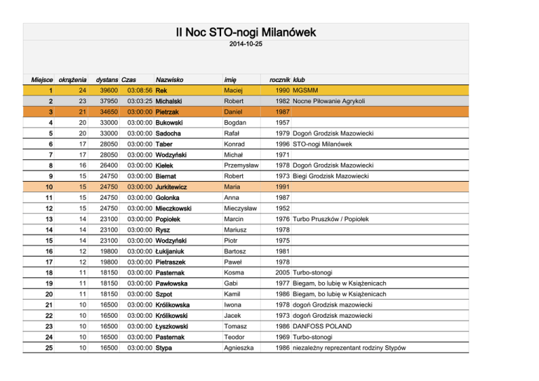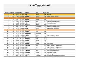 II Noc STO-nogi Milanówek 2014-10-25 Miejsce okrążenia dystans Czas Nazwisko imię rocznik klub 1 24 39600 03:08:56 Rek Maciej 1990 MGSMM 2 23 37950 03:03:25 Michalski Robert 1982 Nocne Piłowanie Agrykoli 3 21 34650 03:00:00 Pietrzak Daniel 1987 4 20 33000 03:00:00 Bukowski Bogdan 1957 5 20 33000 03:00:00 Sadocha Rafał 1979 Dogoń Grodzisk Mazowiecki 6 17 28050 03:00:00 Taber Konrad 1996 STO-nogi Milanówek 7 17 28050 03:00:00 Wodzyński Michał 1971 8 16 26400 03:00:00 Kiełek Przemysław 1978 Dogoń Grodzisk Mazowiecki 9 15 24750 03:00:00 Biernat Robert 1973 Biegi Grodzisk Mazowiecki 10 15 24750 03:00:00 Jurkitewicz Maria 1991 11 15 24750 03:00:00 Golonka Anna 1987 12 15 24750 03:00:00 Mieczkowski Mieczysław 1952 13 14 23100 03:00:00 Popiołek Marcin 1976 Turbo Pruszków / Popiołek 14 14 23100 03:00:00 Rysz Mariusz 1978 15 14 23100 03:00:00 Wodzyński Piotr 1975 16 12 19800 03:00:00 Łukijaniuk Bartosz 1981 17 12 19800 03:00:00 Pietraszek Paweł 1978 18 11 18150 03:00:00 Pasternak Kosma 2005 Turbo-stonogi 19 11 18150 03:00:00 Pawłowska Gabi 1977 Biegam, bo lubię w Książenicach 20 11 18150 03:00:00 Szpot Kamil 1986 Biegam, bo lubię w Książenicach 21 10 16500 03:00:00 Królikowska Iwona 1978 dogoń Grodzisk mazowiecki 22 10 16500 03:00:00 Królikowski Jacek 1973 dogoń Grodzisk mazowiecki 23 10 16500 03:00:00 Łyszkowski Tomasz 1986 DANFOSS POLAND 24 10 16500 03:00:00 Pasternak Teodor 1969 Turbo-stonogi 25 10 16500 03:00:00 Stypa Agnieszka 1986 niezależny reprezentant rodziny Stypów 26 10 16500 03:00:00 Warzecha Agnieszka 1981 Biegam na Tarchominie 27 10 16500 03:00:00 Warzecha Jolka 1984 Biegam na Tarchominie 28 10 16500 03:00:00 Zdziarski Piotr 1979 Dogoń Grodzisk Mazowiecki 29 9 14850 03:00:00 Helbin Katarzyna 1974 30 9 14850 03:00:00 Kmieć Andrzej 1978 Turbo Pruszków 31 9 14850 03:00:00 Kotkowski Piotr 1973 Geoblog Running Team 32 9 14850 03:00:00 Opaliński Grzegorz 1988 Danfoss Poland 33 8 13200 03:00:00 Golonka Dawid 2002 34 8 13200 03:00:00 Kowalczyk Juliusz 1990 35 8 13200 03:00:00 Łada Mariusz 1977 Drużynowa Liga Biegowa PKO Banku Polskiego 36 8 13200 03:00:00 Popiołek Miłosz 2005 Turbo Pruszków / Popiołki 37 8 13200 03:00:00 Sycan Krzysztof 1972 Drużynowa Liga Biegowa PKO Banku Polskiego 38 8 13200 03:00:00 Taber Jerzy 1966 STO-nogi Milanówek 39 7 11550 03:00:00 Andrzejewska Hania 2000 40 7 11550 03:00:00 Janasik Zuzia 2002 STO-nogi Milanówek 41 7 11550 03:00:00 Janasik Magda 2005 sto nogi janasiki 42 7 11550 03:00:00 Łada Marek 2008 43 7 11550 03:00:00 Newbery Kamilla 1969 44 7 11550 03:00:00 Popiołek Igor 2002 Turbo Pruszków 45 7 11550 03:00:00 Zagajewska Ewa 1983 46 6 9900 03:00:00 Łada Mariola 1977 47 6 9900 03:00:00 Prędkopowicz Daniel 1979 Dogoń/ Asraz Adventure Team/ Stowarzyszenie Europa i My 48 5 8250 03:00:00 Dulnik Marcin 49 5 8250 03:00:00 Mills Mike 1958 50 5 8250 03:00:00 Nowocień Jacek 1959 GLKS Nadarzyn 51 5 8250 03:00:00 Pietraszek Joanna 1978 52 4 6600 03:00:00 Duńska-Andrzejewska Ewa 1972 53 4 6600 03:00:00 Popiołek Katarzyna 1973 Turbo Pruszków / Popiołki 54 4 6600 03:00:00 Rytka Ewa 1973 55 4 6600 03:00:00 Ziubińska Marta 1981 56 3 4950 03:00:00 Łada Maciej 2006 57 3 4950 03:00:00 Żyto Agata 1974 The Żytos family 58 3 4950 03:00:00 Żyto Borys 2001 The Żytos family 59 2 3300 03:00:00 Dulnik Grzegorz 60 2 3300 03:00:00 Kmieć Zuzia 2002 Turbo Pruszków 61 2 3300 03:00:00 Żyto Maciej 1974 The Żytos family 62 1 1650 03:00:00 Łukijaniuk Ala 2010