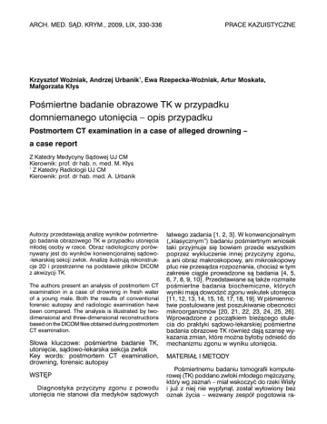 ARCH. MED. SĄD. KRYM., 2009, LIX, 330-336 PRACE KAZUISTYCZNE Krzysztof Woźniak, Andrzej Urbanik1, Ewa Rzepecka-Woźniak, Artur Moskała, Małgorzata Kłys Pośmiertne badanie obrazowe TK w przypadku domniemanego utonięcia – opis przypadku Postmortem CT examination in a case of alleged drowning – a case report Z Katedry Medycyny Sądowej UJ CM Kierownik: prof. dr hab. n. med. M. Kłys 1 Z Katedry Radiologii UJ CM Kierownik: prof. dr hab. med. A. Urbanik Autorzy przedstawiają analizę wyników pośmiertnego badania obrazowego TK w przypadku utonięcia młodej osoby w rzece. Obraz radiologiczny porównywany jest do wyników konwencjonalnej sądowo-lekarskiej sekcji zwłok. Analizę ilustrują rekonstrukcje 2D i przestrzenne na podstawie plików DICOM z akwizycji TK. The authors present an analysis of postmortem CT examination in a case of drowning in fresh water of a young male. both the results of conventional forensic autopsy and radiologic examination have been compared. The analysis is illustrated by twodimensional and three-dimensional reconstructions based on the DICOM files obtained during postmortem CT examination. Słowa kluczowe: pośmiertne badanie TK, utonięcie, sądowo-lekarska sekcja zwłok Key words: postmortem CT examination, drowning, forensic autopsy WSTęP Diagnostyka przyczyny zgonu z powodu utonięcia nie stanowi dla medyków sądowych łatwego zadania [1, 2, 3]. W konwencjonalnym („klasycznym”) badaniu pośmiertnym wniosek taki przyjmuje się bowiem przede wszystkim poprzez wykluczenie innej przyczyny zgonu, a ani obraz makroskopowy, ani mikroskopowy płuc nie przesądza rozpoznania, chociaż w tym zakresie ciągle prowadzone są badania [4, 5, 6, 7, 8, 9, 10]. Przedstawiane są także rozmaite pośmiertne badania biochemiczne, których wyniki mają dowodzić zgonu wskutek utonięcia [11, 12, 13, 14, 15, 16, 17, 18, 19]. W piśmiennictwie postulowane jest poszukiwanie obecności mikroorganizmów [20, 21, 22, 23, 24, 25, 26]. Wprowadzone z początkiem bieżącego stulecia do praktyki sądowo-lekarskiej pośmiertne badania obrazowe TK również dają szansę wykazania zmian, które można byłoby odnieść do mechanizmu zgonu w wyniku utonięcia. MATERIAł I METODY Pośmiertnemu badaniu tomografii komputerowej (TK) poddano zwłoki młodego mężczyzny, który wg zeznań – miał wskoczyć do rzeki Wisły i już z niej nie wypłynął, został wyłowiony bez oznak życia – wezwany zespół pogotowia ra- Nr 4 POśMIERTNE bADANIE ObRAZOWE TK tunkowego prowadził akcję resuscytacyjną. Na pośmiertne badanie TK przed sądowo-lekarską sekcją zwłok uzyskano zgodę właściwego prokuratora. Zwłoki przed transportem do pracowni diagnostyki obrazowej zostały w typowy sposób zabezpieczone w dwóch specjalnie przygotowanych, szczelnych foliowych workach. Wykonano badanie TK głowy i szyi z grubością warstwy 0,75 mm oraz tułowia z grubością warstwy 1,5 mm. Pliki wynikowe DICOM zapisane na płycie analizowane były z zastosowaniem programu Osirix. Uzyskane wyniki porównano z obrazem typowego pośmiertnego badania sądowo-lekarskiego: sekcji zwłok oraz badania histopatologicznego. 331 WYNIKI bADAń Obraz TK analizowano szczególnie pod kątem: 1. obecności piany w drogach oddechowych – w tchawicy widoczna jest treść, która została zidentyfikowana w konwencjonalnym badaniu sekcyjnym, jako odpowiadająca treści żołądkowej (ryc. 1 a, b) 2. obecności płynu w zatokach obocznych nosa – wykazano obecność we wszystkich zatokach, niejednorodna wartość jednostek Hounsfielda (HU) od około -10 do około 45 (ryc. 2 a, b) Ryc. 1 a, b. Treść obca w świetle tchawicy (strzałki). Fig. 1 a, b. Foreign fluid in the lumen of the trachea (arrows). Ryc. 2. Poziomy płynu w zatokach obocznych nosa: a) zatoki czołowe, b) zatoki szczękowe i klinowe. Fig. 2. Fluid in the paranasal sinuses: a. the frontal sinuses, b. the maxillary and sphenoid sinuses. 332 Krzysztof Woźniak Nr 4 3. zawartości płynu w komórkach sutkowych – stwierdzono ślad obecności płynu (ryc. 3) wykazywały niejednorodnie niższy wynik HU (ryc. 4) Ryc. 3. ślad obecności płynu w komórkach sutkowatych (strzałka). Fig. 3. Traces of fluid in the mastoid cells (an arrow). Ryc. 4. Jamy serca wypełnione krwią – słabo zaznaczona różnica w jednostkach Hounsfielda. Fig. 4. blood in the chambers of the heart – slightly differrent HU between the right and left side. 4. obecności krwi w jamach serca i ewentualnych różnic w parametrach HU – wynik niejednoznaczny – jamy serca lewego 5. obrazu płuc – ich objętości w klatce piersiowej, jak i powietrzności – wykazano powiększenie płuc z cechami obrzęku (ryc. 5 a, b, c, d, ryc. 6 a, b, c, d) Ryc. 5 a-d. Rekonstrukcje 2D klatki piersiowej – przekroje poprzeczne. Fig. 5 a-d. 2D reconstructions of the thorax – distended lungs. Nr 4 POśMIERTNE bADANIE ObRAZOWE TK 333 Ryc. 6. Rekonstrukcje przestrzenne płuc na podstawie pośmiertnego badania TK: a) widok od przodu, b) widok od tyłu, c, d) przestrzenie powietrzne. Fig. 6. Three-dimensional reconstructions of the lungs based on postmortem CT: a) the anterior aspect, b) the posterior aspect, c, d) the air spaces. 6. obecności treści żołądkowej – wykazano poziom płynu w żołądku (ryc. 7) 7. wreszcie – wobec danych mogących wskazywać na doznanie urazu odcinka szyjnego kręgosłupa – analizę stanu odcinka szyjnego kręgosłupa – bez zmian (ryc. 8). Podczas „klasycznej” sekcji zwłok stwierdzono wyraźne powiększenie płuc z cechami ostrego rozdęcia i obrzęku (ryc. 9), przekrwienie narządów wewnętrznych, delikatne różowawe podbarwienie błony wewnętrznej aorty bez cech autolizy zwłok. W badaniu histopatologicznym płuc – ich ostre rozdęcie i obrzęk, w nielicznych oskrzelach treść obcą (ryc. 10 a, b, c). 334 Krzysztof Woźniak Ryc. 7. Przekrój poprzeczny tułowia – poziom płynu w żołądku (strzałka). Fig. 7. 2D reconstruction o