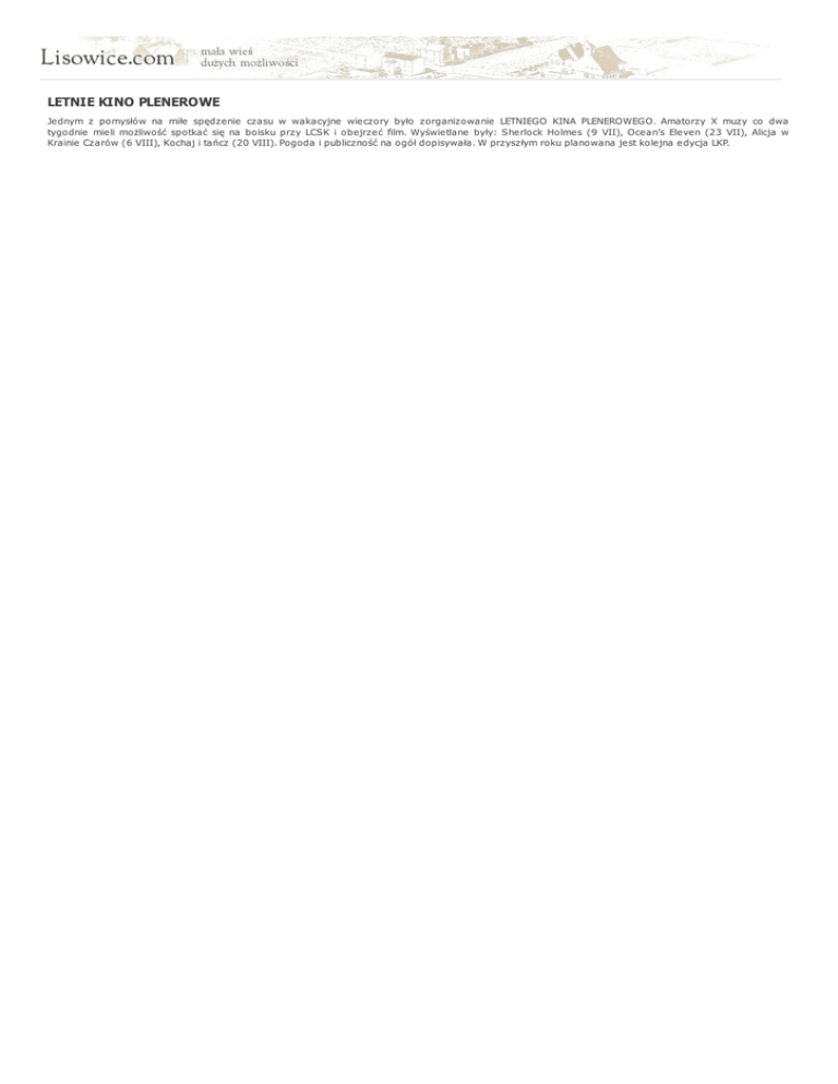 LETNIE KINO PLENEROWE Jednym z pomysłów na miłe spędzenie czasu w wakacyjne wieczory było zorganizowanie LETNIEGO KINA PLENEROWEGO. Amatorzy X muzy co dwa tygodnie mieli możliwość spotkać się na boisku przy LCSK i obejrzeć film. Wyświetlane były: Sherlock Holmes (9 VII), Ocean’s Eleven (23 VII), Alicja w Krainie Czarów (6 VIII), Kochaj i tańcz (20 VIII). Pogoda i publiczność na ogół dopisywała. W przyszłym roku planowana jest kolejna edycja LKP.