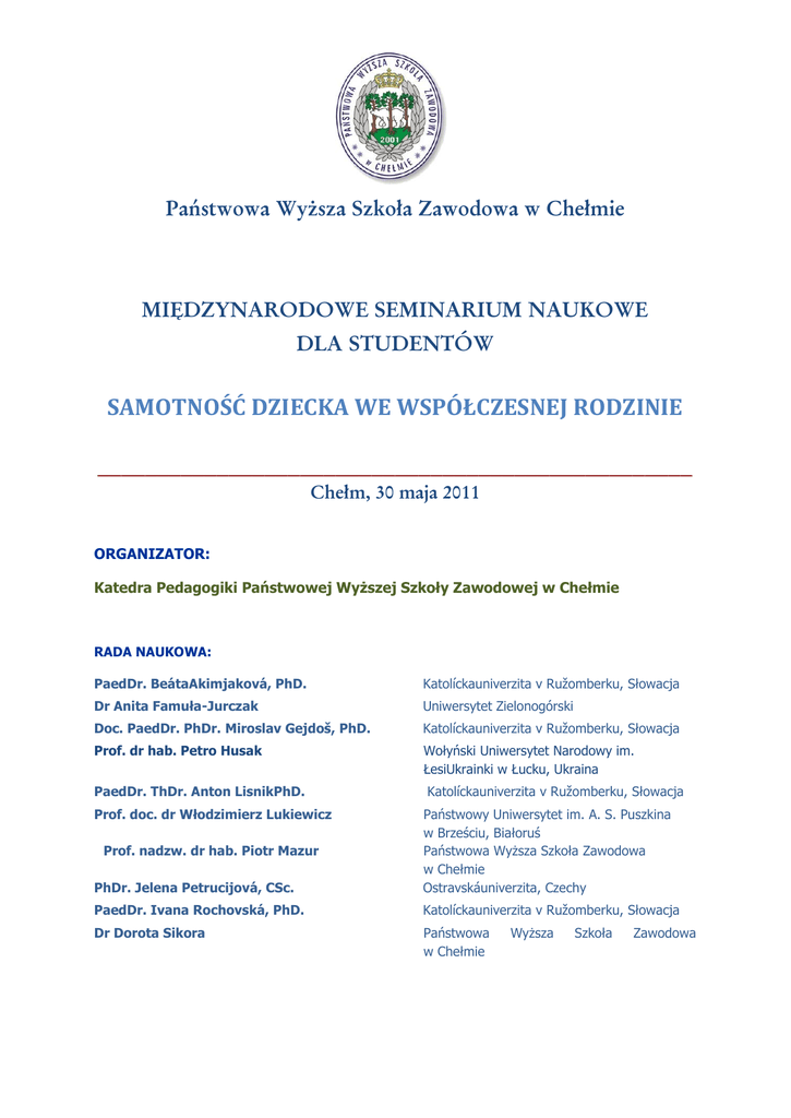 Państwowa Wyższa Szkoła Zawodowa w Chełmie MIĘDZYNARODOWE SEMINARIUM NAUKOWE DLA STUDENTÓW SAMOTNOŚĆ DZIECKA WE WSPÓŁCZESNEJ RODZINIE __________________________________________________ Chełm, 30 maja 2011 ORGANIZATOR: Katedra Pedagogiki Państwowej Wyższej Szkoły Zawodowej w Chełmie RADA NAUKOWA: PaedDr. BeátaAkimjaková, PhD. Katolíckauniverzita v Ružomberku, Słowacja Dr Anita Famuła-Jurczak Uniwersytet Zielonogórski Doc. PaedDr. PhDr. Miroslav Gejdoš, PhD. Katolíckauniverzita v Ružomberku, Słowacja Prof. dr hab. Petro Husak Wołyński Uniwersytet Narodowy im. ŁesiUkrainki w Łucku, Ukraina PaedDr. ThDr. Anton LisnikPhD. Katolíckauniverzita v Ružomberku, Słowacja Prof. doc. dr Włodzimierz Lukiewicz PhDr. Jelena Petrucijová, CSc. Państwowy Uniwersytet im. A. S. Puszkina w Brześciu, Białoruś Państwowa Wyższa Szkoła Zawodowa w Chełmie Ostravskáuniverzita, Czechy PaedDr. Ivana Rochovská, PhD. Katolíckauniverzita v Ružomberku, Słowacja Dr Dorota Sikora Państwowa w Chełmie Prof. nadzw. dr hab. Piotr Mazur Wyższa Szkoła Zawodowa KOMITET ORGANIZACYJNY: Prof. nadzw. dr hab. Piotr Mazur Dr Dorota Sikora Mgr Augustyn Okoński Mgr Iwona Oleksa Mgr Agata Szabała-Walczuk PROGRAM SEMINARIUM: 11.30 - 12.00 Uroczyste otwarcie seminarium Prof. nadzw. dr hab. Piotr Mazur 12.00 – 14.00 Obrady plenarne Sylwia Jóźwiak, Karolina Słomka(Państwowa Wyższa Szkoła Zawodowa w Chełmie) Poczucie osamotnienia dziecka we współczesnej rodzinie – zarys problematyki Ewelina Kloc, Jagoda Matwiejczuk(Państwowa Wyższa Szkoła Zawodowa w Chełmie) Poczucie osamotnienia dziecka z rodziny dysfunkcyjnej przebywającego w placówce opieki zastępczej PaedDr. Anna Dudová(Katolíckauniverzita v Ružomberku) Dieťa a pracovnázaneprázdnenosťrodičov Aleksandra Melcher (Państwowa Wyższa Szkoła Zawodowa w Chełmie) Poczucie osamotnienia dziecka w sytuacji migracji zarobkowej rodziców ZuzanaBohunčáková(Katolíckauniverzita v Ružomberku) Samotność dziecka w rodzinie dotkniętnej bezrobociem Ing. Mária Migrová, PhDr. Slavomíra Bellová(Katolíckauniverzita v Ružomberku) Osamelosťdieťaťaspôsobená alkoholizmom v kontextesúčasnejrodiny Ing. ZuzanaBrčiaková(Katolíckauniverzita v Ružomberku) Osamelosťdieťaťa v neúplnejrodine PhDr. RenátaKudriková,Mgr. Marcela Duľová(Katolíckauniverzita v Ružomberku) Osamotnienie dziecka w rodzinie niepełnej Ing. AlžbetaBaštová(Katolíckauniverzita v Ružomberku) Agresívnesprávaniesadetí z neúplnýchrodín Anżelika Danilecka, JulijaTrafimava(Państwowy Uniwersytet w Brześciu) One-Child Family Kid’s Loneliness 14.00 – 14.15 Podsumowanie obrad