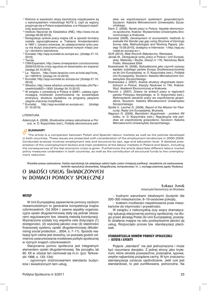5 6 7 8 9 10 11 12 13 14 15 Różnice w wysokości stopy bezrobocia rozpatrywane są z wykorzystaniem metodologii NUTS 2, czyli za regiony przyjmuje się w Polsce województwa, a w Hiszpanii wspólnoty autonomiczne. Instituto Nacional de Estadistica (INE), http://www.ine.es [dostęp 09.09.2010]. Deregulacja rynków pracy krajów UE w sposób formalny została zapoczątkowana w Traktacie Amsterdamskim w 1997 r. Uznano wówczas, że uelastycznienie rynku pracy ma służyć znacznemu przyrostowi nowych miejsc pracy i obniżeniu bezrobocia. Eurostat, http://epp.eurostat.ec.europa.eu/, [dostęp 21.10. 2010]. Tamże. CNN Expansión, http://www.cnnexpansion.com/economia/ 2009/03/03/la-crisis-agudiza-el-desempleo-en-espana/ [dostęp 24.10.2010]. La Nación, http://www.lanacion.com.ar/nota.asp?nota_ id=1087915/ [dostęp 24.10.2010]. Eurostat, http://epp.eurostat.ec.europa.eu/ [dostęp 21.10. 2010]. Wharton, http://www.wharton.universia.net/index.cfm?fa= viewArticle&ID=1830/ [dostęp 24.10.2010]. W związku z uchwaloną w Polsce w 2009 r. ustawą ograniczającą możliwość przechodzenia na wcześniejsze emerytury, struktura wydatków na programy pasywne ulegnie znacznej modyfikacji. Eurostat, http://epp.eurostat.ec.europa.eu/, [dostęp 21.10.2010]. LITERATURA Adamczyk A. (2008), Strukturalne zmiany zatrudnienia w Polsce, w: D. Kopycińska (red.), Polityka ekonomiczna pań- stwa we współczesnych systemach gospodarczych, Szczecin: Katedra Mikroekonomii Uniwersytetu Szczecińskiego. Dach Z. (2008), Rynek pracy w Polsce. Aspekty ekonomiczno-społeczne, Kraków: Wydawnictwo Uniwersytetu Ekonomicznego w Krakowie. Eurostat (2009), Development of econometric methods to evaluate the Gender pay gap using Structure of Earnings Survey data, Methodologies and Working Papers, [dostęp 10.09.2010], dostępny w Internecie: <http://epp.eu rostat.ec.europa.eu>. GUS (2010), Mały Rocznik Statystyczny, Warszawa. Jerzak M., Deregulacja rynku pracy w Polsce i Unii Europejskiej, Materiały i Studia, Zeszyt nr 176, Narodowy Bank Polski, Warszawa 2004. Kosiedowski W. (2008), Wykształcenie jako czynnik rozwoju kapitału ludzkiego państw Europy Środkowowschodniej na tle Unii Europejskiej, w: D. Kopycińska (red.), Polityka Unii Europejskiej, Szczecin: Katedra Mikroekonomii Uniwersytetu Szczecińskiego. Kostrzewska J. (2007), Analiza struktury długotrwale bezrobotnych w Polsce, Zeszyty Naukowe nr 740, Kraków: Wyd. Akademii Ekonomicznej w Krakowie. Piecuch J. (2007), Zmiany na rynkach pracy w regionach państw Półwyspu Iberyjskiego, w: D. Kopycińska (red.), Wykorzystanie zasobów pracy we współczesnej gospodarce, Szczecin: Katedra Mikroekonomii Uniwersytetu Szczecińskiego. Spidla V., Larcher G. (2008), Report of the Mission for Flexicurity, Rada Unii Europejskiej, Bruksela. Węgrzyn G. (2006), Bezrobotni długotrwale – problem XXI wieku, w: D. Kopycińska (red.), Regulacyjna rola państwa we współczesnej gospodarce, Szczecin: Katedra Mikroekonomii Uniwersytetu Szczecińskiego. SUMMARY The article is a comparison between Polish and Spanish labour markets as well as the policies developed in both countries. These issues are presented with consideration of the employment tendencies in 2000–2009. Conducted analysis involves employment rate and structure by sex, age and education level. A detailed presentation of the unemployment factors and main problems of the labour markets in Poland and Spain, including the consequences of the last economic crisis is given. Furthermore the article describes different labour market policy measures undertaken in both countries, as well as the contribution of structural funds to the unemployment reduction. Wszelkie prawa zastrzeżone. Każda reprodukcja lub adaptacja całości bądx cześci niniejszej publikacji, niezależnie od zastosowanej techniki reprodukcji (drukarskiej, fotograficznej, komputerowej i in. ), wymaga pisemnej zgody Wydawcy O JAKOŚCI USŁUG ŚWIADCZONYCH W DOMACH POMOCY SPOŁECZNEJ Łukasz Jurek Uniwersytet Ekonomiczny we Wrocławiu WSTĘP W Unii Europejskiej zapewnienie pomocy osobom niesamodzielnym to generalnie kompetencja krajów członkowskich. Od 2004 r. pewne aspekty organizacyjne opieki długoterminowej stały się jednak obszarami regulowanymi tzw. otwartą metodą koordynacji. Wyznaczone zostały trzy wspólne cele dotyczące (1) dostępności, (2) wysokiej jakości oraz (3) stabilności finansowej systemu opieki długoterminowej (Modernising social protection... 2004, s. 7–11). Sposób realizacji tych celów jest dowolny, co pozwala godzić odmienne uwarunkowania modelowe polityki społecznej w różnych krajach członkowskich. Stacjonarna pomoc społeczna jest integralnym elementem opieki długoterminowej. Na początku lat 90. XX w. obszar ten cechował się m.in. (por. Tarkowski 1998, s. 133–134): – ogromnym zróżnicowaniem standardu budynków i świadczonych tam usług, Polityka Społeczna nr 3/2011 – trudnymi warunkami lokalowymi (budynki dla 200–300 mieszkańców; 6–10-osobowe pokoje), – brakiem możliwości respektowania praw mieszkańców do intymności i prywatności. W związku z niekorzystną (czy wręcz dramatyczną) sytuacją stacjonarnej pomocy społecznej, na długo przed akcesją Polski do Unii Europejskiej, powzięto działania mające na celu podwyższenie jakości jej usług. Rozpoczęto proces tzw. standaryzacji placówek. STANDARYZACJA DOMÓW POMOCY SPOŁECZNEJ – ISTOTA I EFEKTY Pojęcie „standard” nie jest jednoznaczne i może być rozumiane dwojako. Z jednej strony jako kryterium, które określa powszechne, przeciętne, typowe, zwykle najbardziej pożądane cechy. W tym znaczeniu standaryzacja oznacza ujednolicanie. Jeśli coś jest standardowe, to jest zunifikowane, jednorodne. Na 23 Wszelkie prawa zastrzeżone. Każda reprodukcja lub adaptacja całości bądx cześci niniejszej publikacji, niezależnie od zastosowanej techniki reprodukcji (drukarskiej, fotograficznej, komputerowej i in. ), wymaga pis