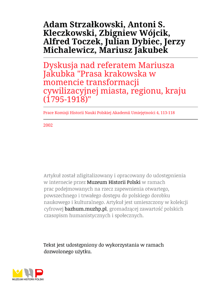 Adam Strzałkowski, Antoni S. Kleczkowski, Zbigniew Wójcik, Alfred Toczek, Julian Dybiec, Jerzy Michalewicz, Mariusz Jakubek Dyskusja nad referatem Mariusza Jakubka "Prasa krakowska w momencie transformacji cywilizacyjnej miasta, regionu, kraju (1795-1918)" Prace Komisji Historii Nauki Polskiej Akademii Umiejętności 4, 113-118 2002 Prasa krakowska w momencie transformacji cywilizacyjnej miasta, regionu, kraju (1795-1918) H3 W wyniku I i III zaboru ziem polskich wprowadzono w Galicji i Kra kowie cenzurę na wzór austriacki. Po okresie przemian społecznych i po litycznych od 1848 r. nie spotykamy terminu cenzura. A przecież cenzura, poza krótkim okresem od marca do listopada 1848 r., kiedy to faktycznie nie działała, nie została zlikwidowana - aż do końca istnienia Państwa Austriacko-W ęgierskiego pozostawała aktywną częścią systemu władzy. Kontrola i cenzura wydawnictw periodycznych i gazet w Austrii nadal ciążyła nad prasą, lecz realizowana była w zgodzie z przepisami prawa prasowego i kodeksu karnego. W procesie powstawania i rozpowszechniania prasy najważniejszymi elementami są ludzie - redaktorzy naczelni, odpowiedzialni oraz wydawcy i nakładcy - osoby wchodzące w skład nowej grupy zawodowej dzien nikarzy, której początki sięgają połowy XIX stulecia. Cechą charaktery styczną tej zbiorowości jest szerokość ich zainteresowań i pól działania. Często spotykane jest wśród nich łączenie pracy naukowej z dziennikarską. Od końca lat dziewięćdziesiątych XIX w. wzrasta udział kobiet w tym środowisku. Kraków należał do największych ośrodków prasy polskiej w okresie zaborów. To tu drukowano tak znane i czytane nie tylko na terenie Galicji pisma, jak „Nowa Reform a", „Czas" czy „Głos Narodu". Nieustanny wzrost liczby tytułów prasowych, nakładu gazet i czasopism, różnorodność produkcji wydawniczej oraz wykształcenie się silnej grupy zawodowej dziennikarzy potwierdzają siłę oddziaływania ośrodka krakow skiego, w tym okresie tak istotnym dla dziejów Polski. A więc Kraków to nie tylko nekropolia królów Polski, miejsce ceremonii - od pogrzebowych po jubileuszowe - ale także obszar najpełniej rozwijających się wartości intelektualnych, realizowanych i wdrażanych dzięki prasie, a tak ważnych w momencie odrodzenia się Polski. Dyskusja nad referatem Mariusza Jakubka „Prasa krakowska w momencie transformacji cywilizacyjnej miasta, regionu, kraju (1795-1918)" Adam Strzałkowski Imponująca jest praca wykonana przez naszego referenta i imponująca była też kondycja prasy krakowskiej w tym trudnym przecież okresie rozbiorów. Wśród danych, które zgromadził Pan Jakubek, brakuje mi jednak pew nych dość istotnych informacji. Pierwsza dotyczy języka, w jakim wyda wane były różne tytuły prasowe, a wiadomo, że rozmaitość tych języków była dość duża. Język tytułu czasopisma niewiele tu mówi, gdyż wiadomo, 114 MARIUSZ JAKUBEK że na przykład czasopisma żydowskie miały często tytuły hebrajskie, a wydawane były w jidisz czy też po polsku. Sądzę, że jest to informacja łatwa do uzupełnienia. Inne dotyczą objętości i wysokości nakładu cza sopisma. Tu sądzę, że nie będzie tak prosto z pozyskaniem informacji, bo pewnie nie jest ona tak łatwo dostępna, a i dane te zmieniały się zapewne w czasie wydawania czasopisma. Tam, gdzie to jest możliwe, byłoby jednak cenne uzupełnienie tych wiadomości. Innymi pożądanymi informacjami byłyby wiadomości o ekonomiczno-finansowej stronie wy dawania czasopism. Przedstawił nam Pan wśród różnych czasopism także czasopisma na ukowe. A jak wyglądała wówczas w Krakowie popularyzacja wiedzy? Były takie pisma? I czym się głównie zajmowały? M ariusz Jakubek Nie umieszczałem rzeczywiście informacji o języku czasopisma, nie jest to jednak trudne i w publikacji dane te będą podane. N atom iast nakład czasopisma jest bardzo trudny do ustalenia. Archiwa redakcyjne praktycznie w ogóle nie istnieją, zostały zniszczone, na przy kład w Archiwum na Siennej są tylko materiały dotyczące jednego tytułu prasowego „Kultury Polskiej". Niektóre jednak czasopisma podawały w ysokość nakładu i te inform acje w swych zestawieniach uwzględnia łem. Na przykład na początku XX w. „Czas" m iał nakład 7 000 eg zem plarzy. Jest jeszcze jeden aspekt tego problemu. Taka informacja o nakładzie zwykle podawana była na zasadzie reklam y i trudno jest ustalić, czy była to rzeczyw ista wielkość nakładu. Innym czynnikiem wpływającym na rzetelność tych danych był fakt, że od wielkości nakładu płacono podatki. Objętość, poszczególnych numerów czasopisma zmieniała się w czasie. „C zas" na przykład zaczynał od 4 stron, potem było 6 i 8. Tę informację bardzo trudno byłoby zatem ująć. Czasopisma miały też różne dodatki o zmieniającej się objętości. Trudno to wszystko uchwycić w opracowaniu 0 charakterze statystycznym. Sprawy ekonomiczne. Brak kapitału był przeważnie powodem, że cza sopism a ukazywały się w krótkim stosunkowo przeciągu czasu. Warto zauważyć, że pisma, które były wspierane przez Kościół, Uniwersytet czy państw o (jak na przykład pisma urzędowe), ukazywały się w długich okresach czasu, bo nie m usiały się martwić o napływ środków. Pomagała reklam a, ale dopiero w drugiej połowie XIX w. zaczęła mieć ona znaczenie. Również niekiedy pom agały wpływy od sponsorów. W przypadku „Czasu" 1 „R oli" sponsorami były stronnictwa prawicy narodowej, przekazujące dość znaczne środki finansowe. Prasa krakowska w momencie transformacji cywilizacyjnej miasta, regionu, kraju (1795-1918) 115 Pisma popularyzujące wiedzę były dwóch rodzajów. Wydawane na przykład przez Kościół uczyły czytać, korzystać z książek, z prasy. Druga kategoria to pisma popularyzujące osiągnięcia nauki. Naliczyłem może 5 lub 6 takich tytułów i umieściłem je w katego
